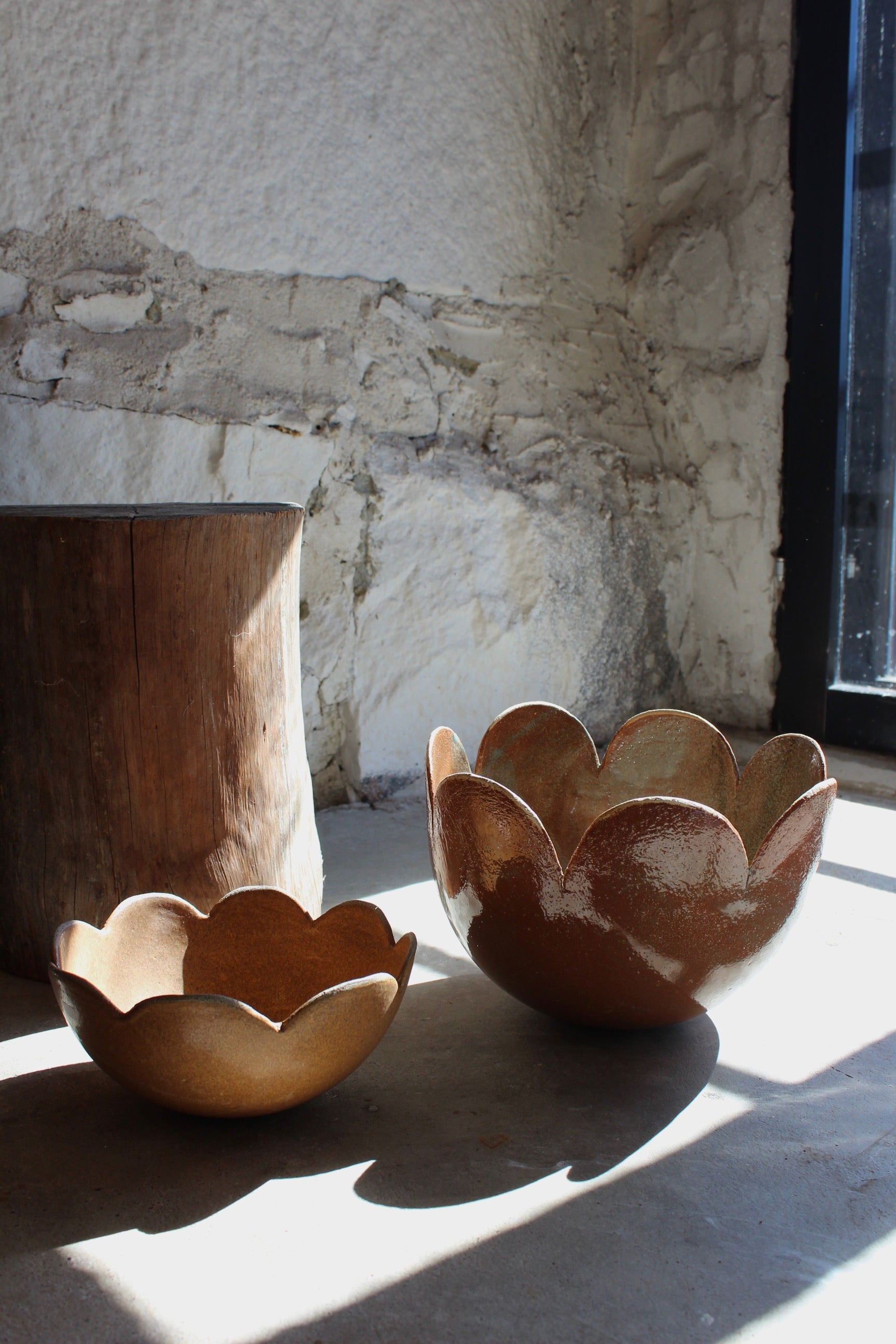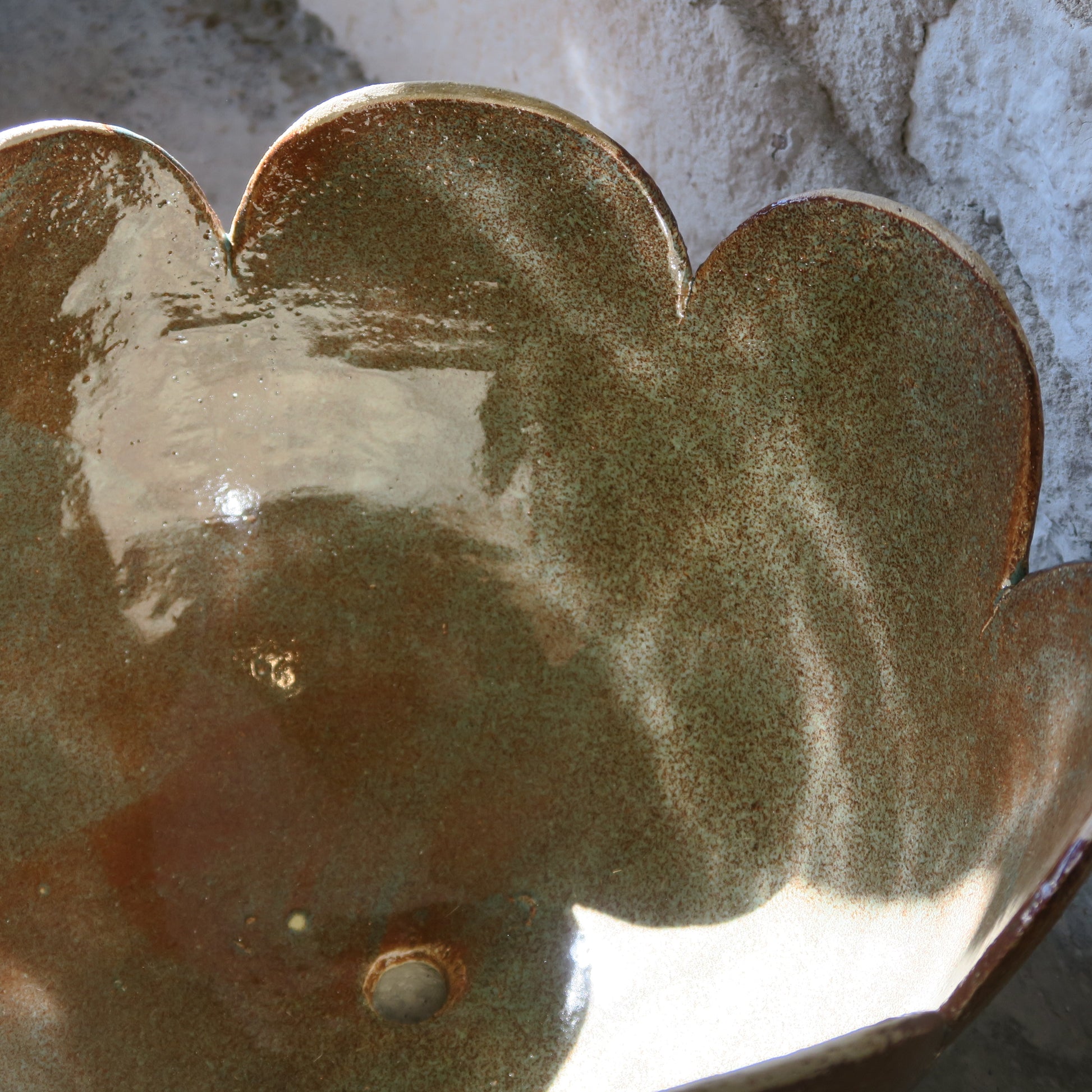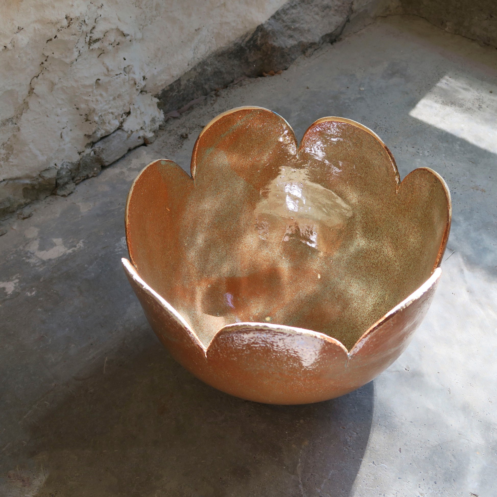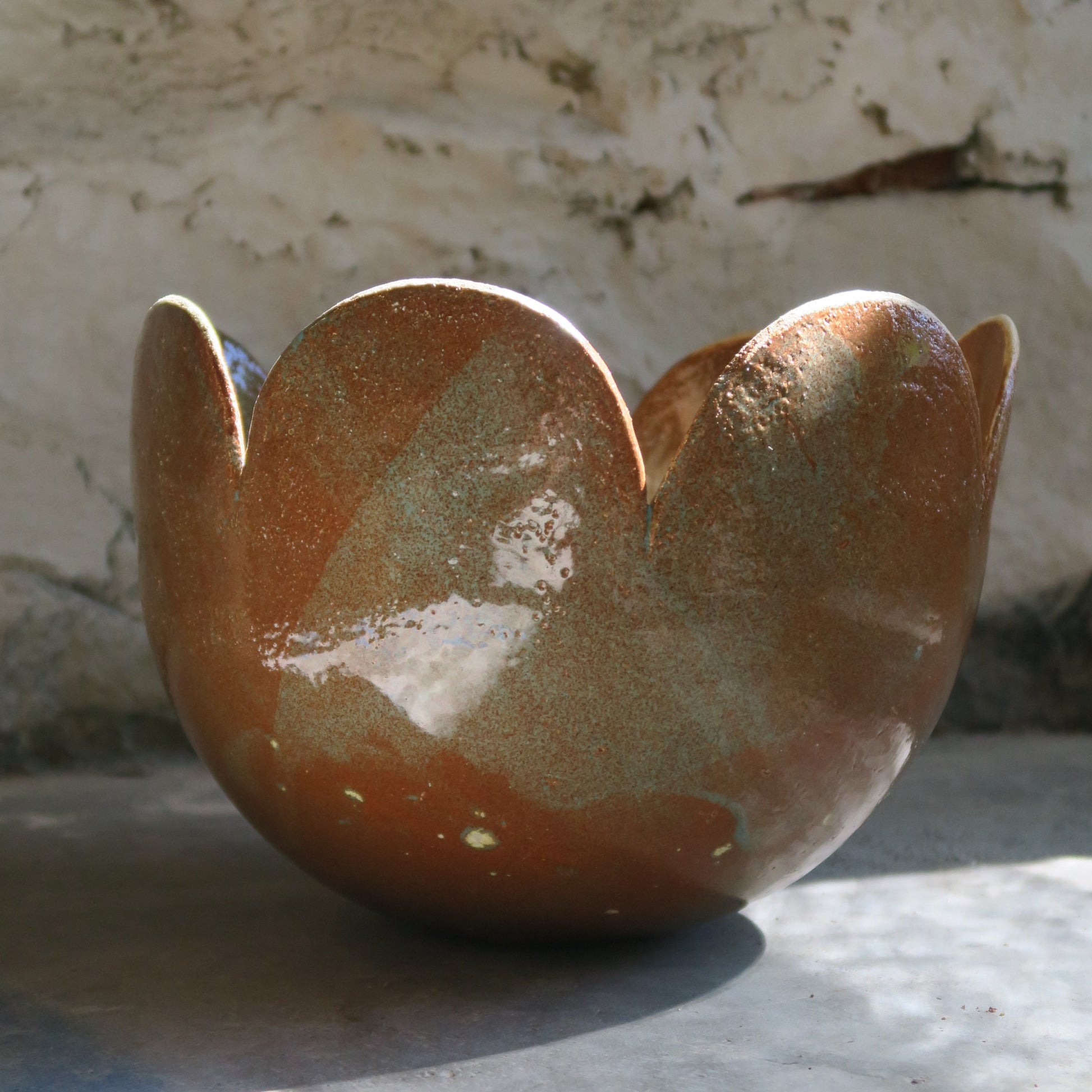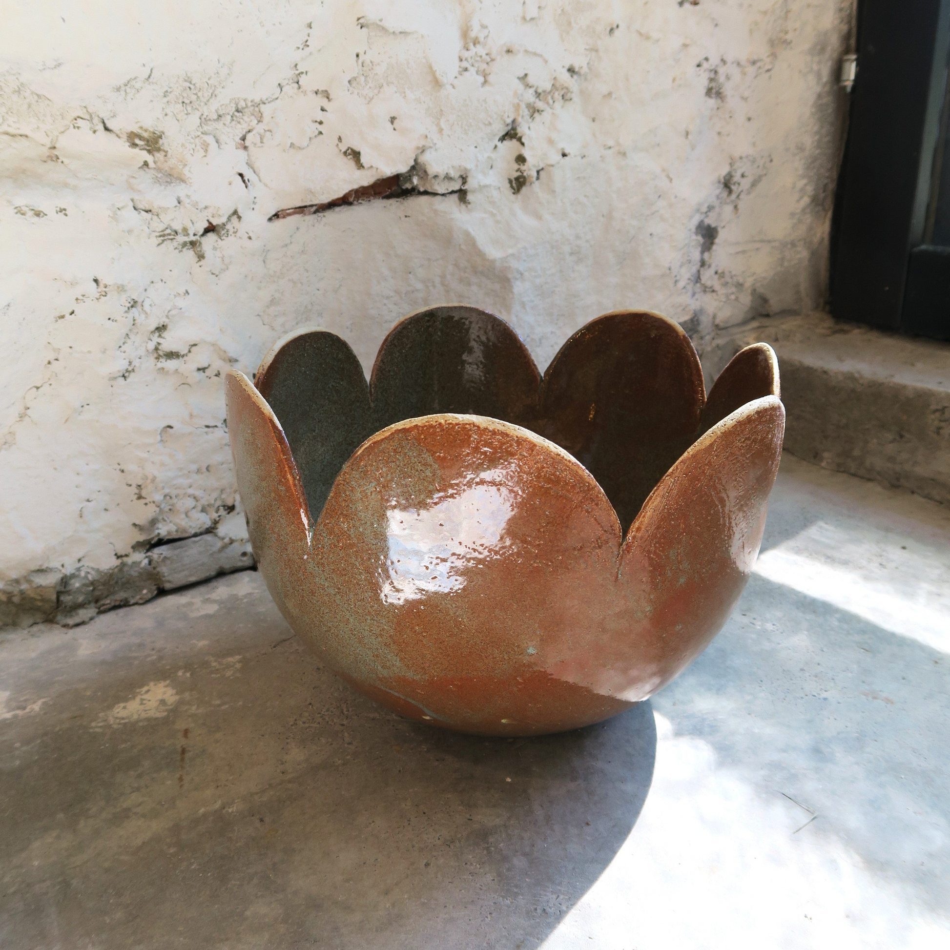 Maarit Lassilan käsin tekemä eläväinen ruskeanoranssi amppeliruukku piparireunalla. Pohjassa reikä.