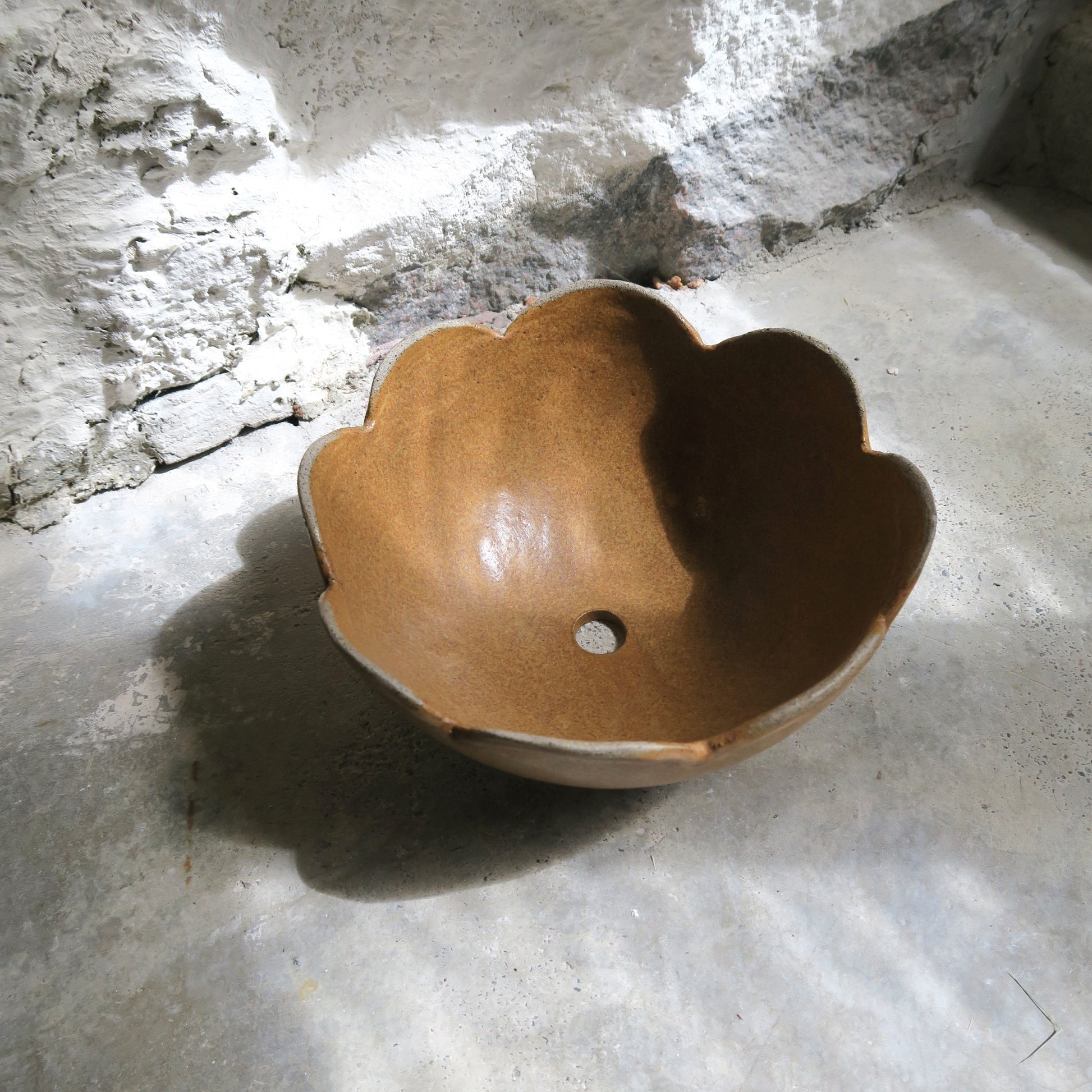 Maarit Lassilan käsin tekemä ruskea amppeliruukku piparireunalla. Pohjassa reikä.
