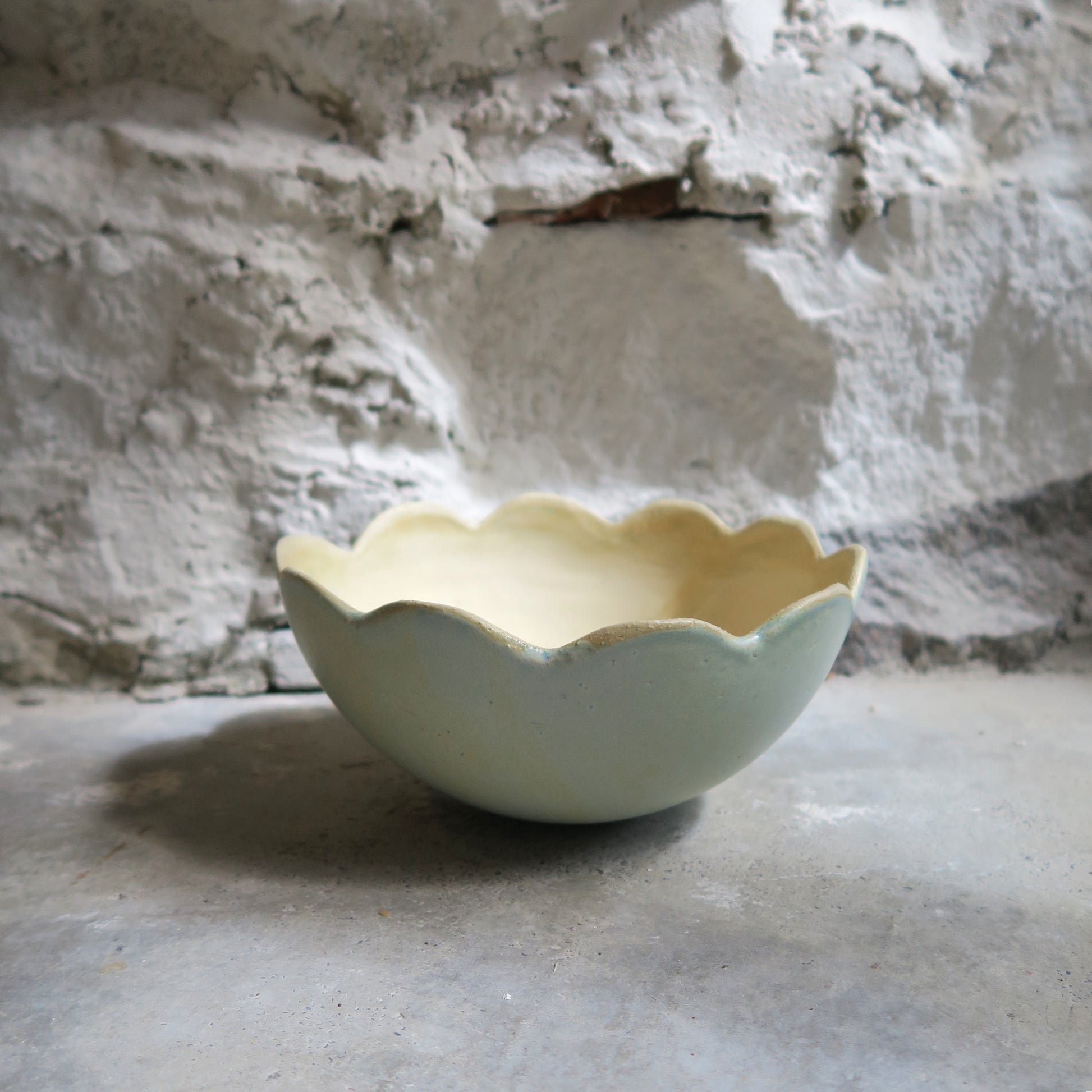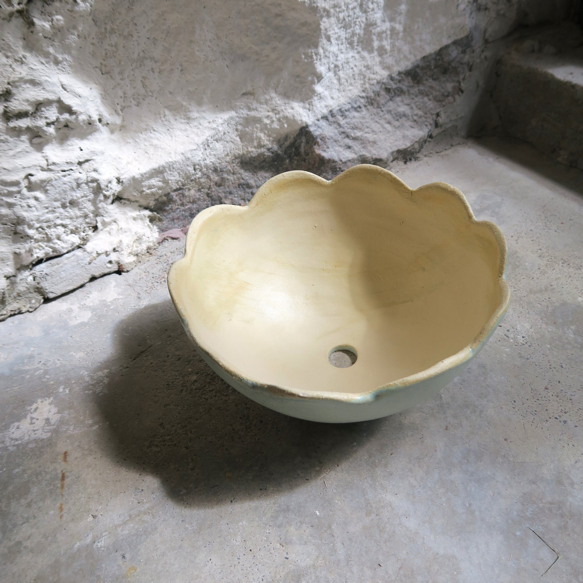 Maarit Lassilan käsin tekemä amppeliruukku piparireunalla. Pohjassa reikä.