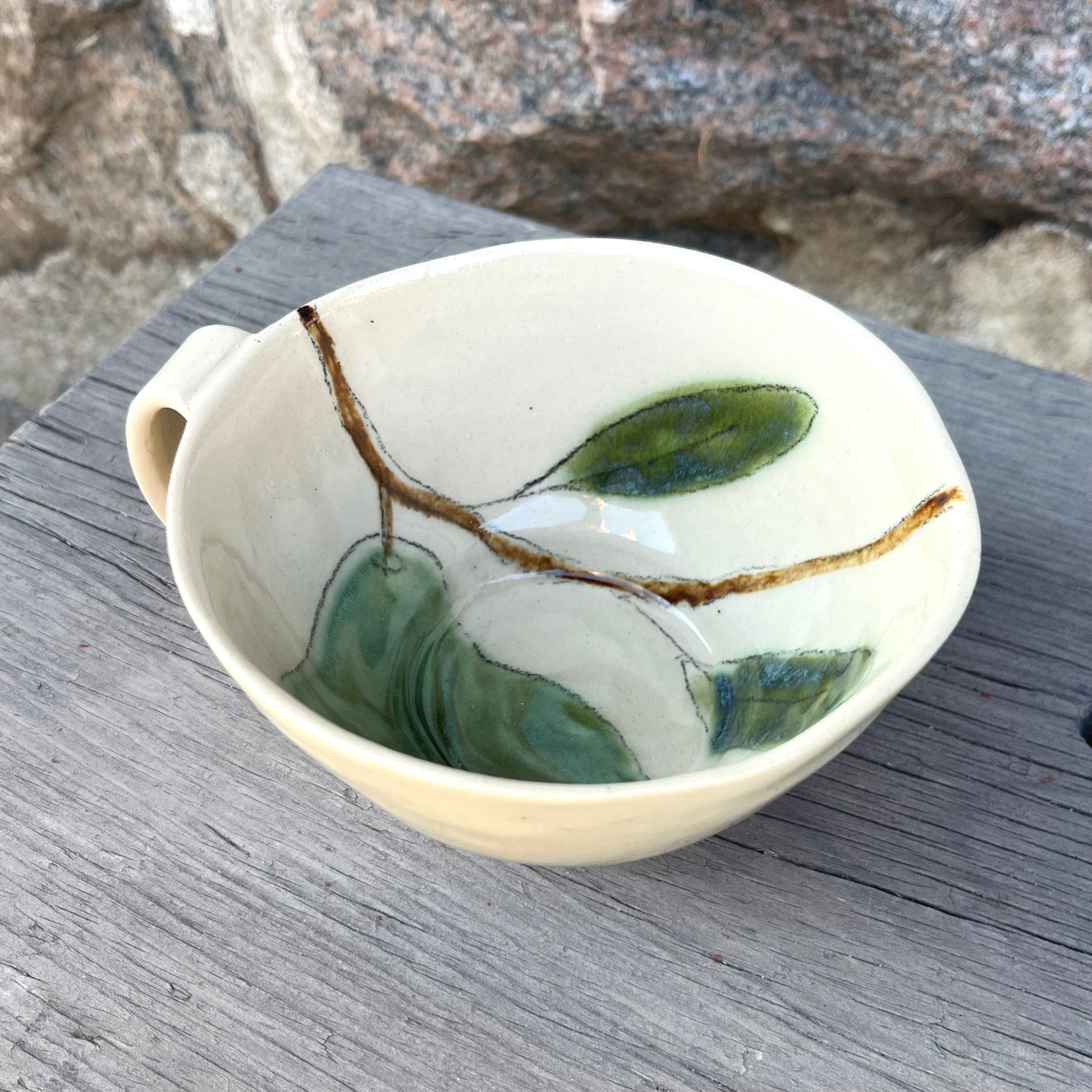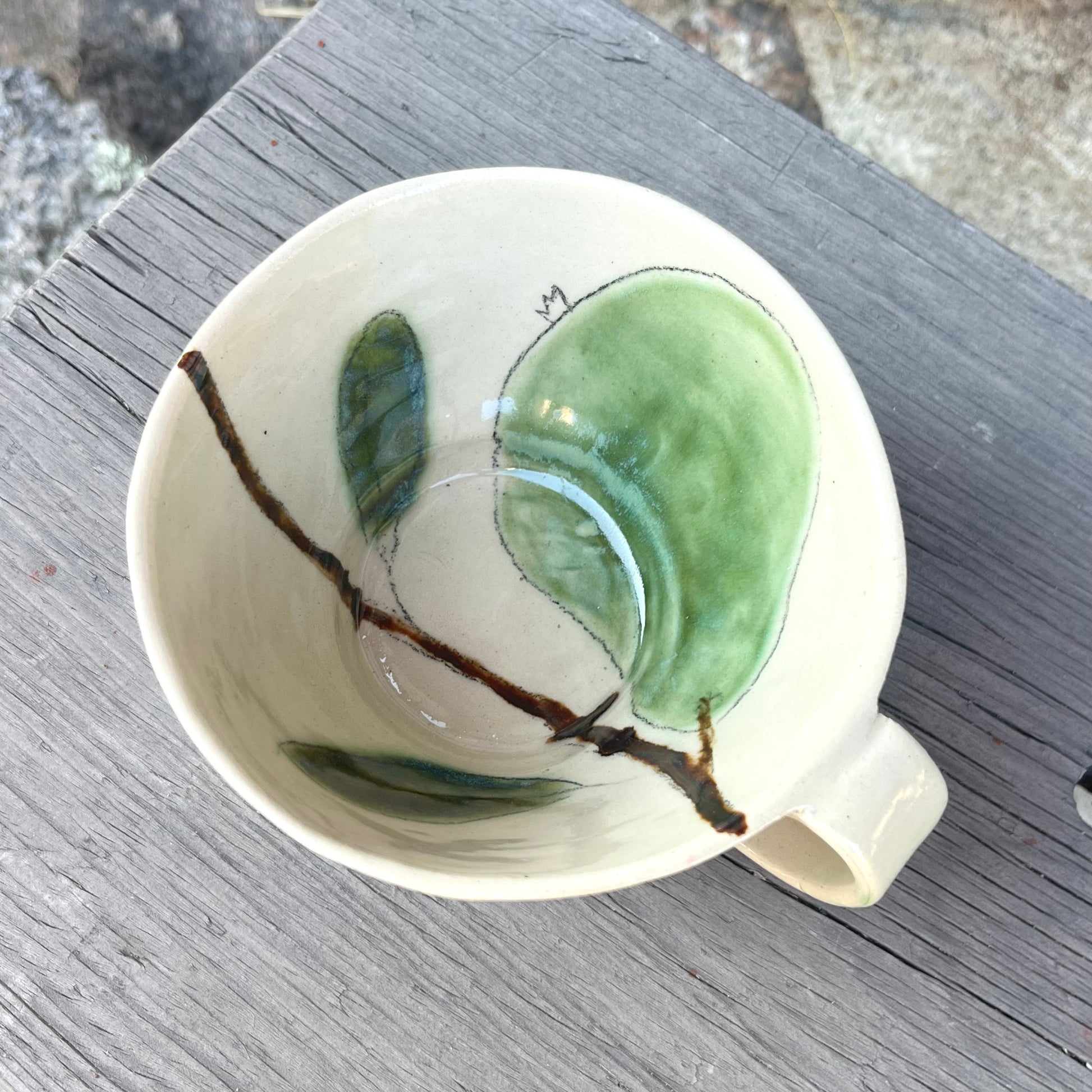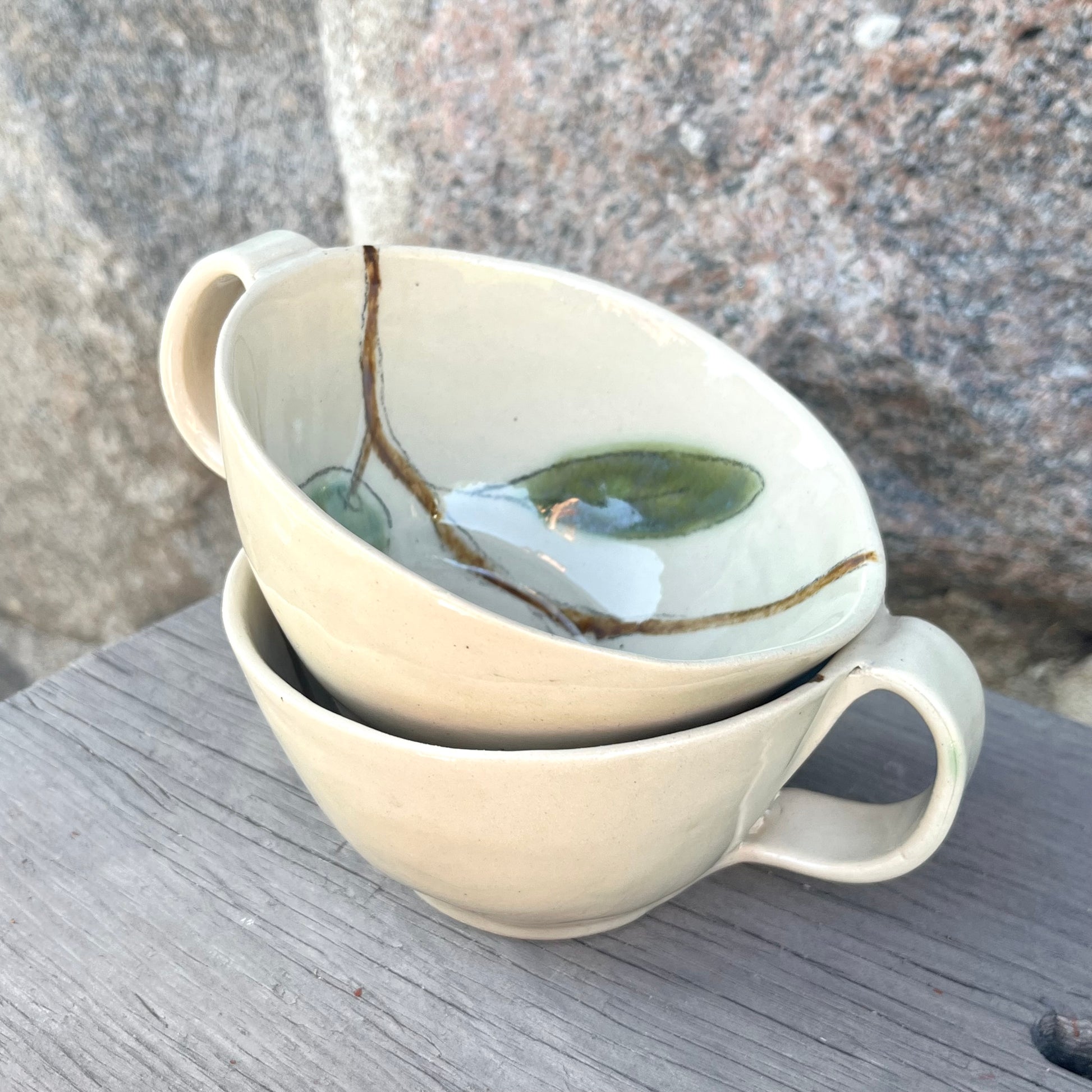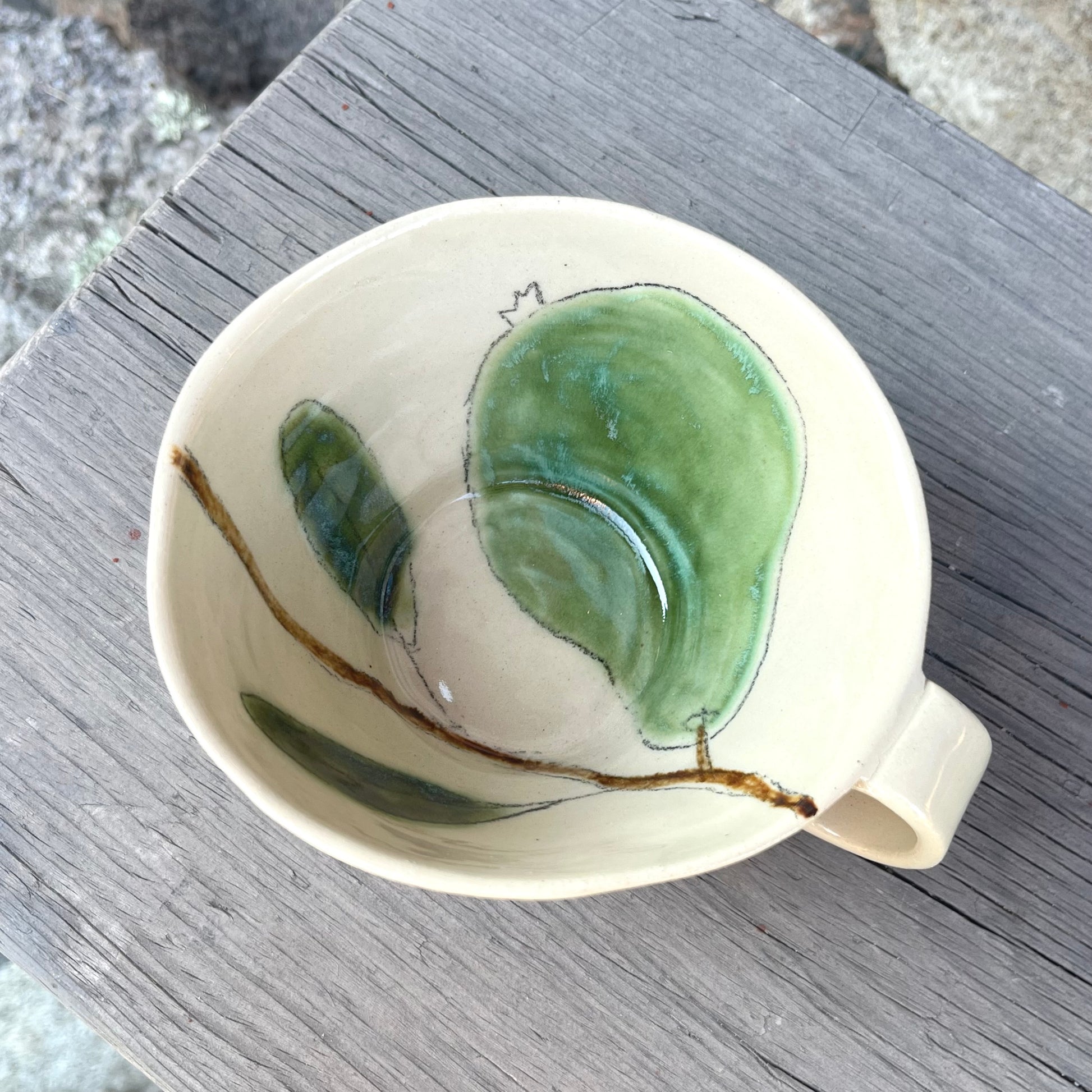 Maarit Lassilan käsin valmistama ja maalaama cappuccinomuki päärynöillä. Astianpesukoneen, mikron ja uunin kestävä. Jokainen päärynämuki on omanlaisensa uniikki kappale.