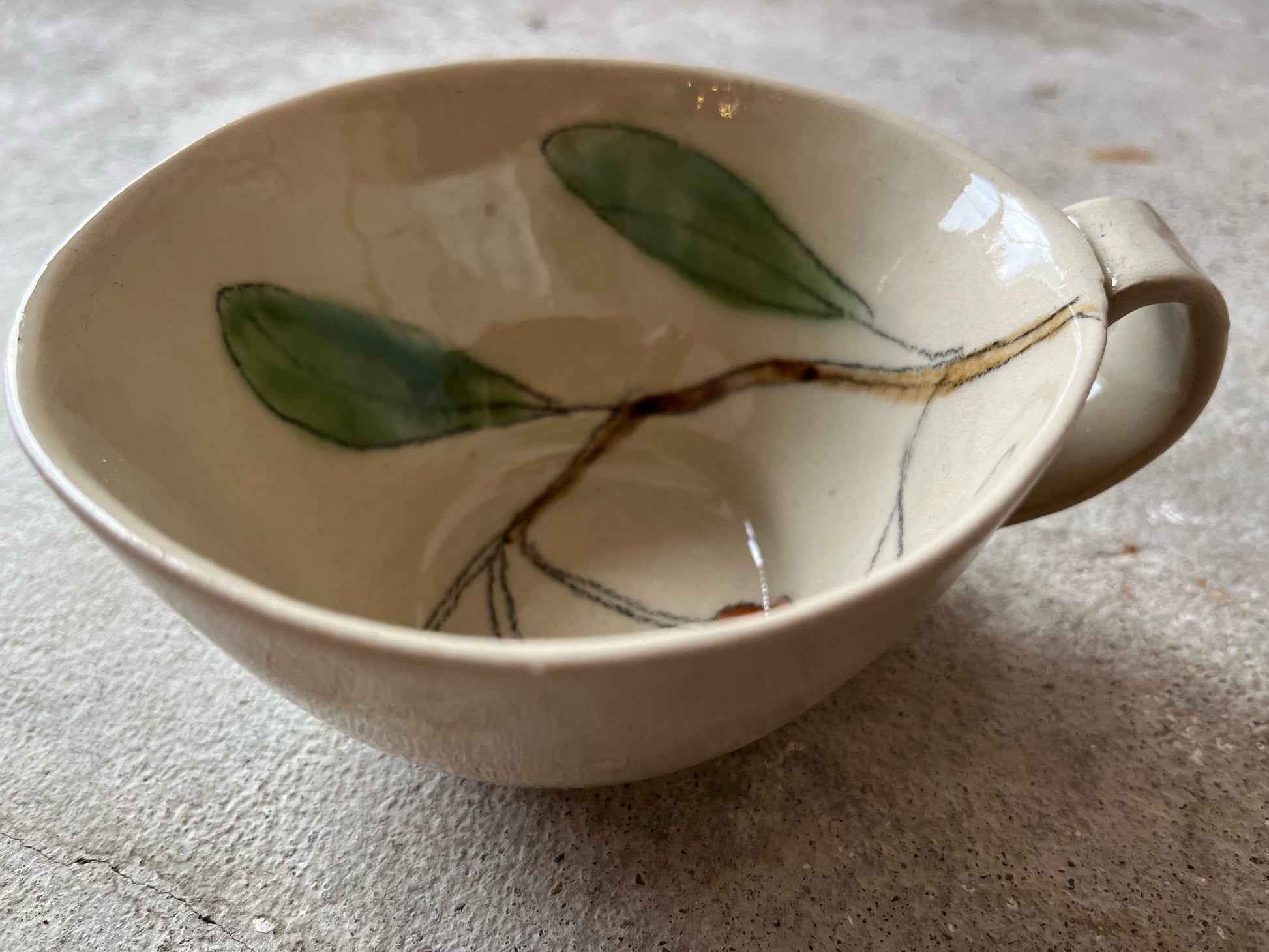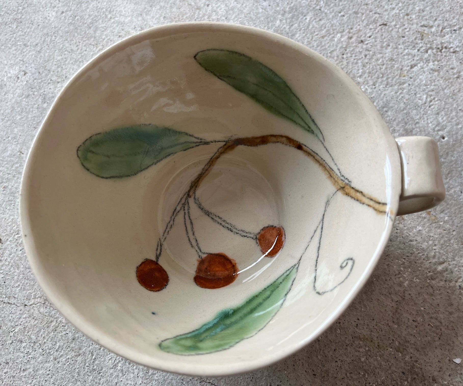 Käsintehdyssä cappucino- kupissa on Maarit Lassilan käsin maalaama kirsikkakuvio. Korkeapolttoista keramiikkaa ja astianpesukoneen kestävä.