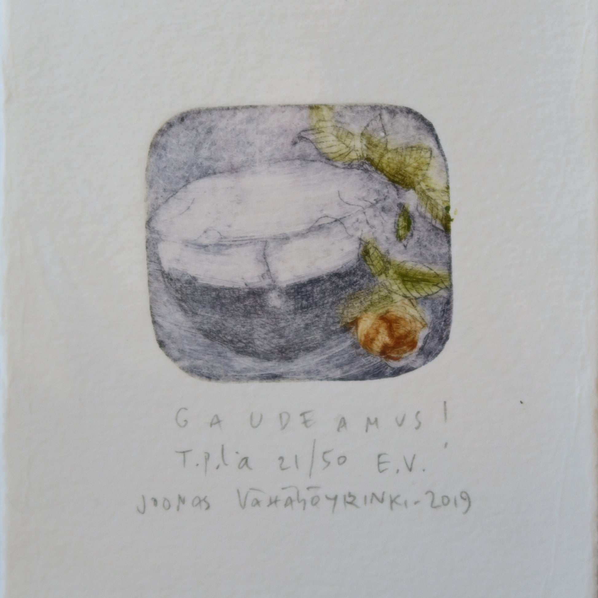 "Gaudeamus!". Vedos 21/50. 2019. Joonas Vähäsöyringin taidegrafiikan vedos. Viivasyövytys. Vedosalue 4,5 x 5 cm.