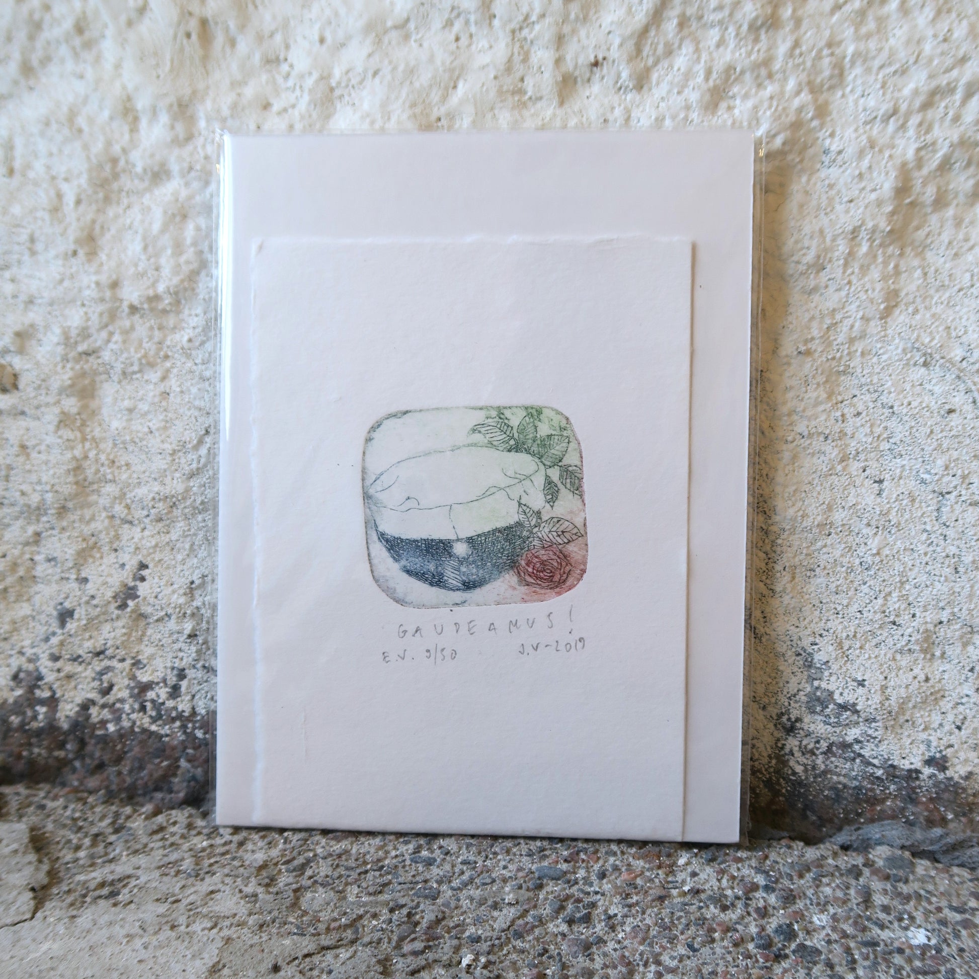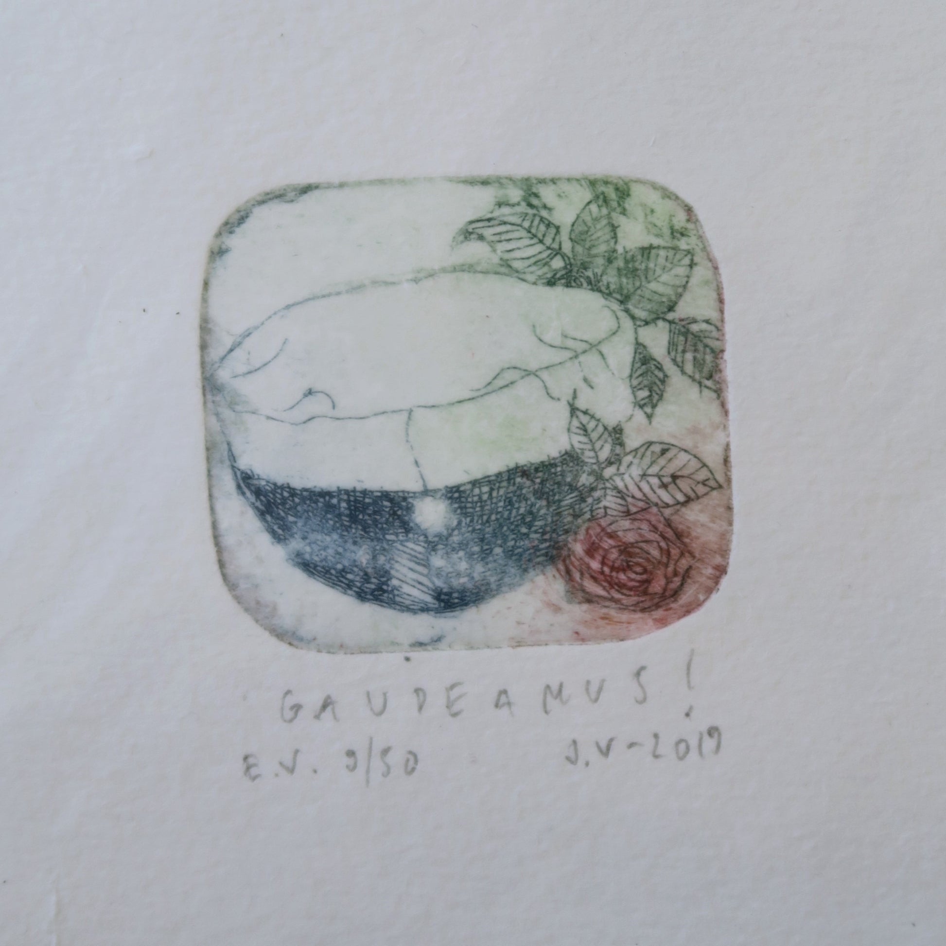 "Gaudeamus!". Vedos 9/50. 2019. Joonas Vähäsöyringin taidegrafiikan vedos. Viivasyövytys. Vedosalue 4,5 x 5 cm.
