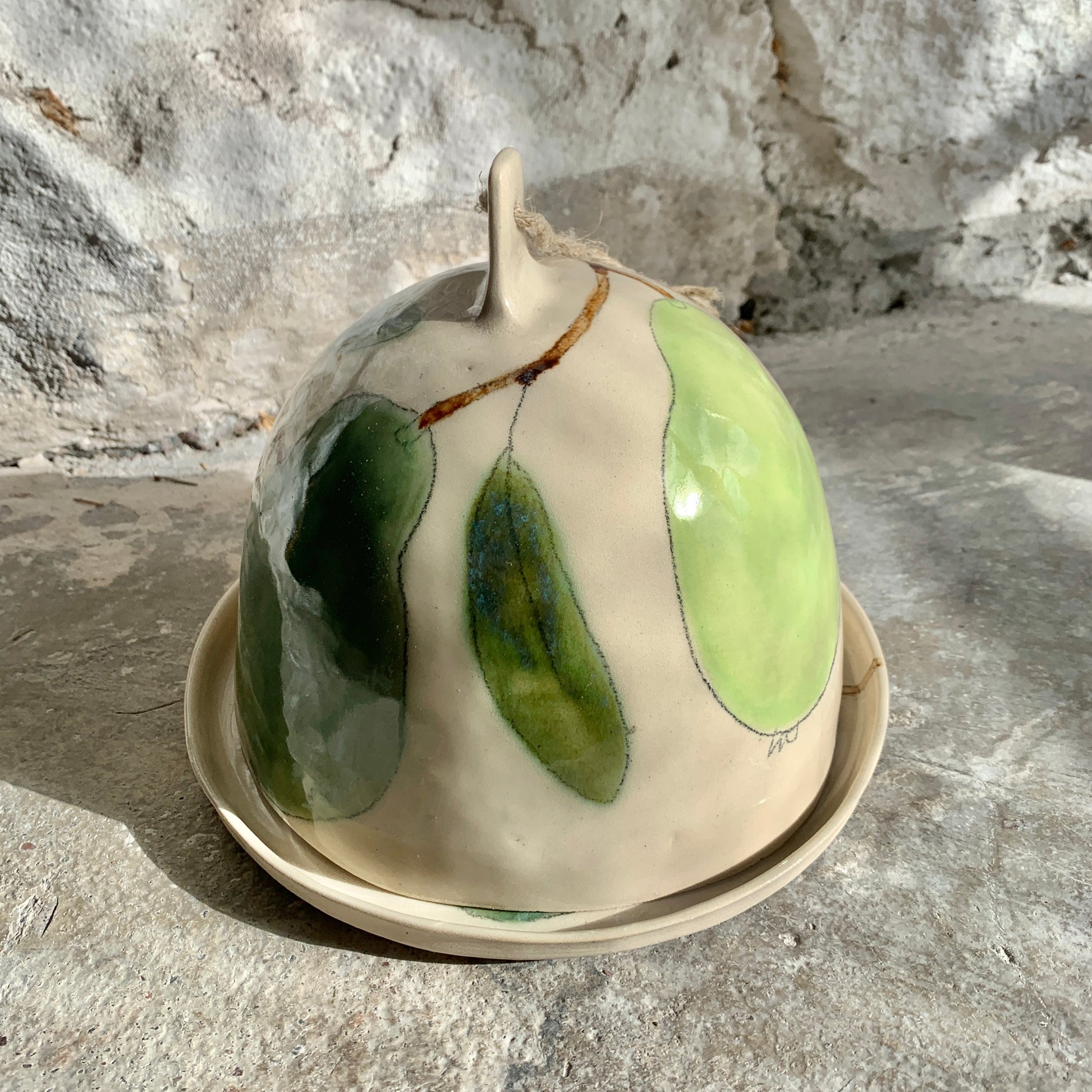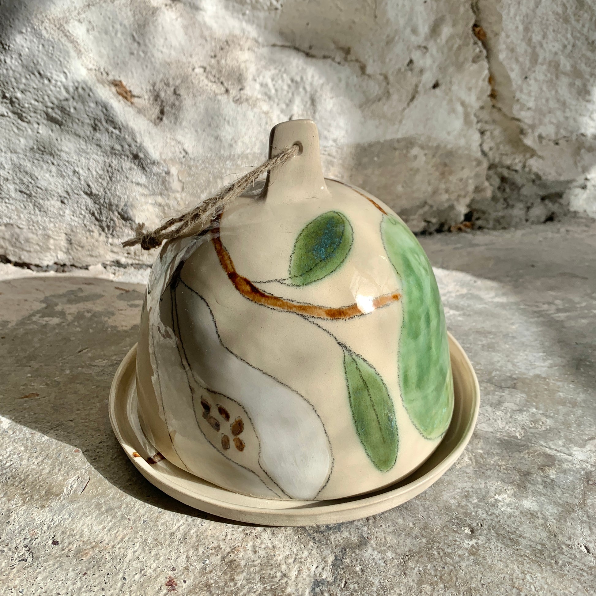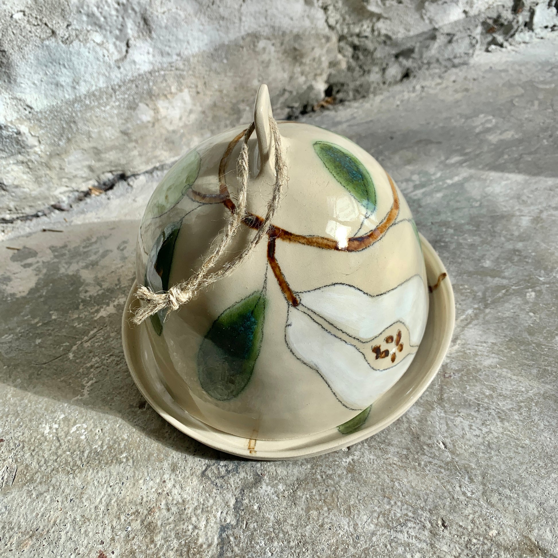 Maarit Lassilan käsin valmistama ja maalaama juustokupu. Jääkapissa säilytettynä pitää juuston tai voin kylmänä vielä pöydässäkin. Kestää mikron, uunin ja astianpesukoneen.