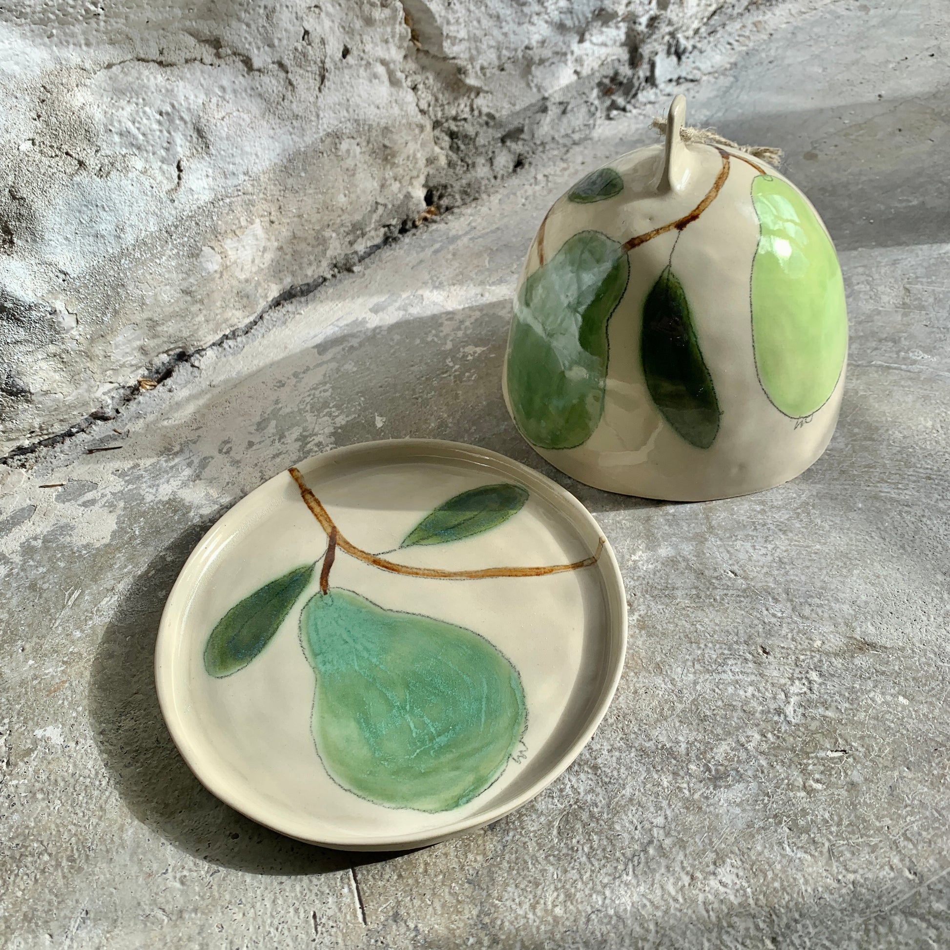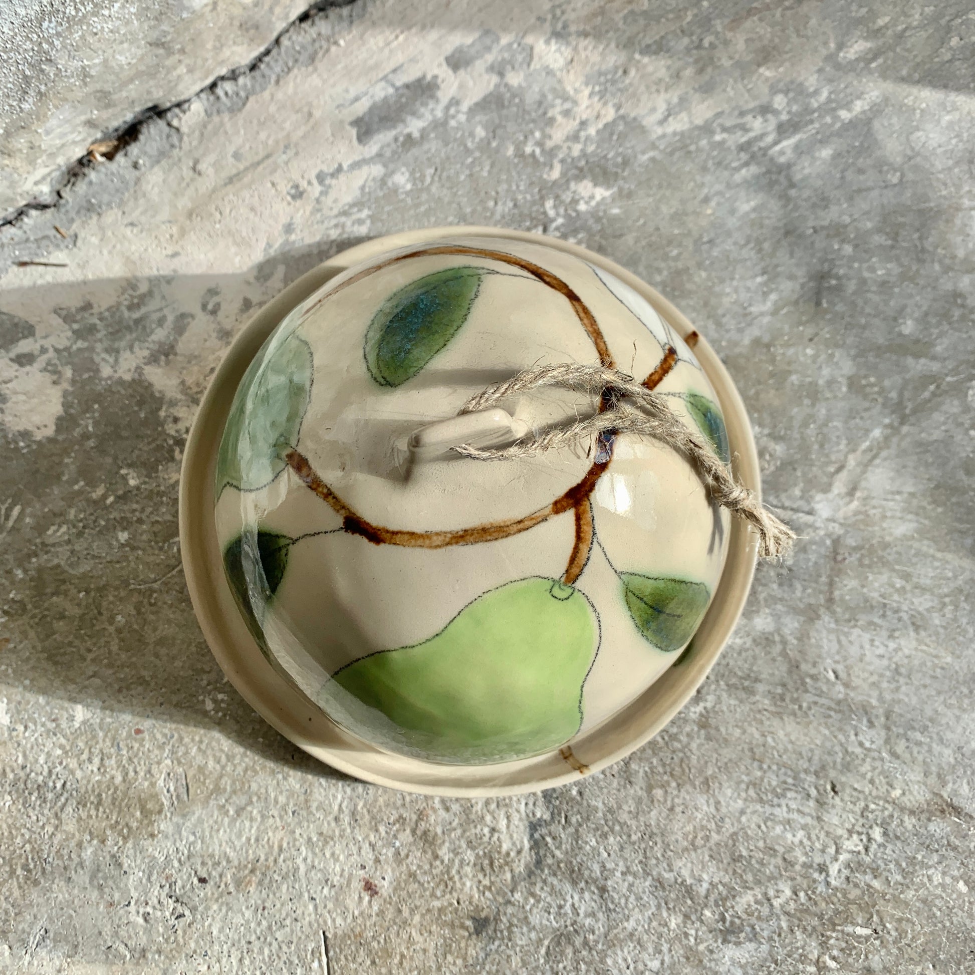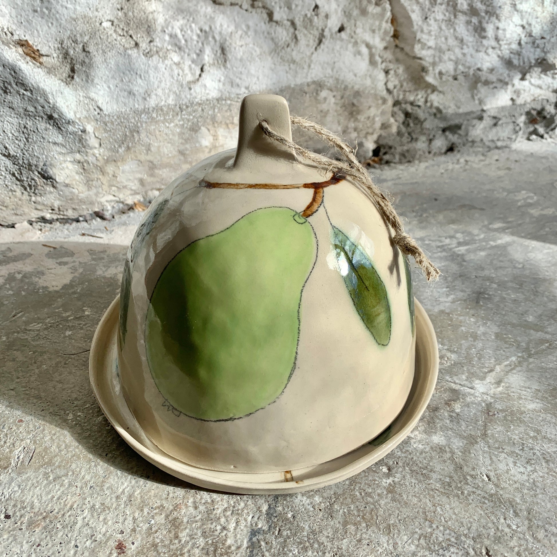 Maarit Lassilan käsin valmistama ja maalaama juustokupu. Jääkapissa säilytettynä pitää juuston tai voin kylmänä vielä pöydässäkin. Kestää mikron, uunin ja astianpesukoneen.
