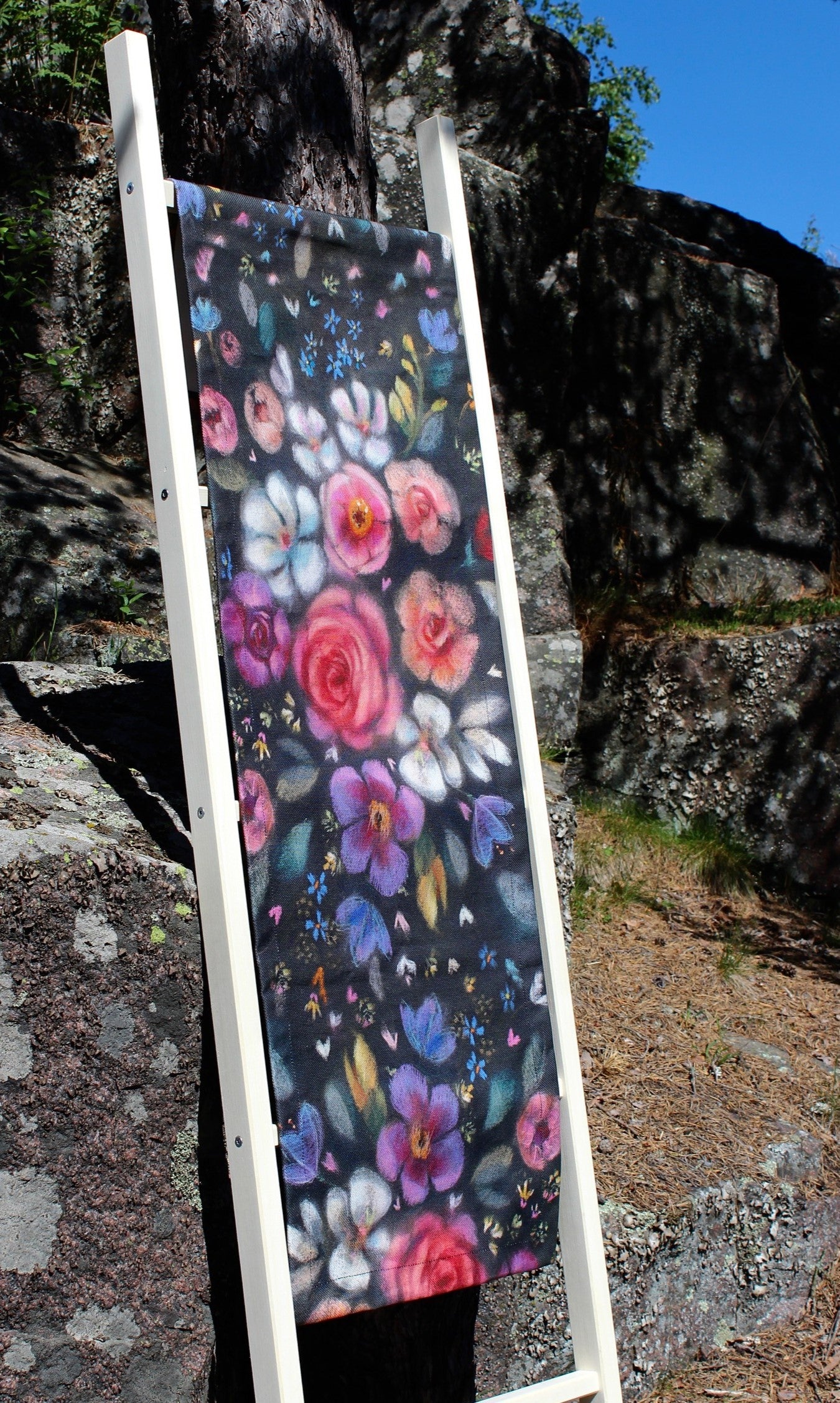 Maarit Lassilan pastellityön pohjalta valmistettu kaitaliina. Kotimaassa valmistettu yhteistyössä Likiz:n kanssa. Materiaalina paksu BCI-sertifioitu 100 % puuvillacanvas.