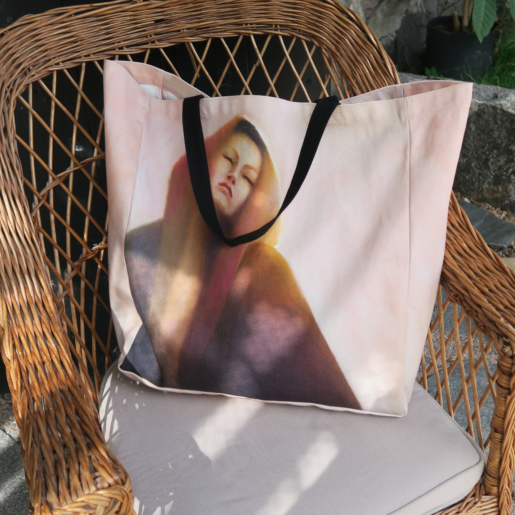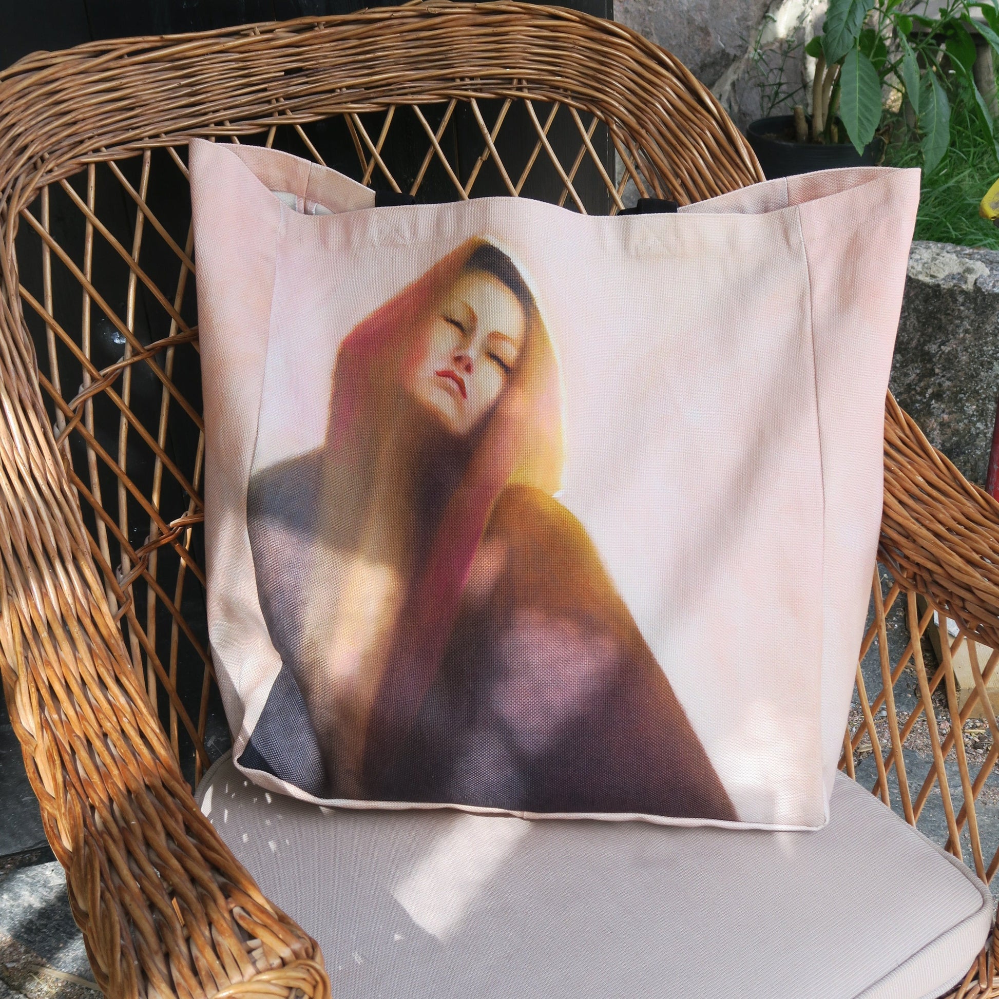 Suuri kangaskassi, jossa kaksi mustaa kahvaa. Materiaalina on paksu BCI-sertifioitu 100 % puuvillacanvas, jolle on digipainettu Maarit Lassilan maalaus käsintehdyn originaalin mukaan. Kuosi on kassin molemmilla puolilla.