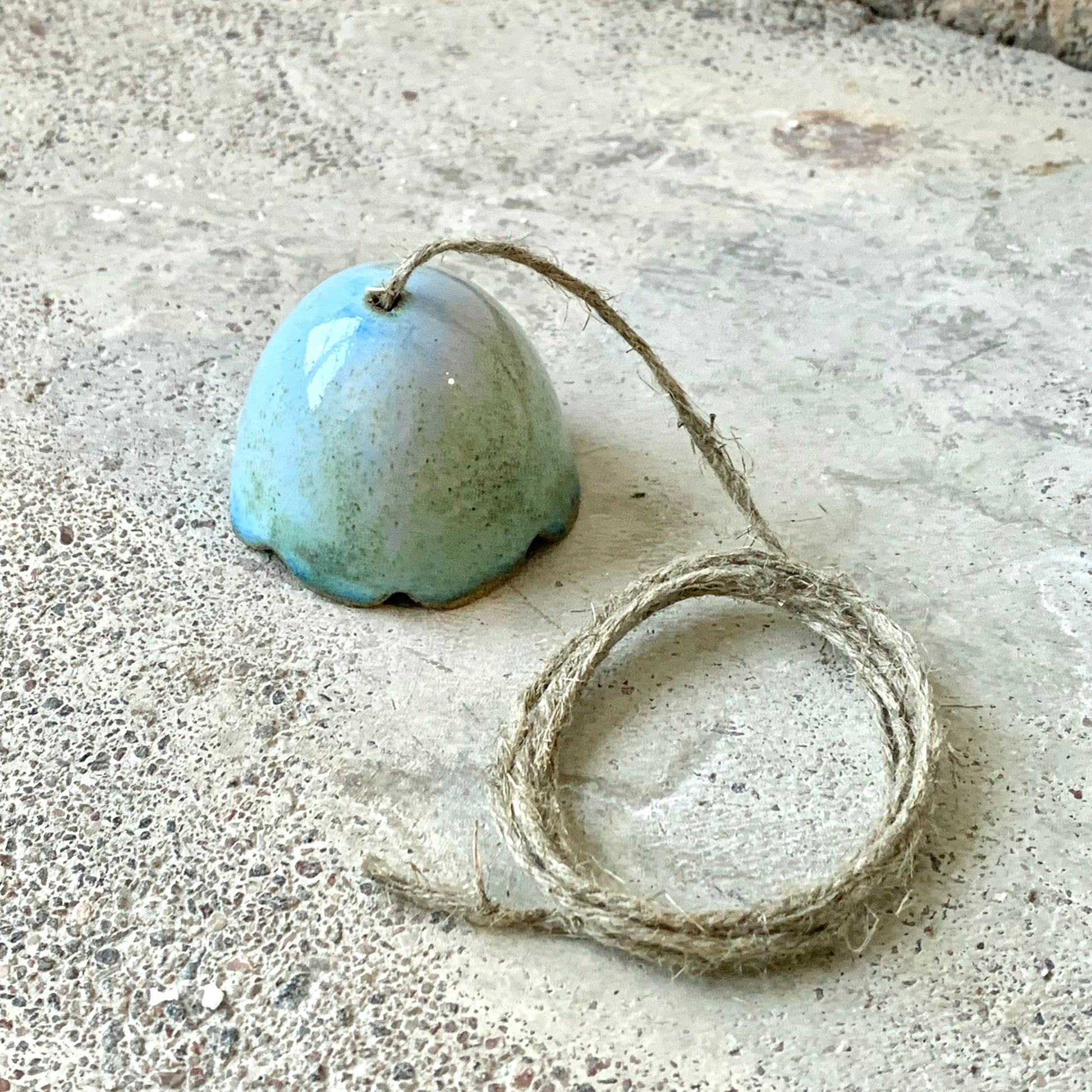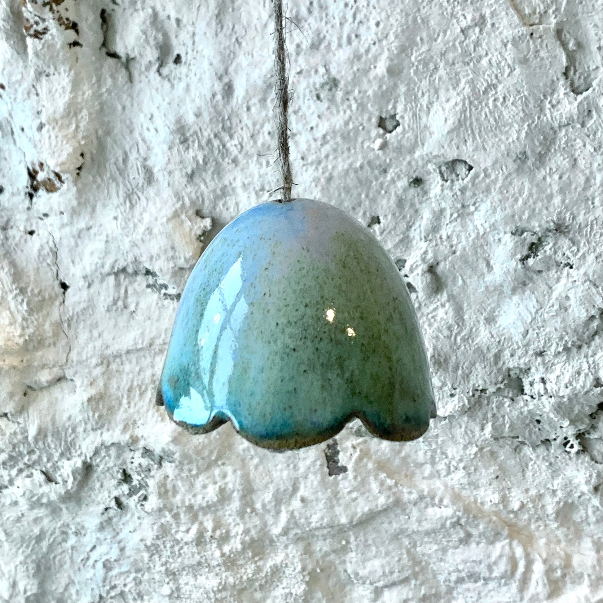 Maarit Lassilan käsin valmistama sinivihreä kello. Sopii ulos tuulikelloksi tai sisälle ikkunaa koristamaan. Lasitettua keramiikkaa.