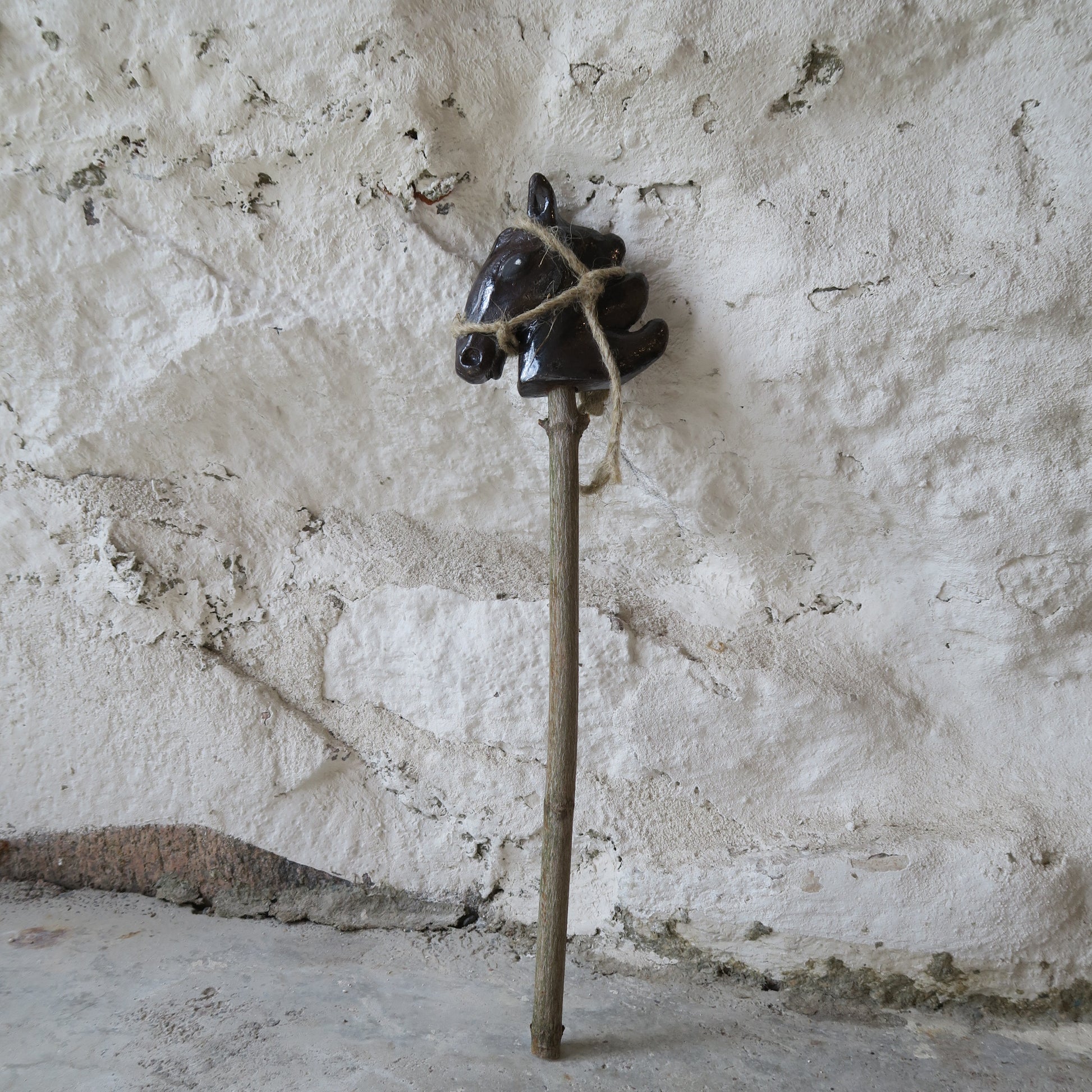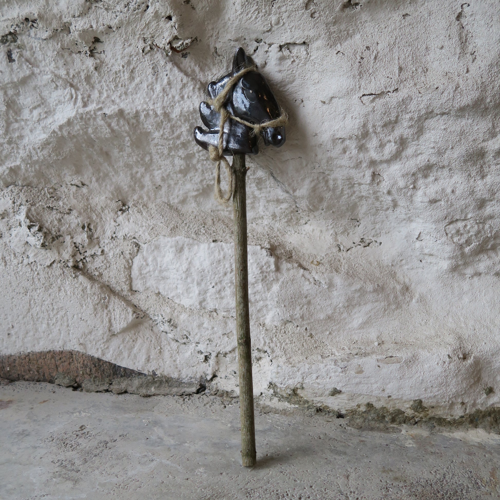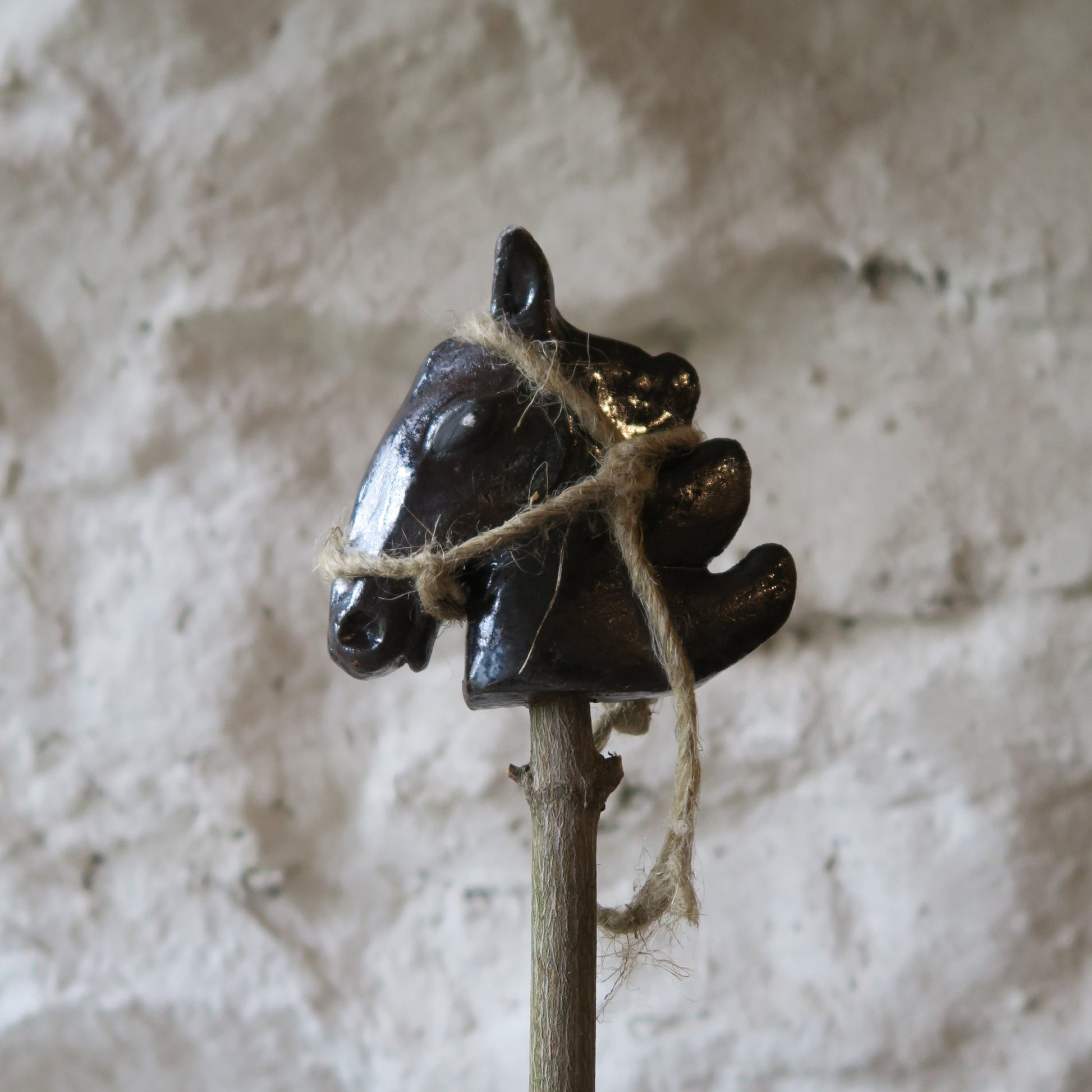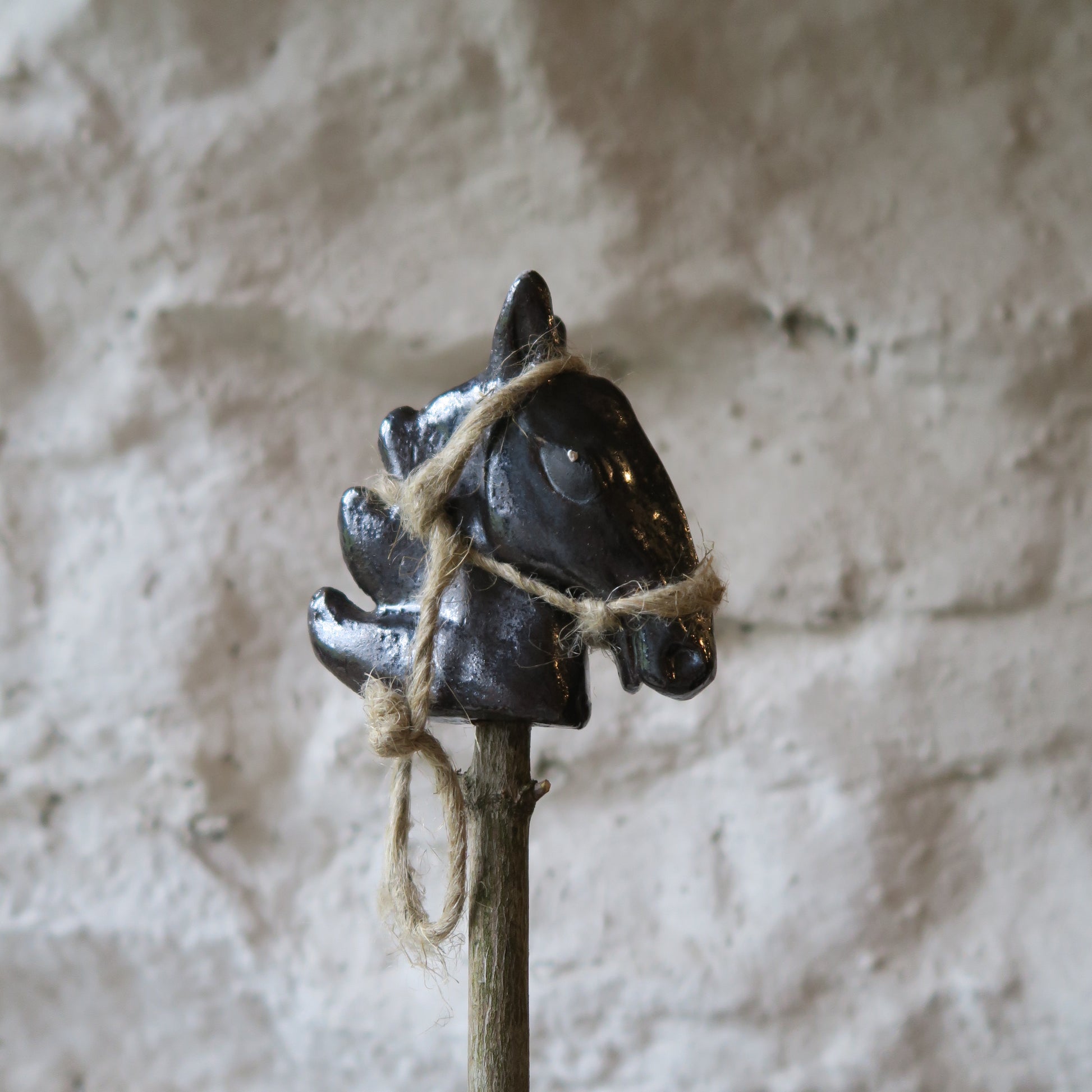 Maarit Lassilan käsin tekemä uniikki keppihevoskoriste. Voi ripustaa seinälle tai laittaa astiaan pystyyn. Lasitettua keramiikkaa, varsi puuta.