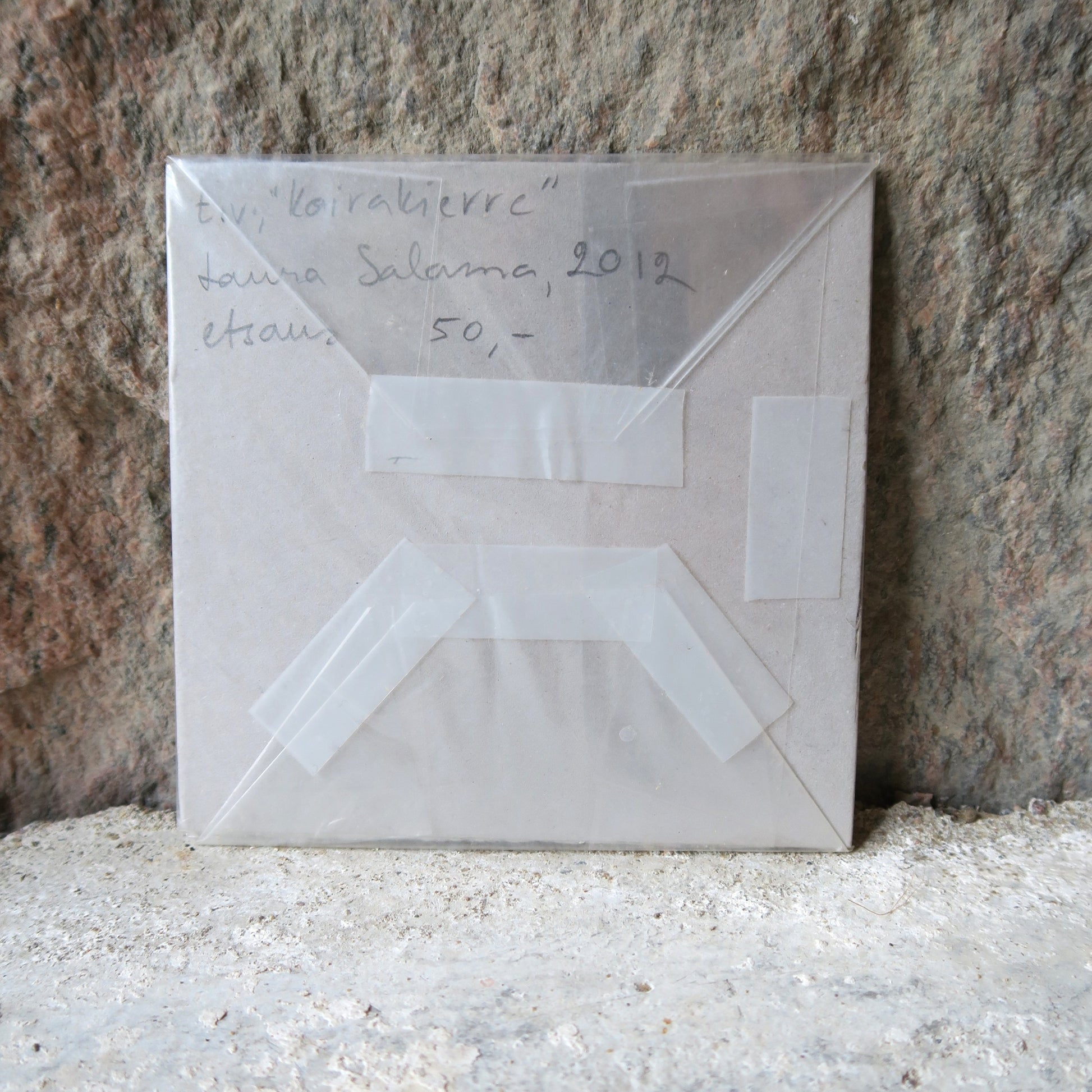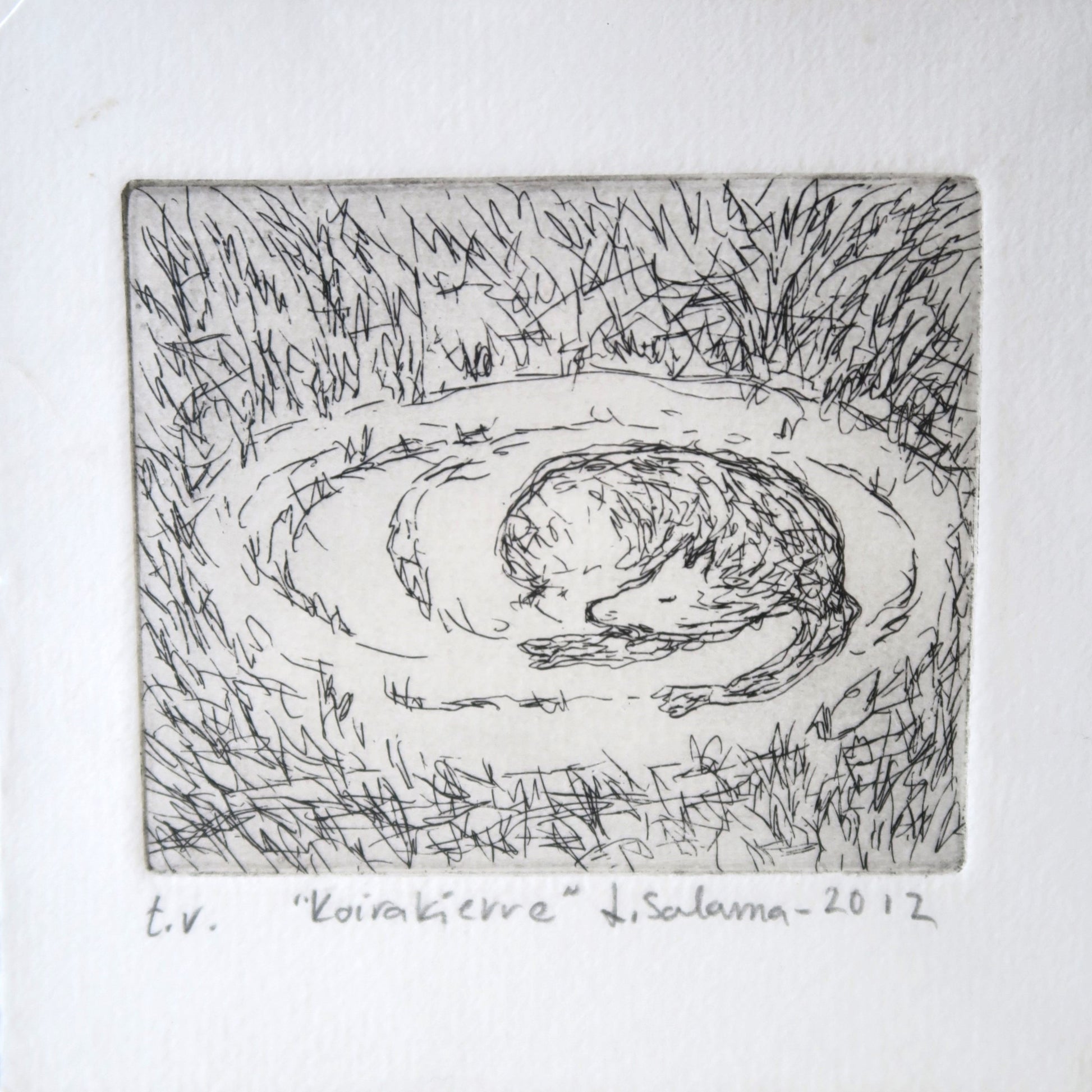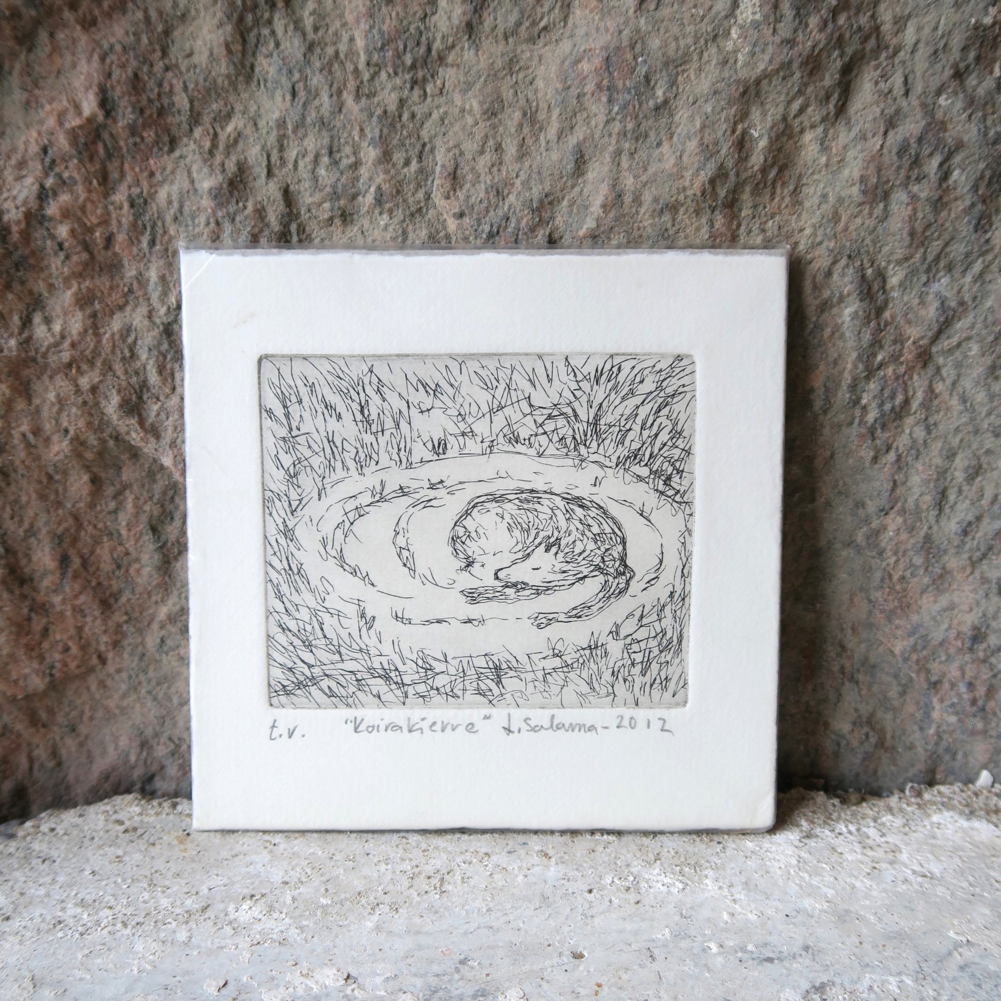 "Koirakierre". T.V. Laura Salaman taidegrafiikan vedos. Etsaus. Vedosalue 10 x 8,3 cm, paperin koko 13,5 x 14 cm.