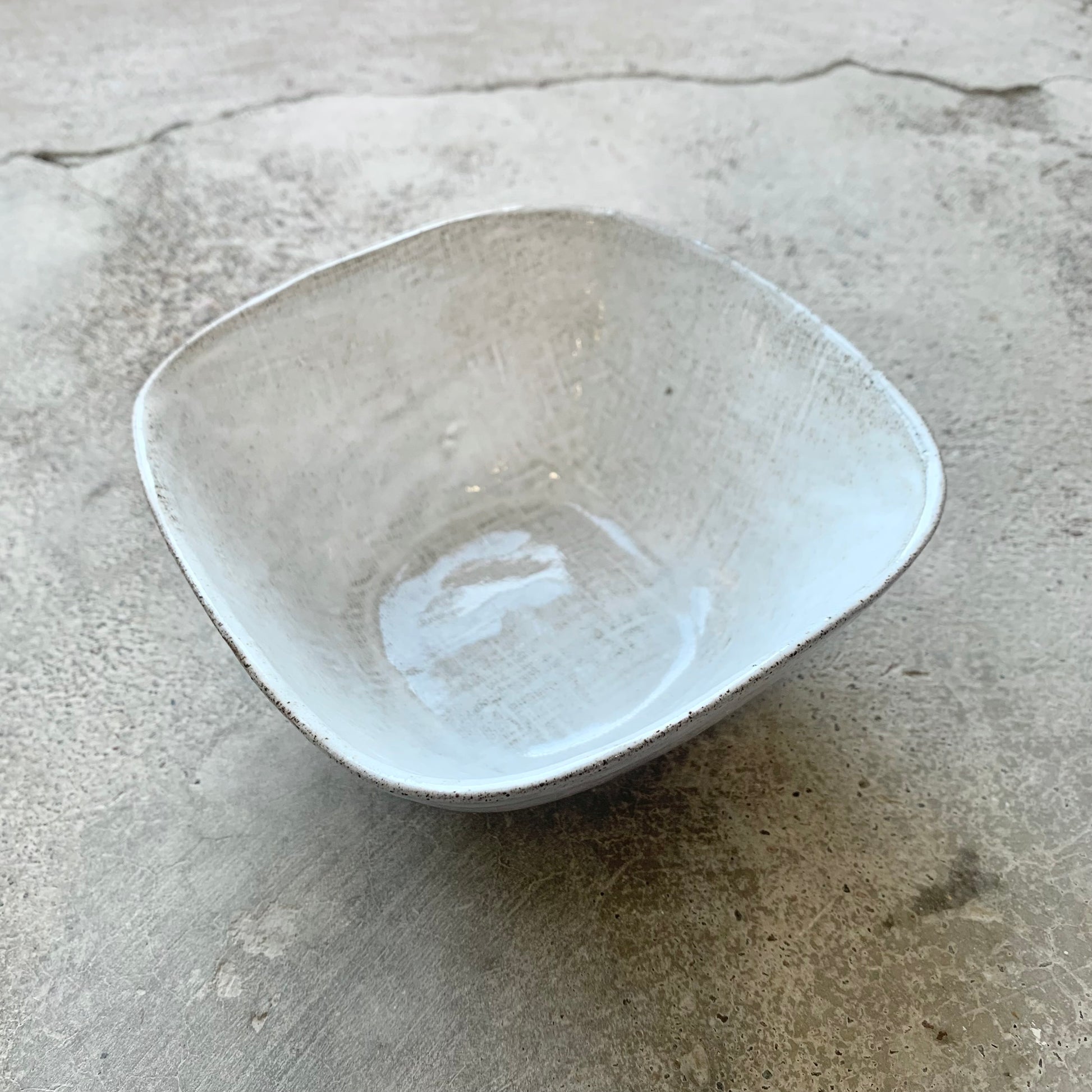 Maarit Lassilan käsin valmistama Lin-sarjan neliönmallinen kulho kangaspintaisella tekstuurilla. Mikron, uunin ja astianpesukoneen kestävät.