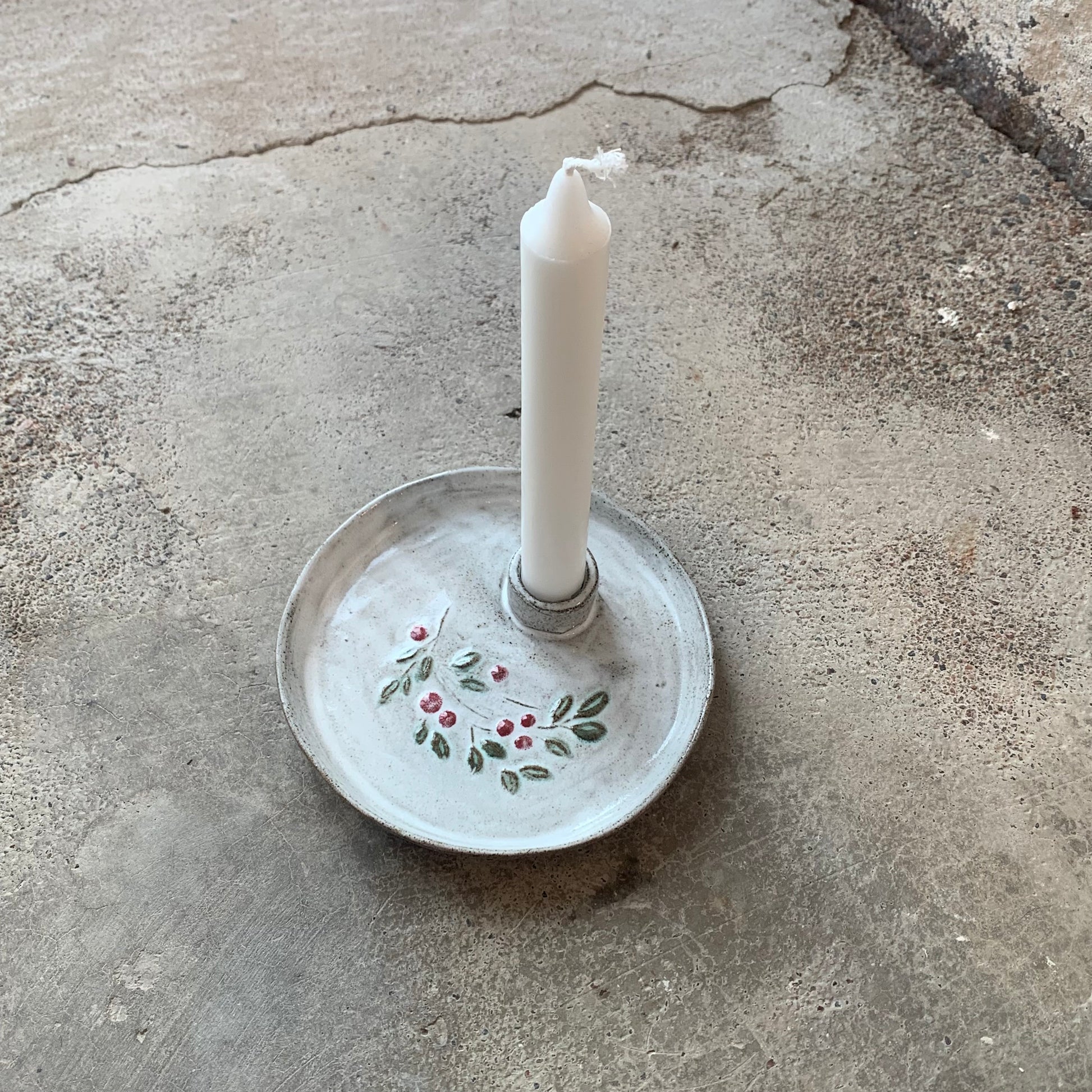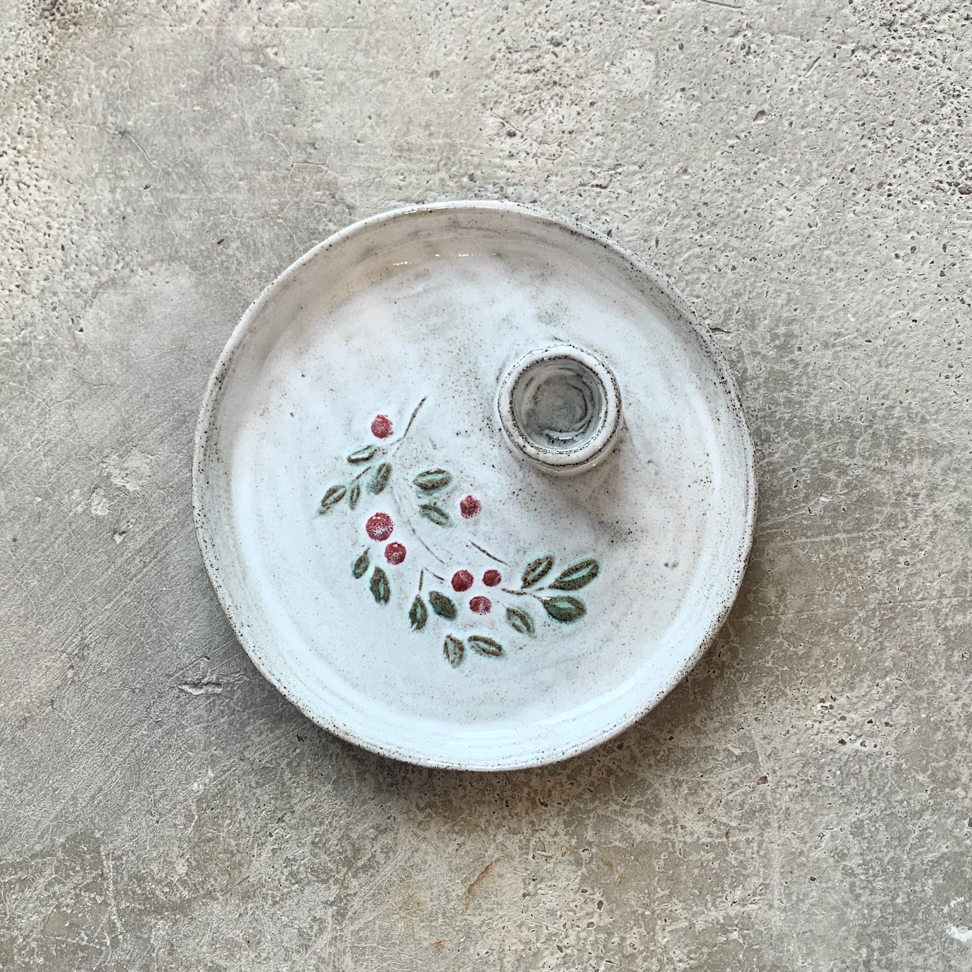 Maarit Lassilan käsin valmistama kynttilälautanen puolukan painokuviolla. Sopii standardikokoisille kruunukynttilöille.