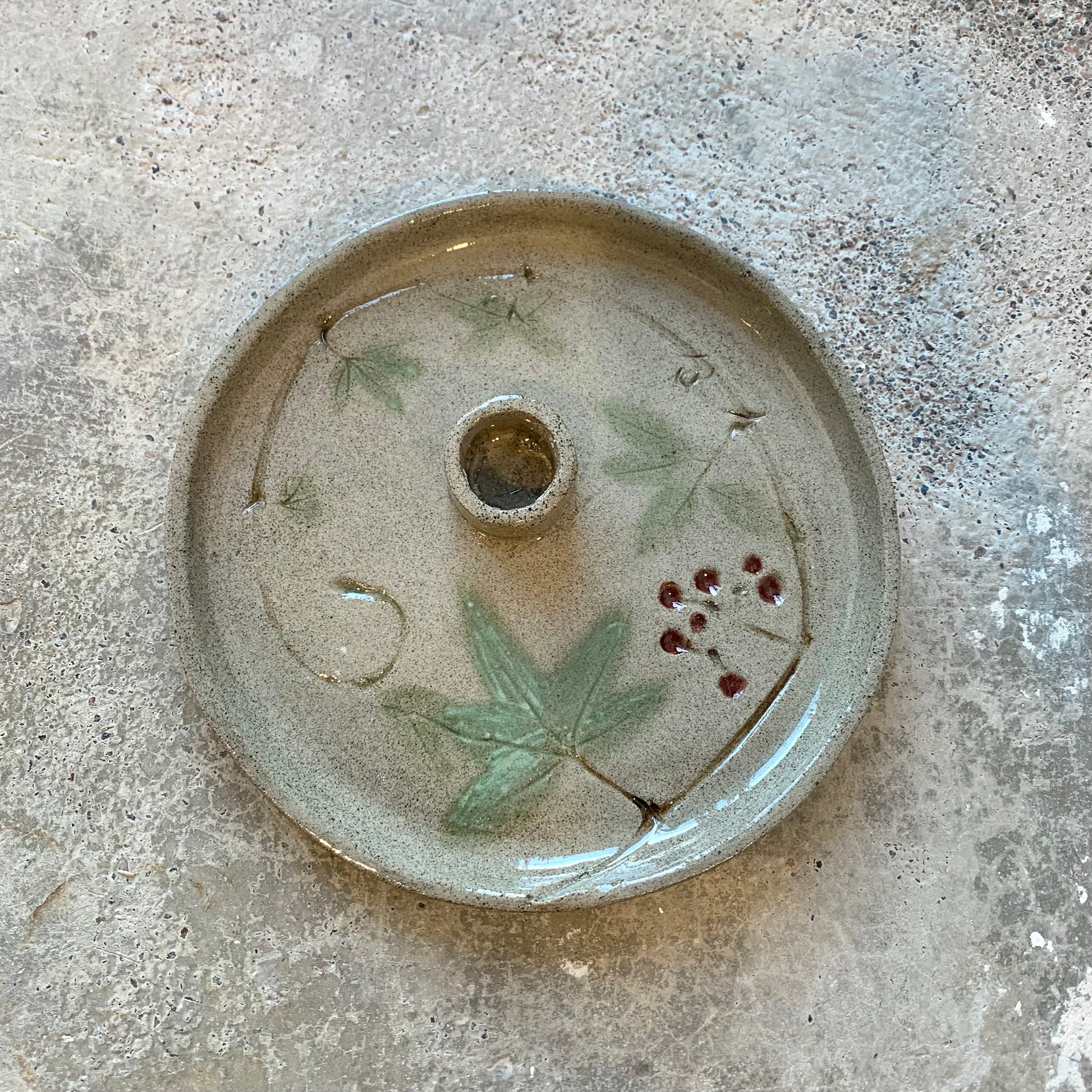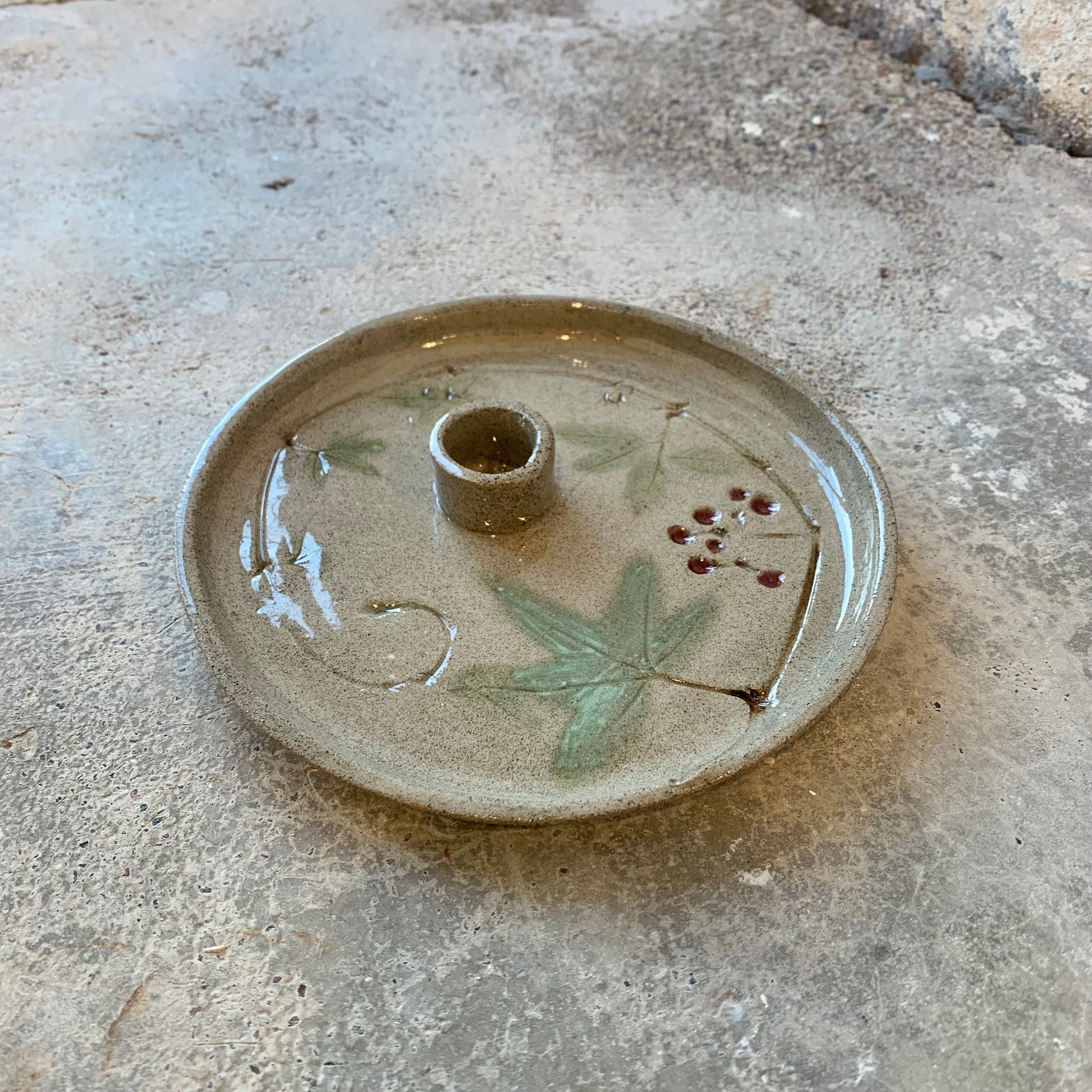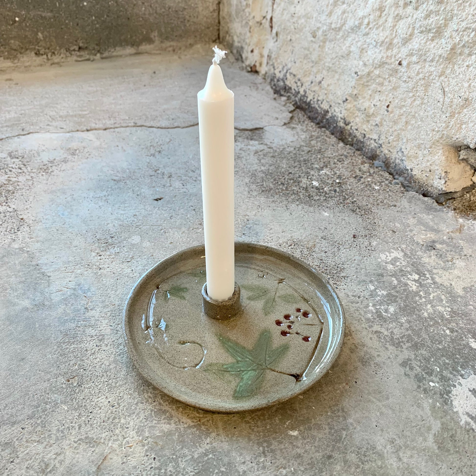 Maarit Lassilan käsin valmistama Villiviini-kynttilälautanen.