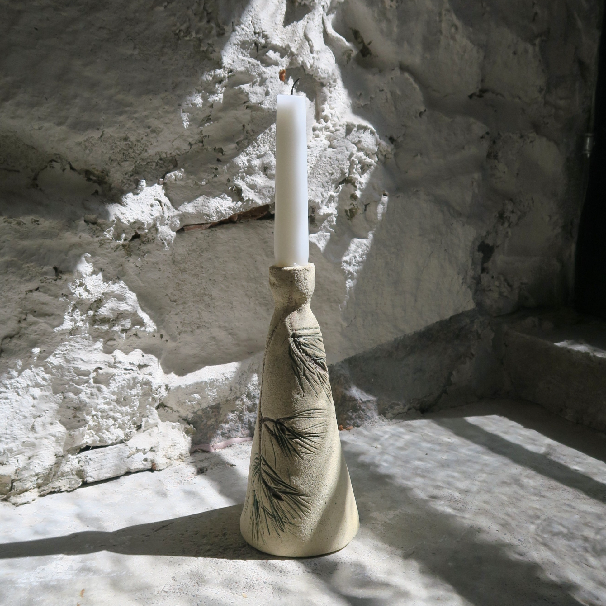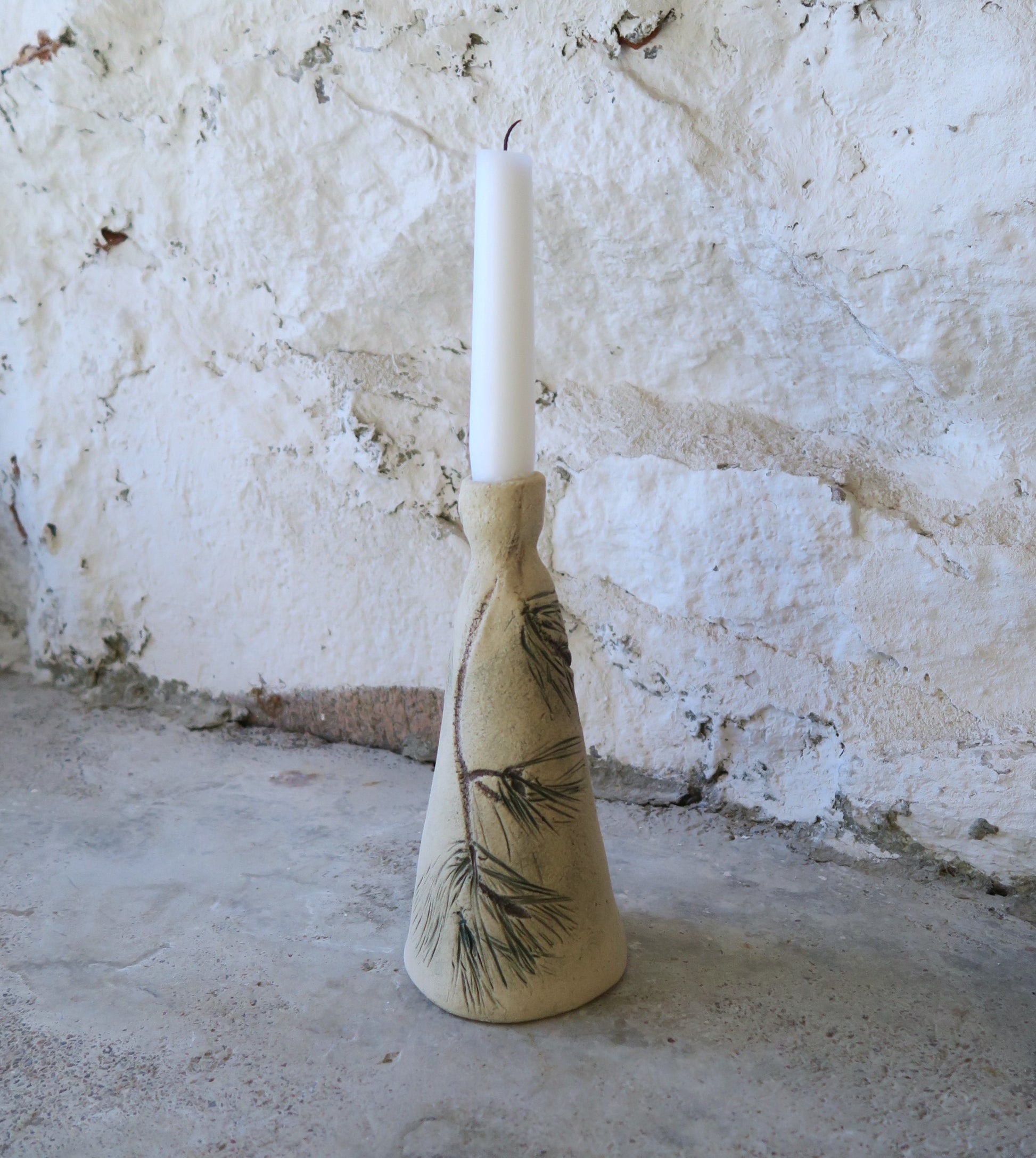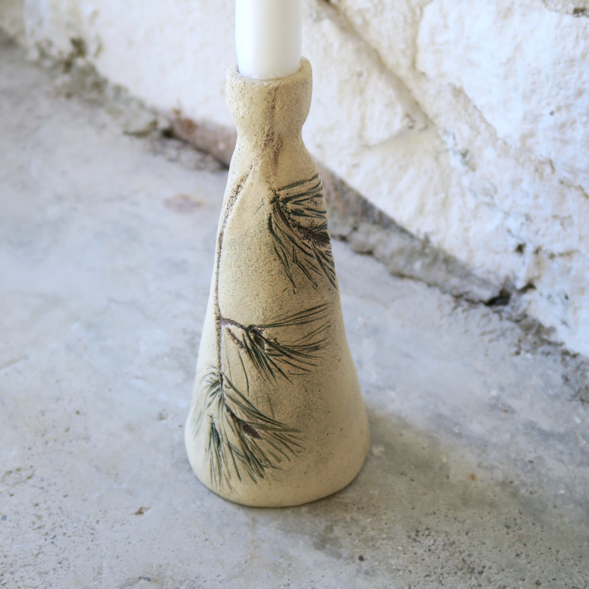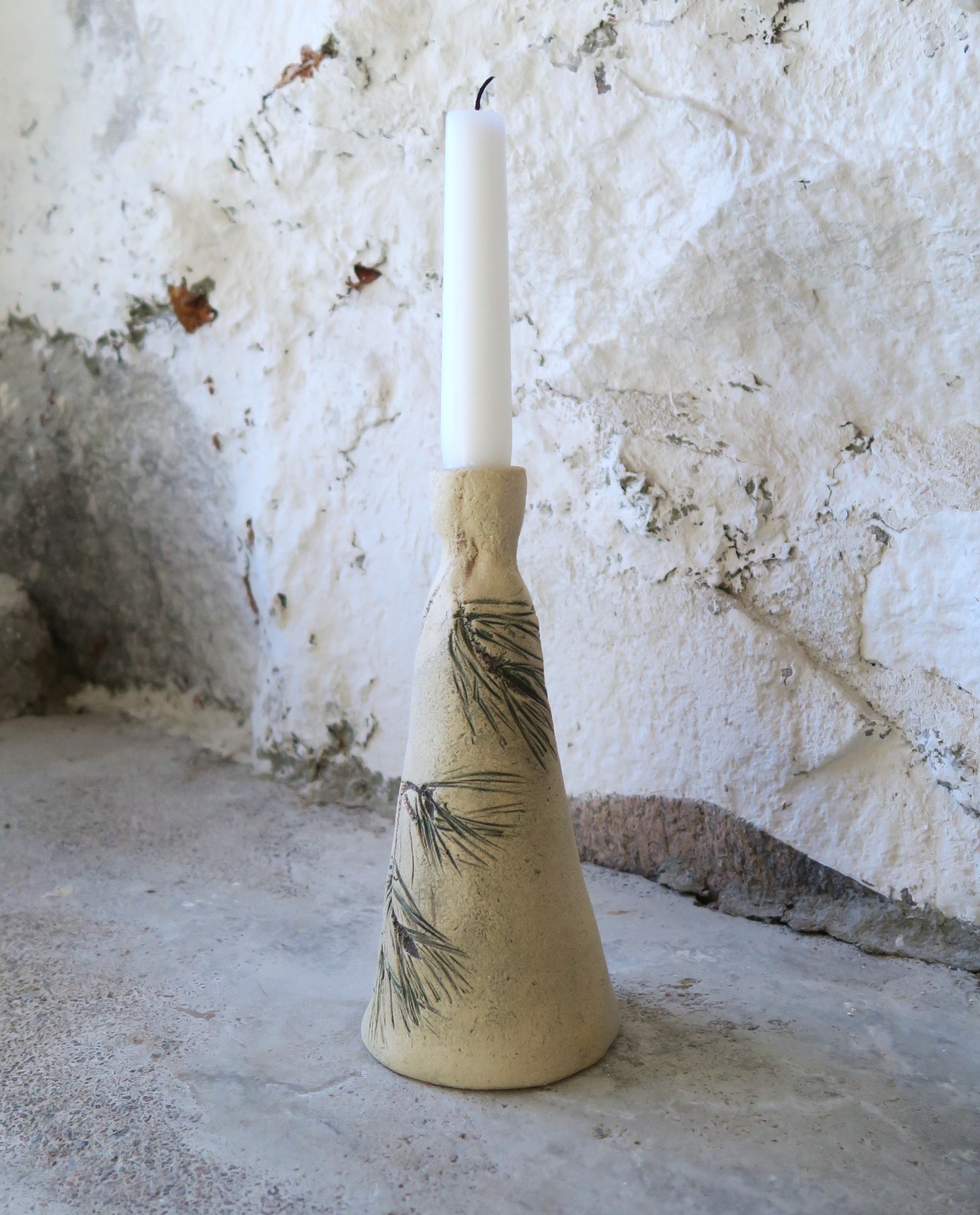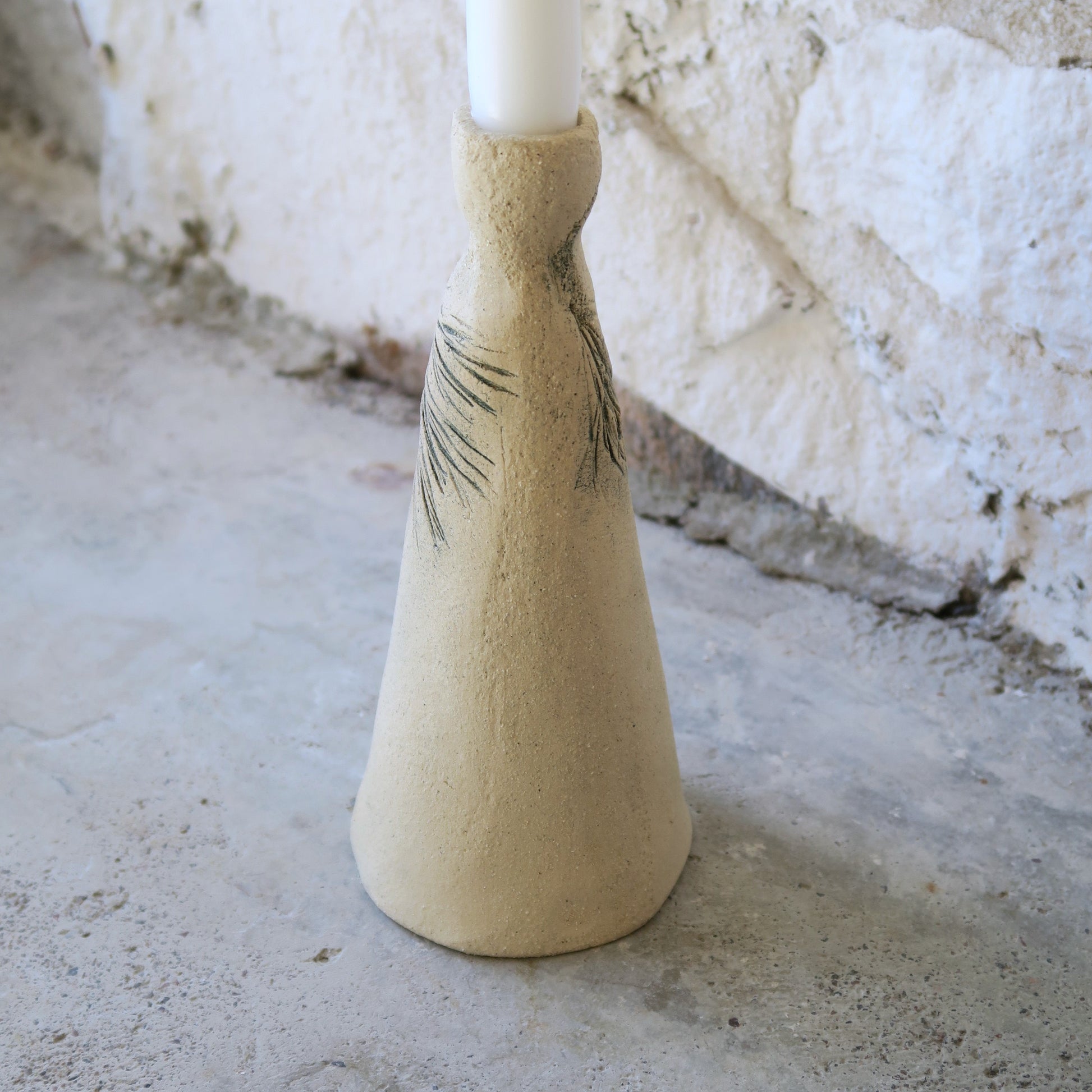 Maarit Lassilan käsin tekemä uniikki kynttilänjalka. Lasitettua keramiikkaa.