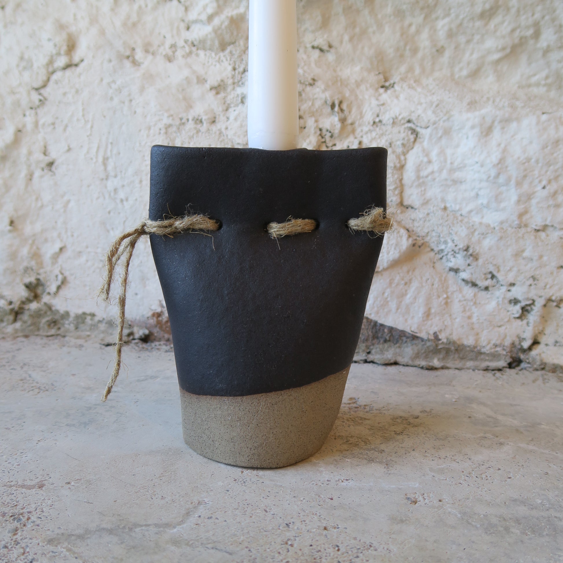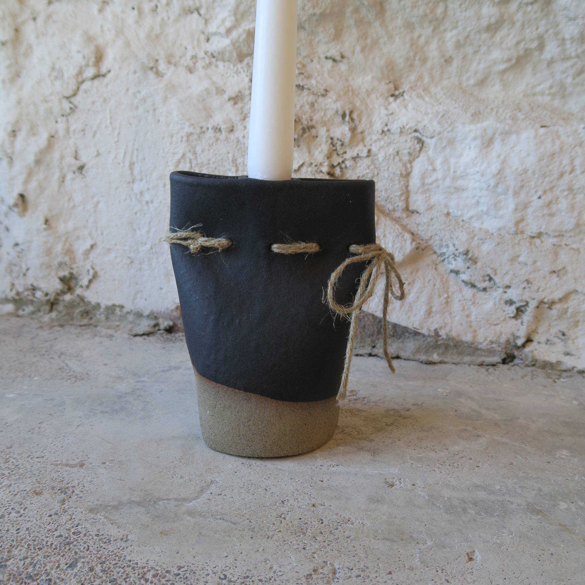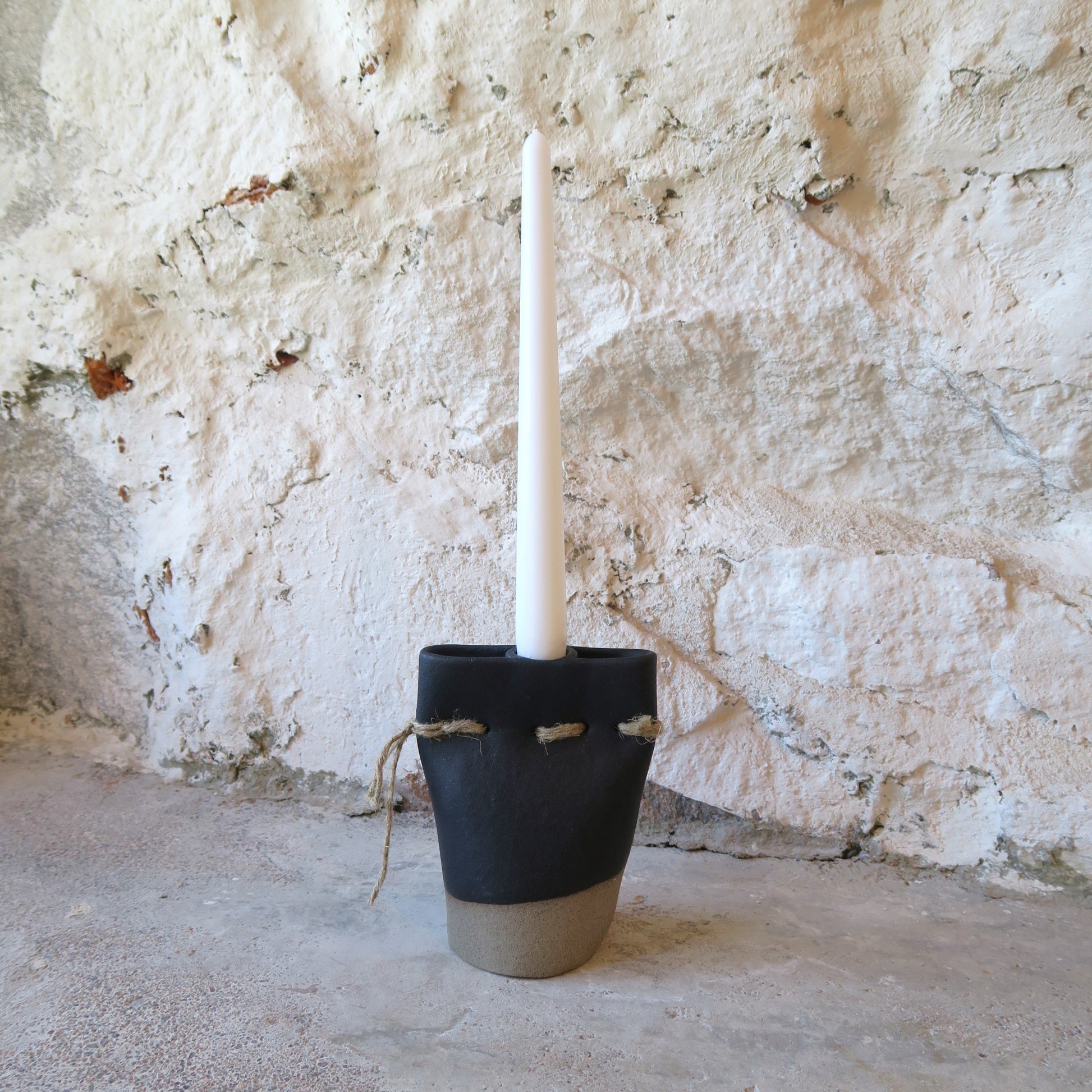 Maarit Lassilan käsin tekemä musta kynttilänjalka, jota koristaa juuttinyöri.