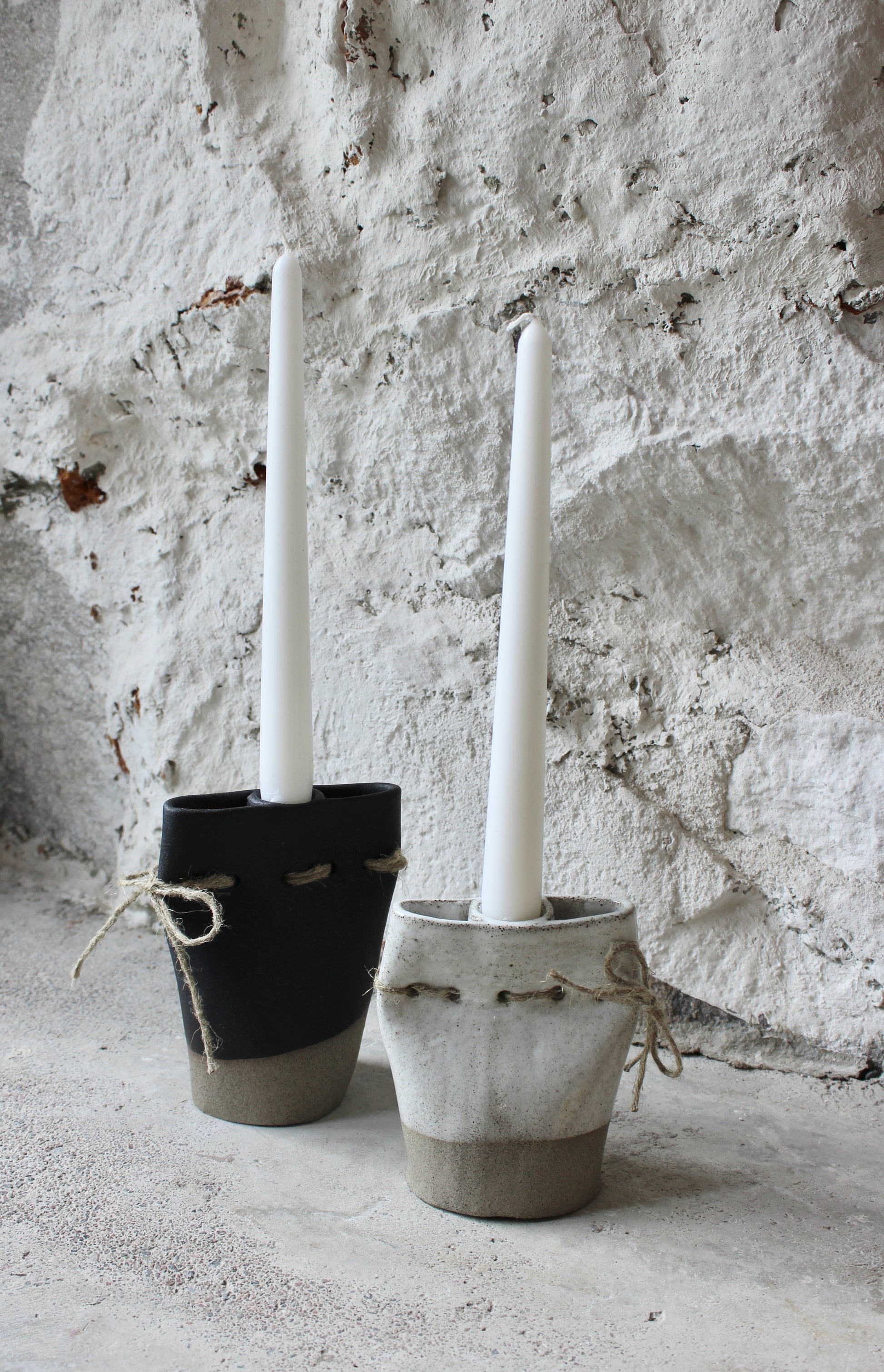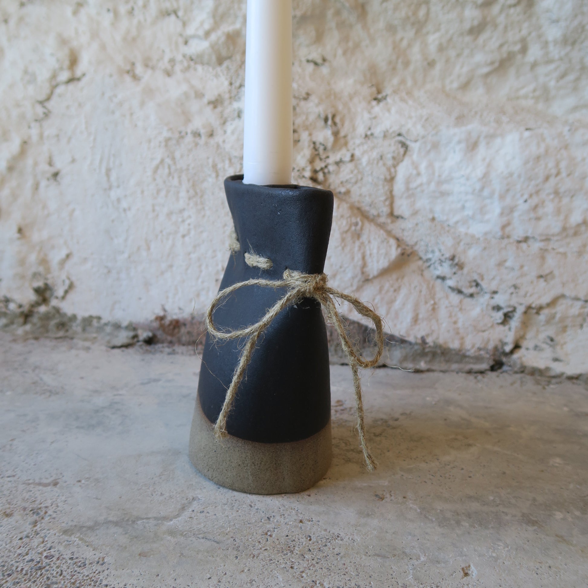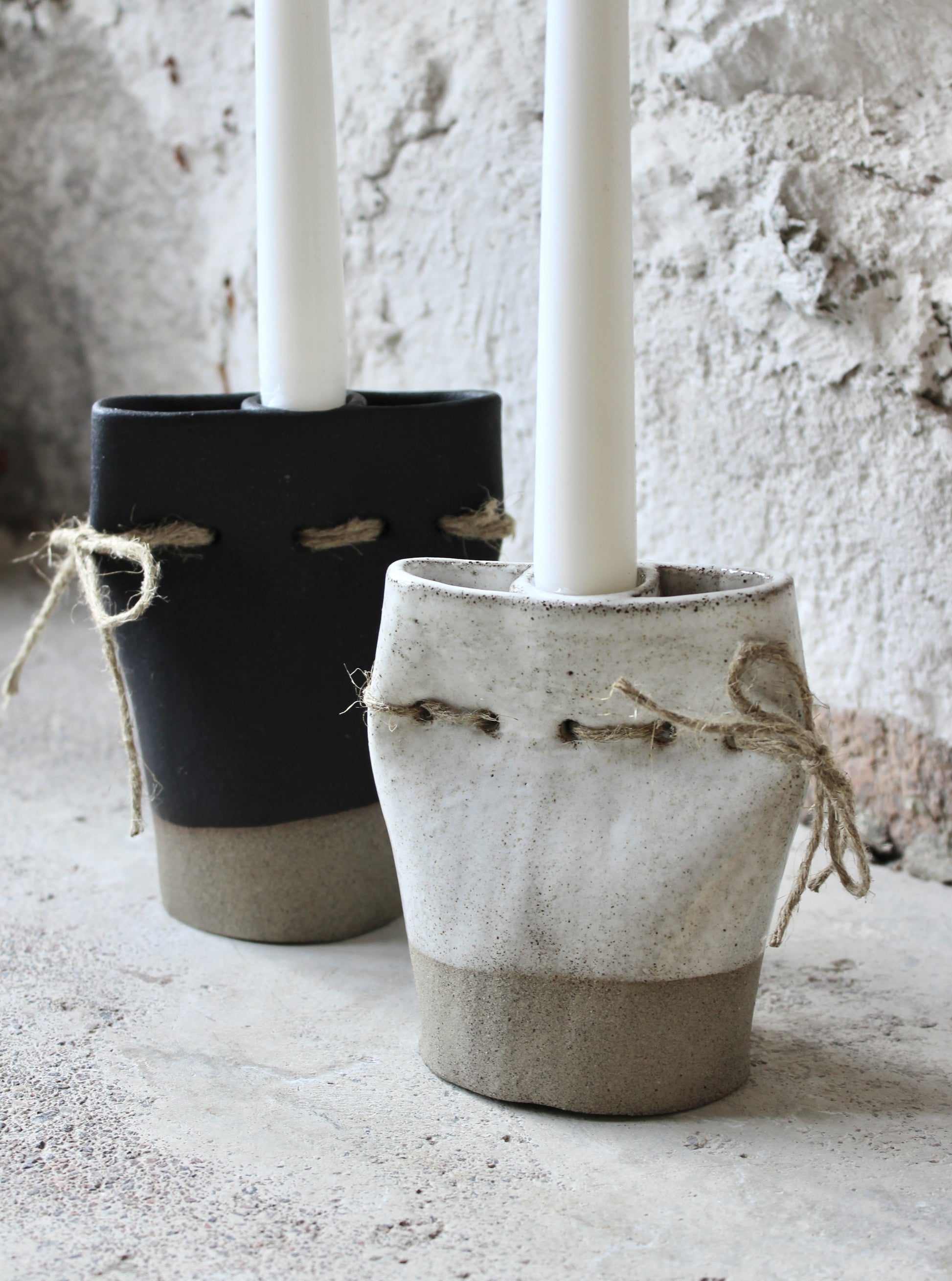 Maarit Lassilan käsin tekemä musta kynttilänjalka, jota koristaa juuttinyöri.