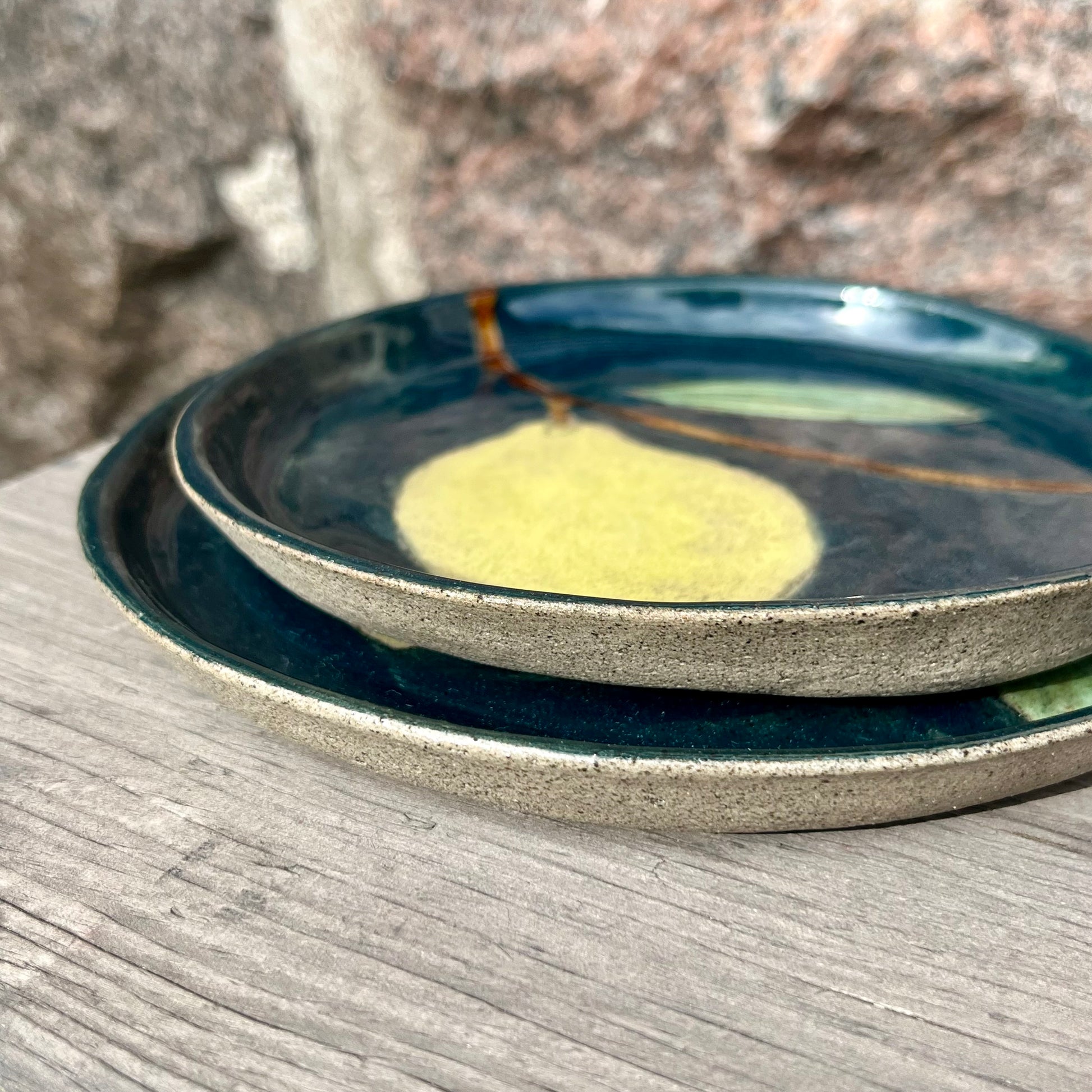 Maarit Lassilan käsin valmistama Cilla-sarjan pyöreä leipälautanen. Leipälautasista pienempi koko. Mikron, uunin ja astianpesukoneen kestävä.