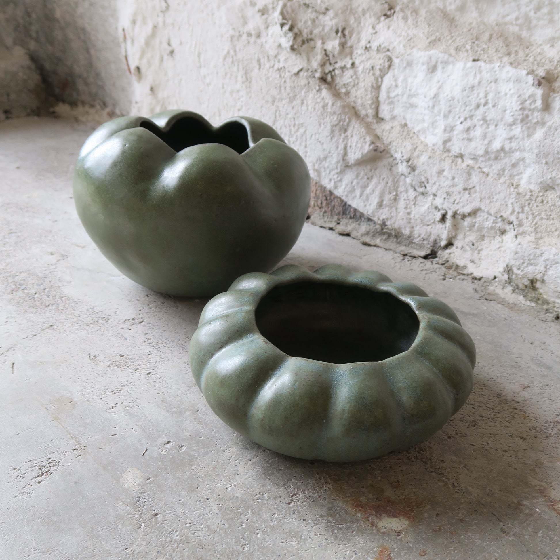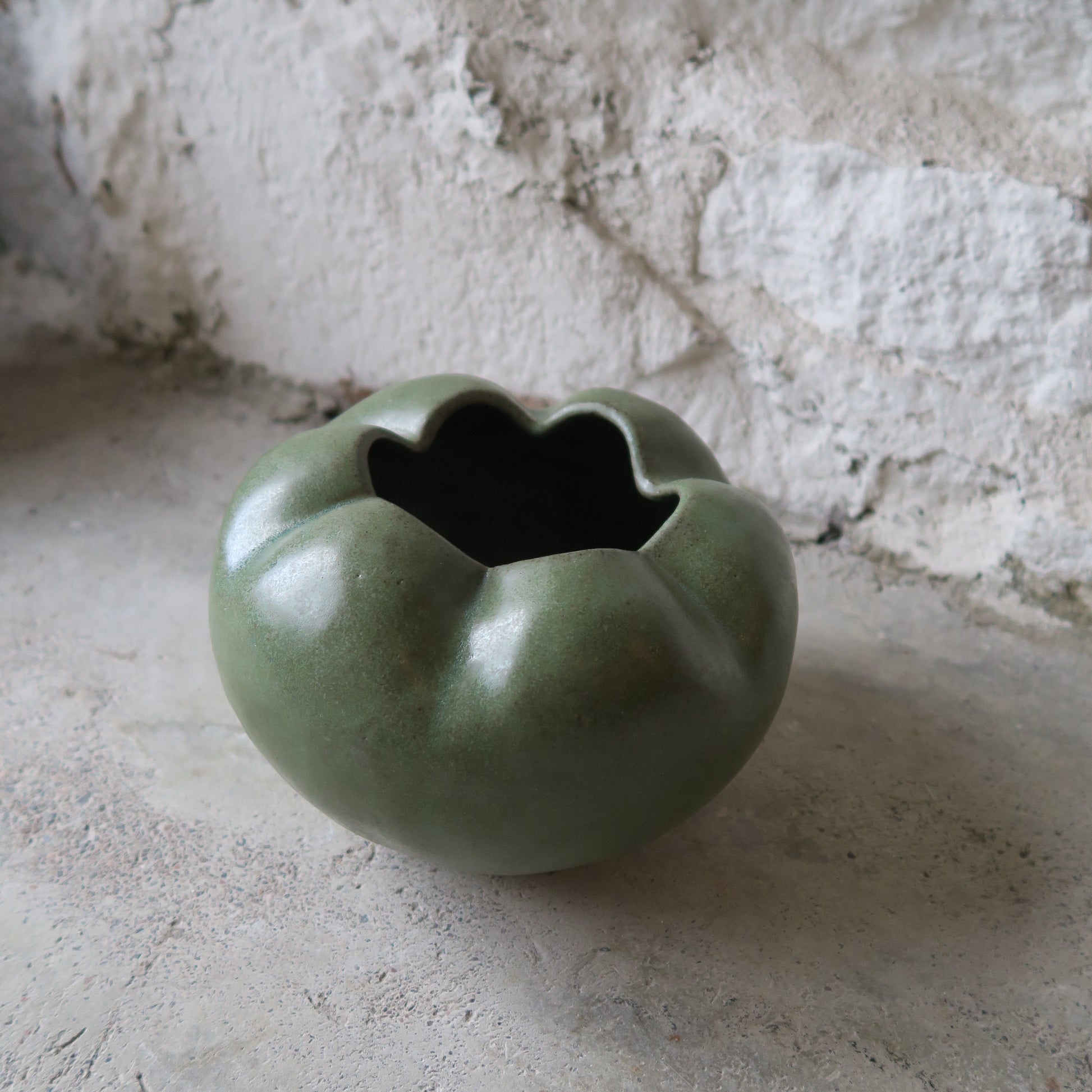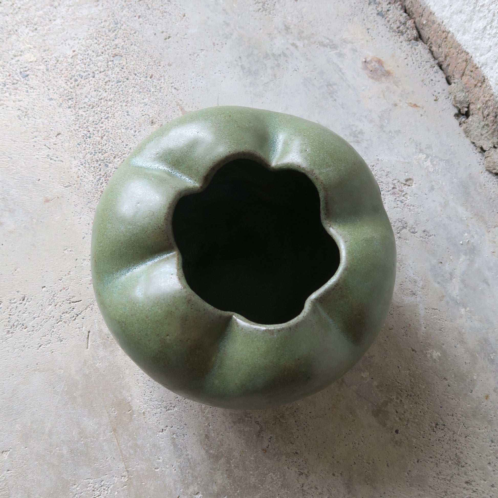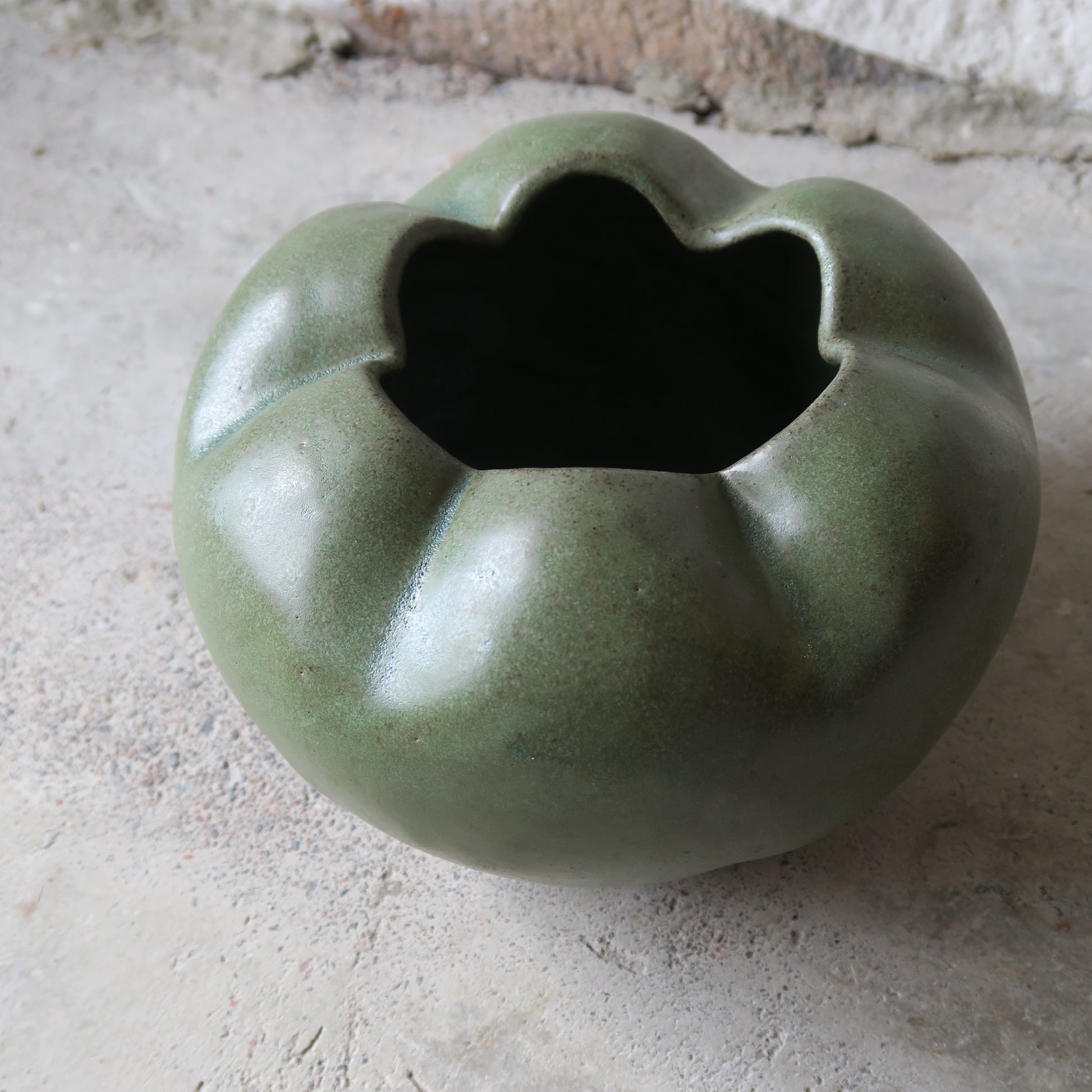 Maarit Lassilan käsin tekemä uniikki vihreä maljakko. Lasitettua keramiikkaa.