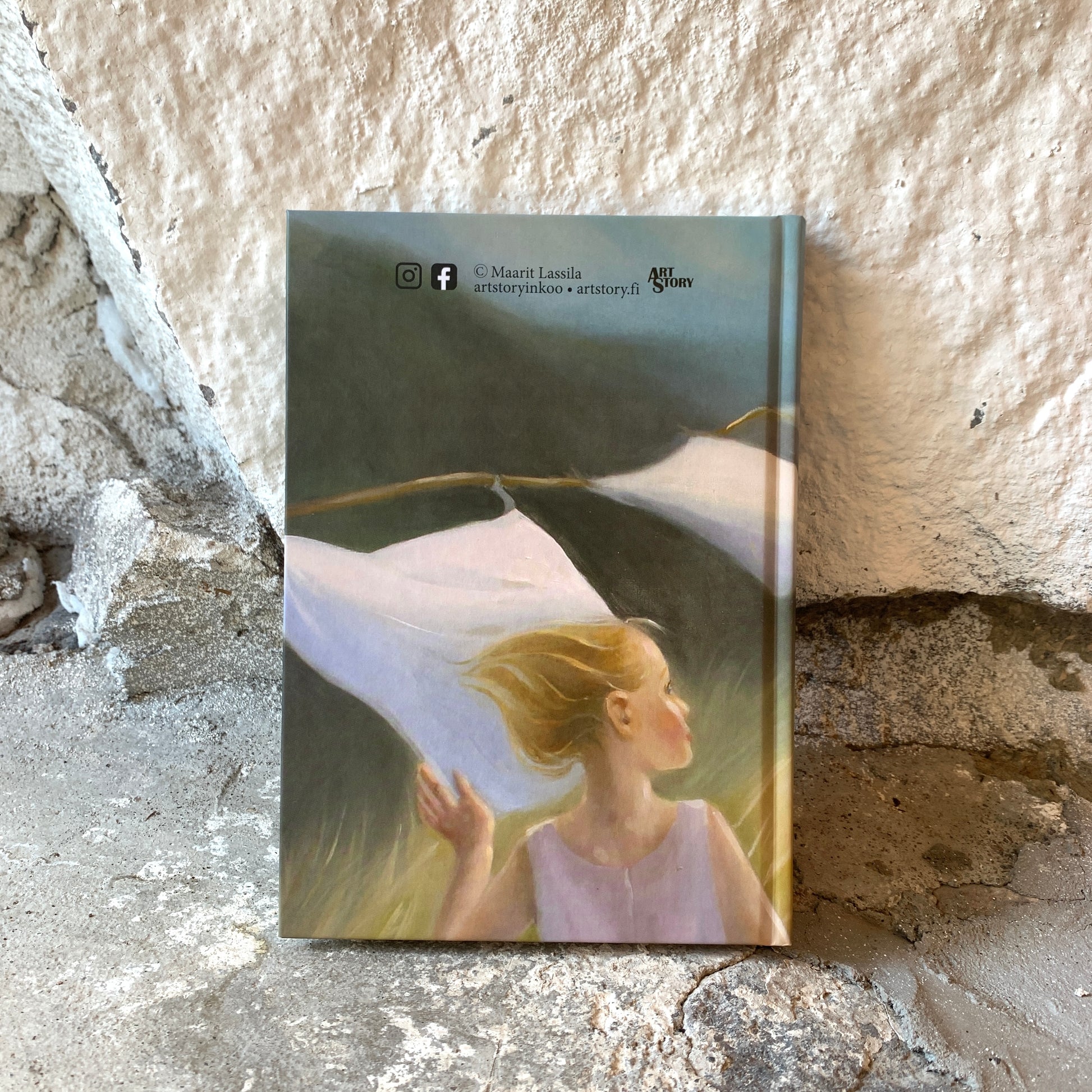 Kovakantinen muistikirja. Kannen kuosi on Maarit Lassilan maalauksesta painettu kotimaassa.Tyhjät sivut odottavat juuri sinun tarinoita, runoja ja luonnoksia, tai vaikka vieraiden lämpimiä viestejä vieraskirjana.