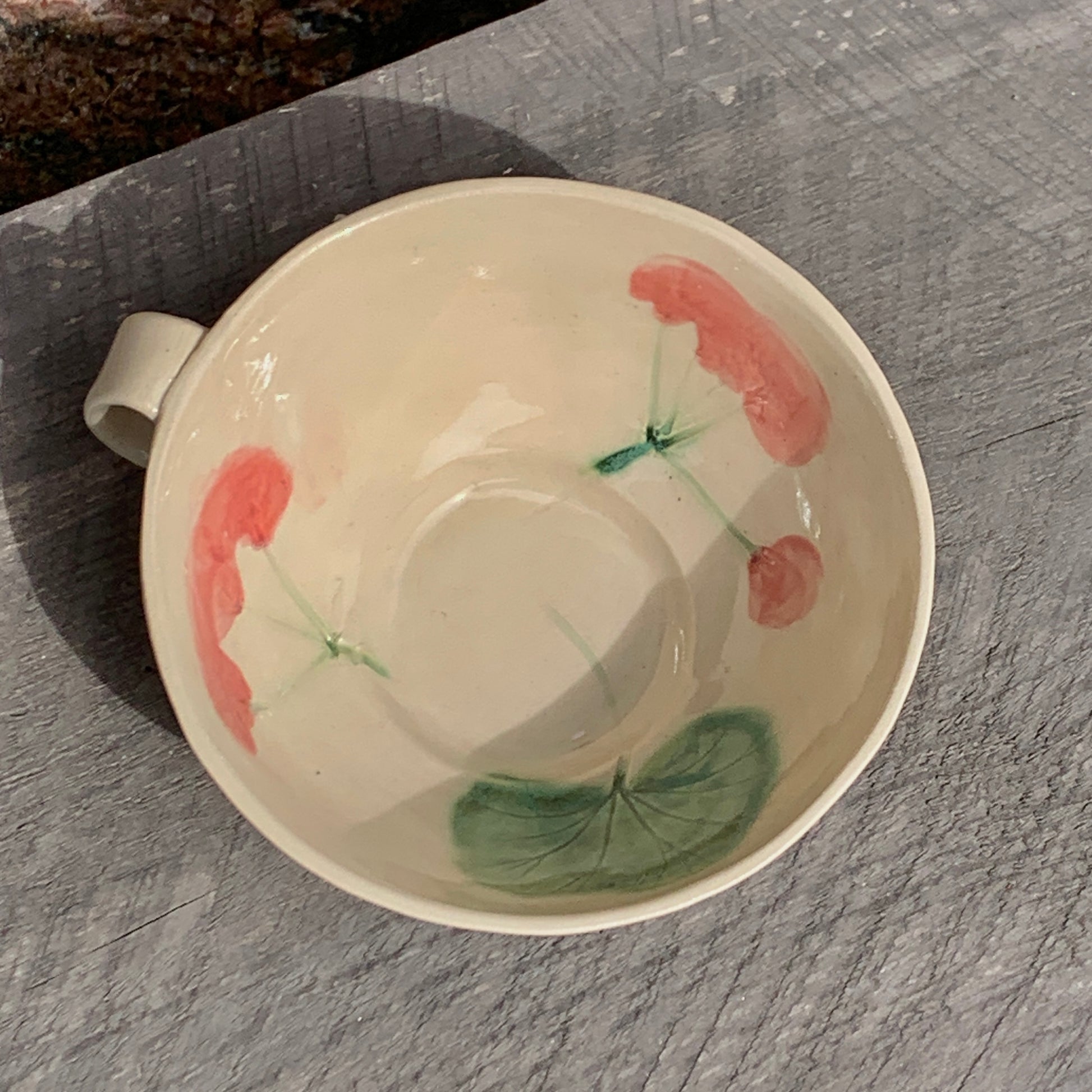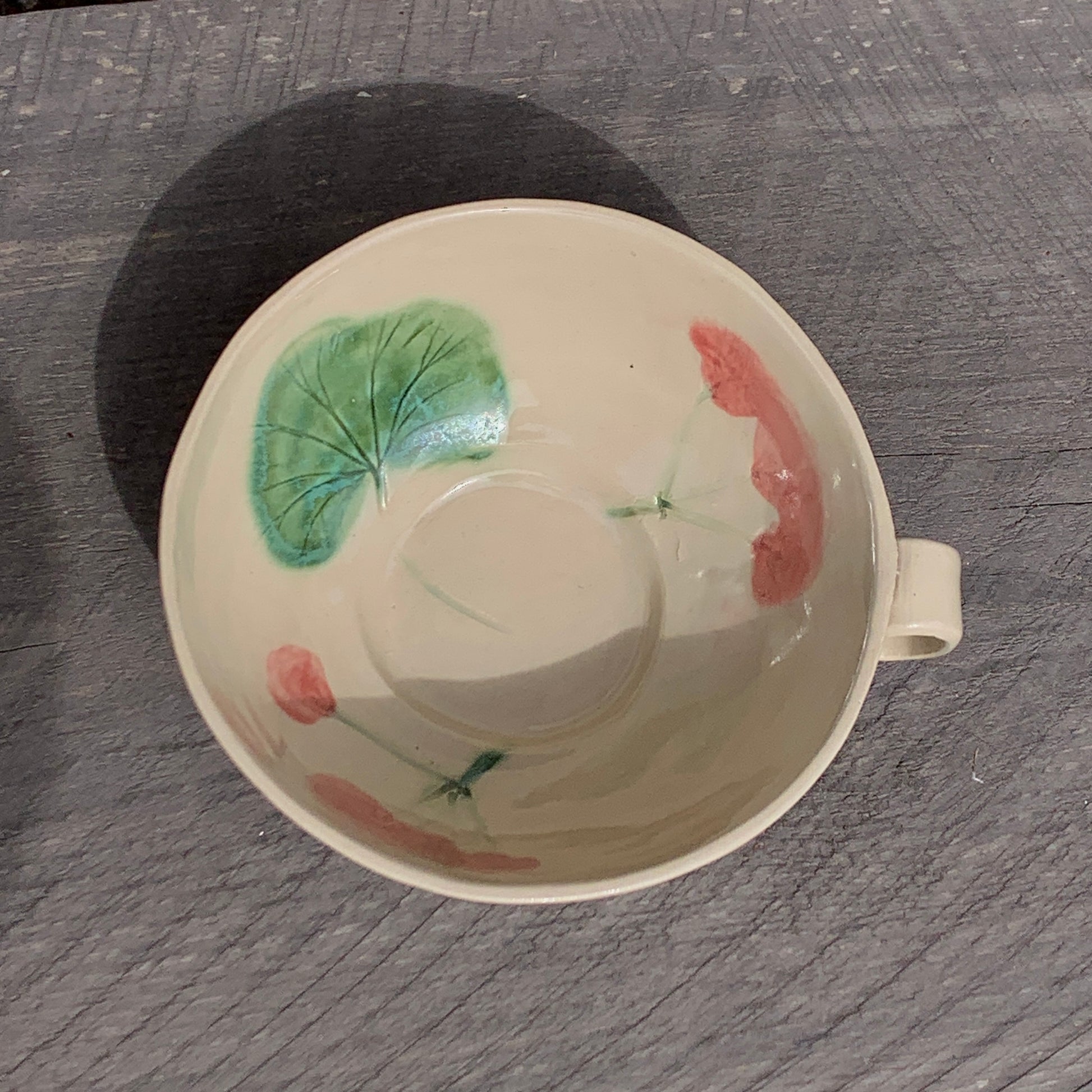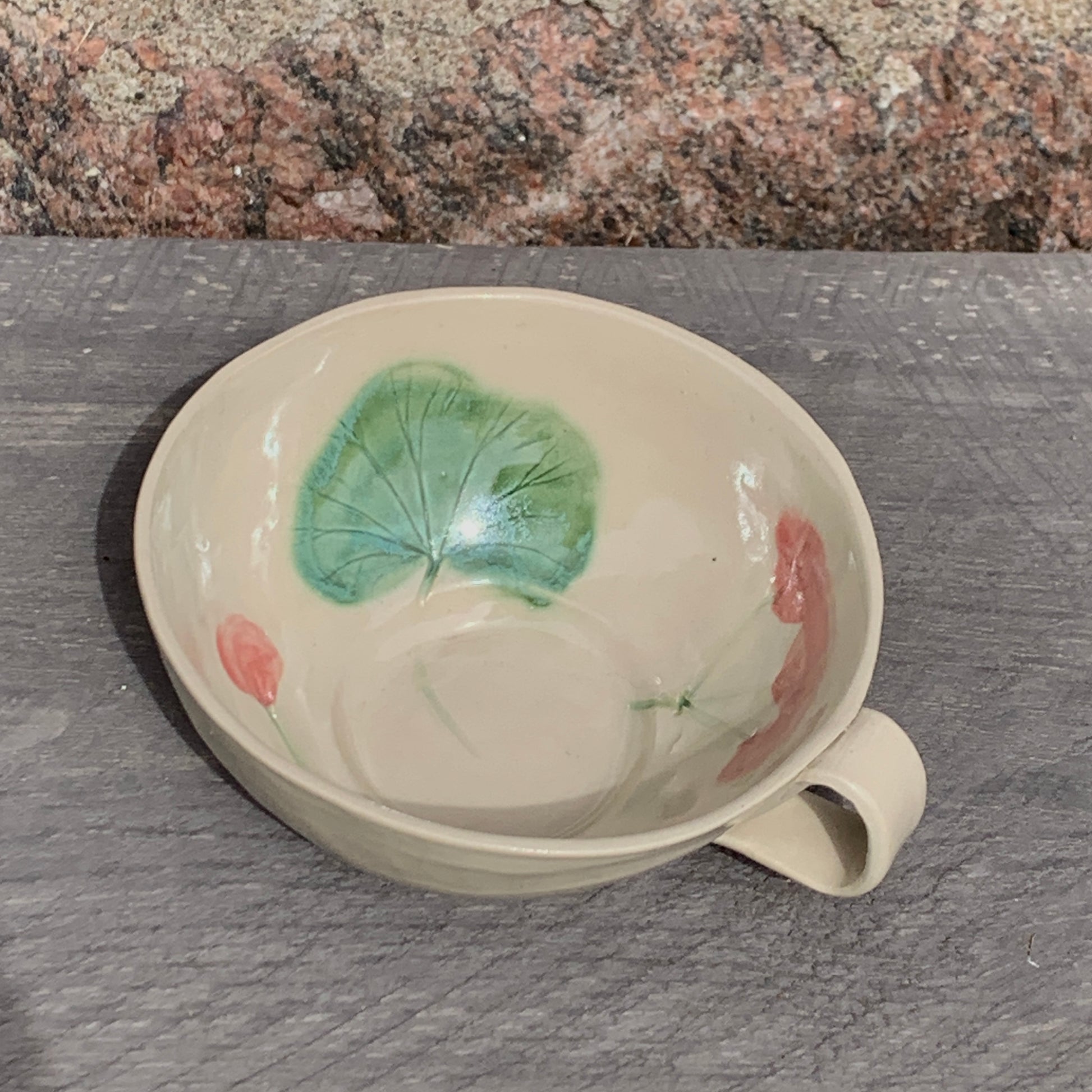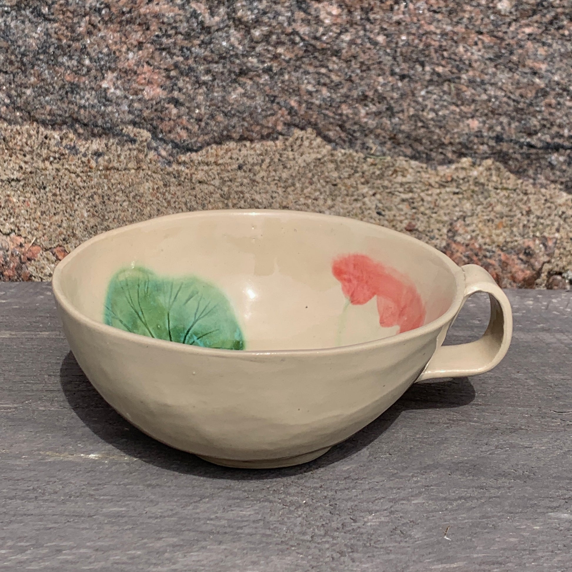Maarit Lassilan käsin valmistama ja maalaama suuri latte/teemuki. Voi käyttää myös kulhona. Jokainen kappale on uniikki, sillä valmistuksessa käytetään aitoja pelargonin lehtiä ja kukkia. Valmistettu kivitavarasta, mikä kestää uunin, mikron ja astianpesukoneen.