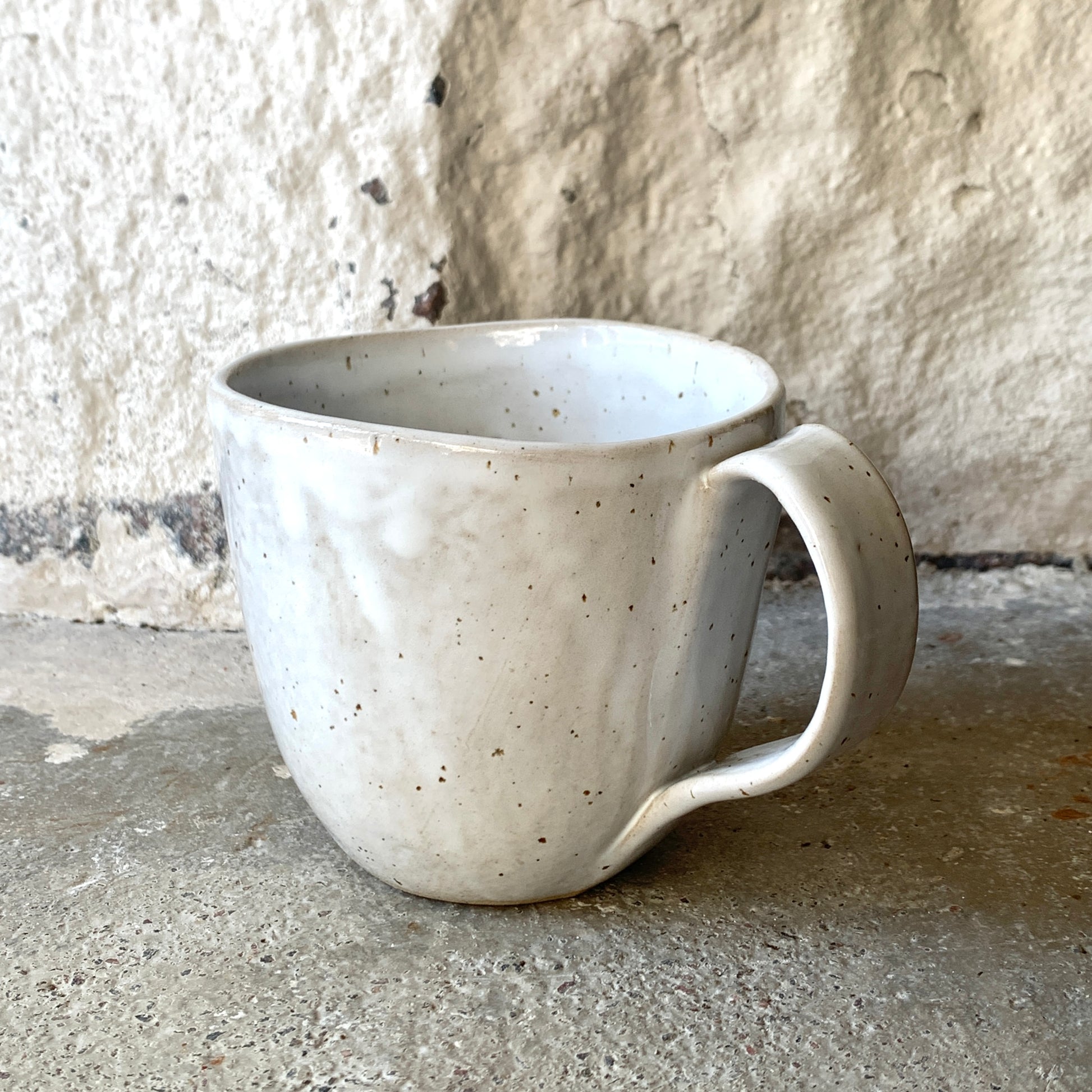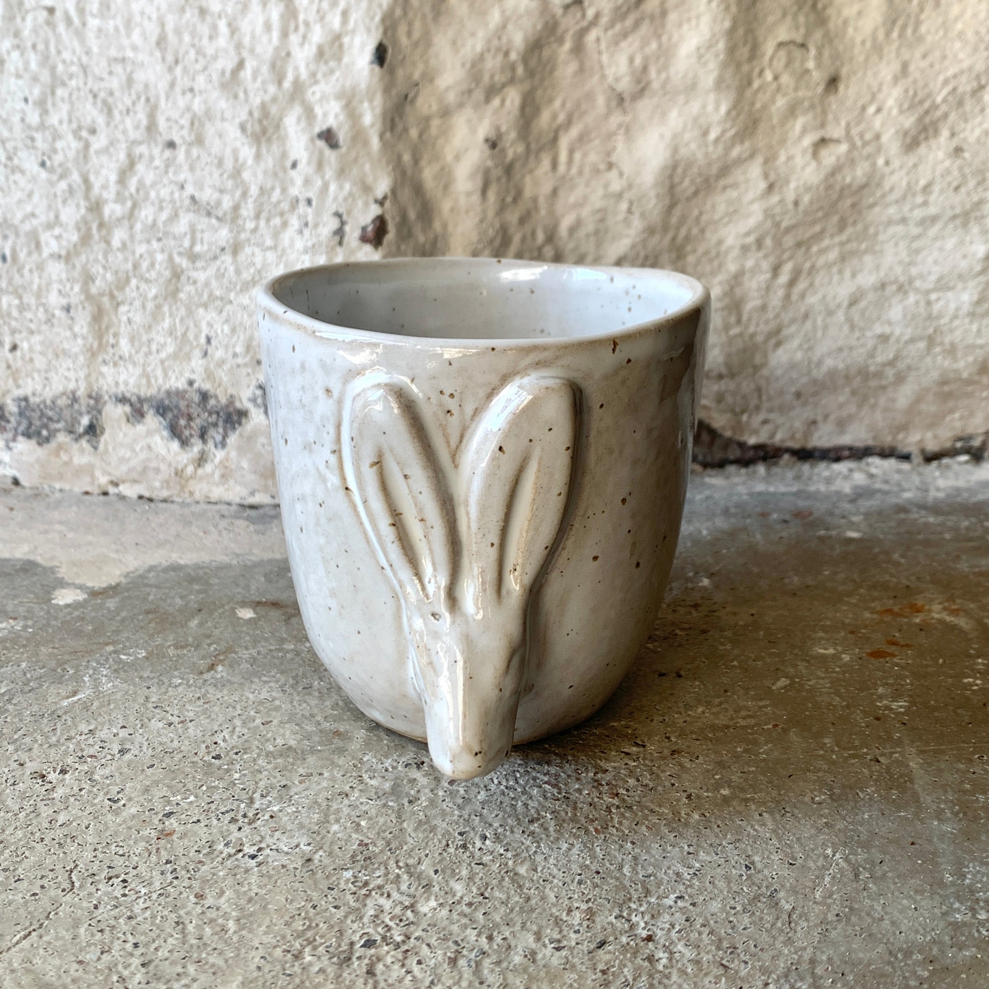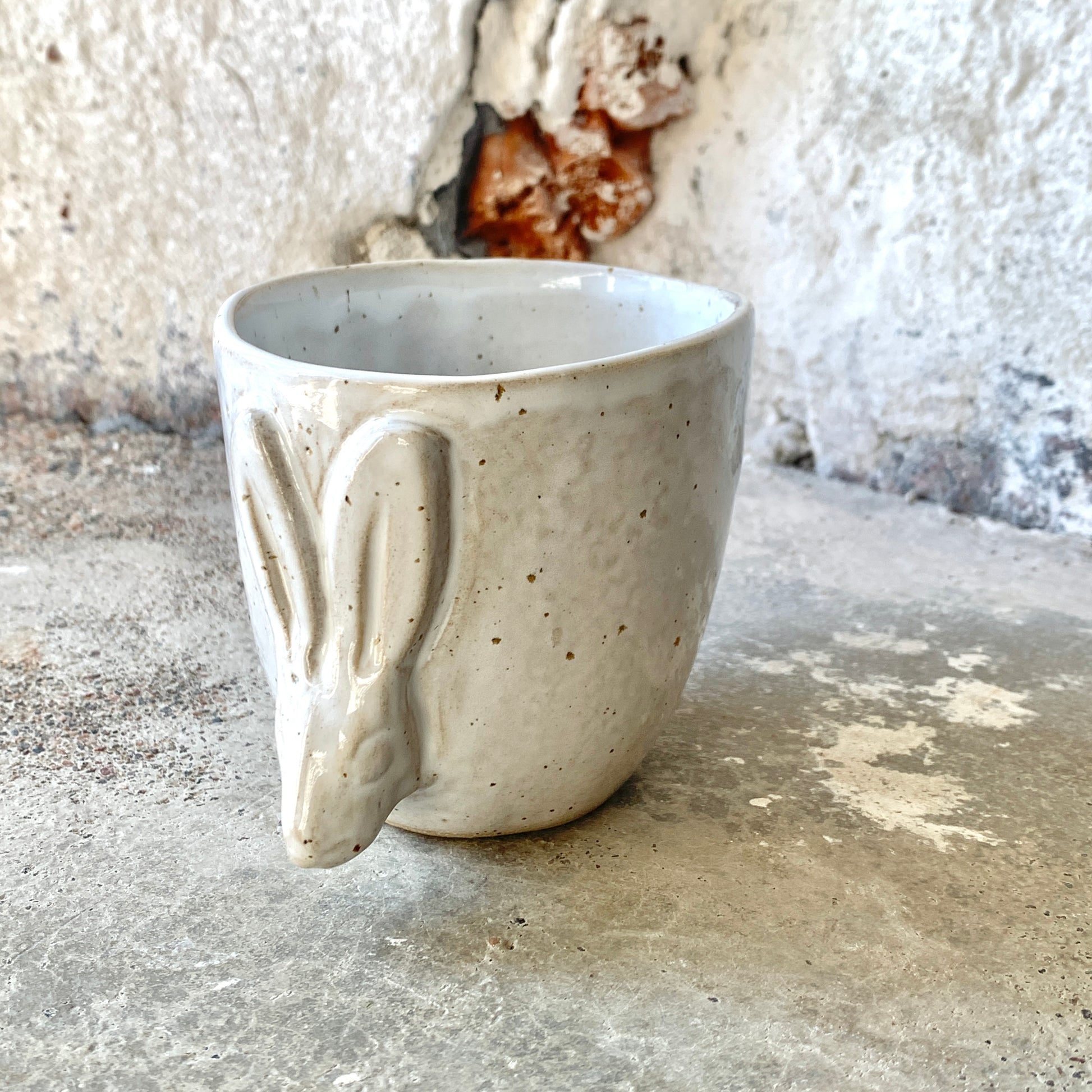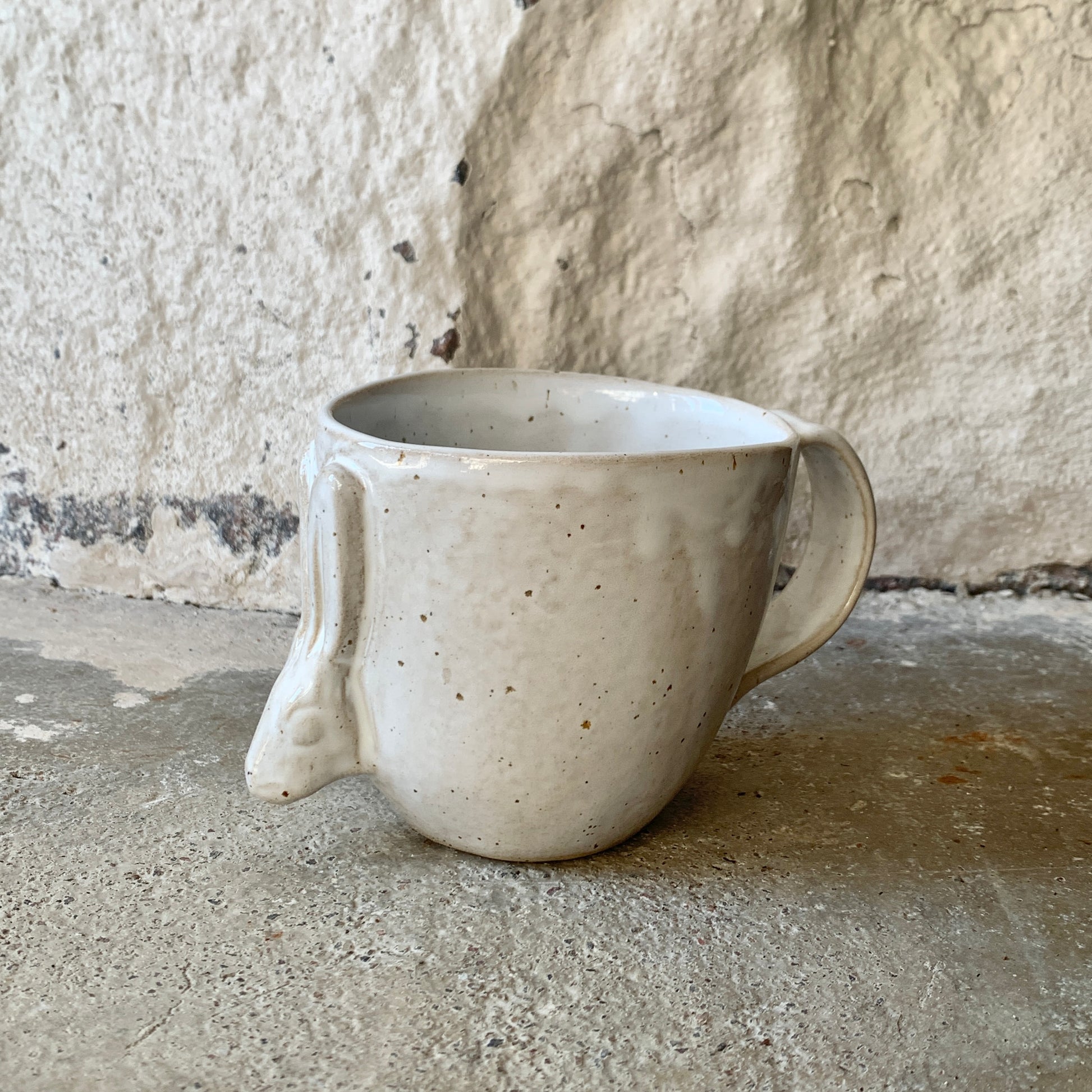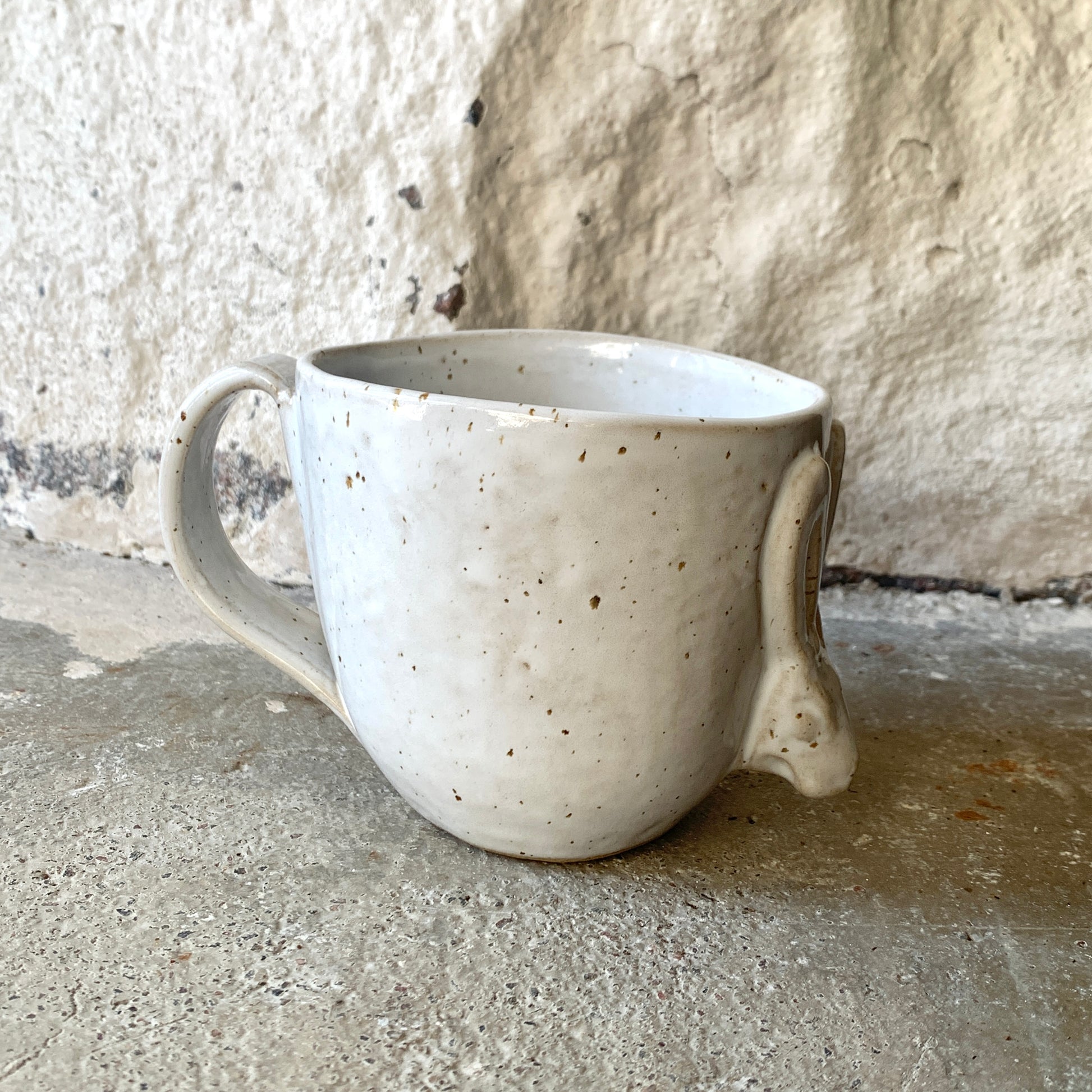 Maarit Lassilan käsin valmistama suuri pupumuki. Pilkkusavi ja valkoinen lasite.