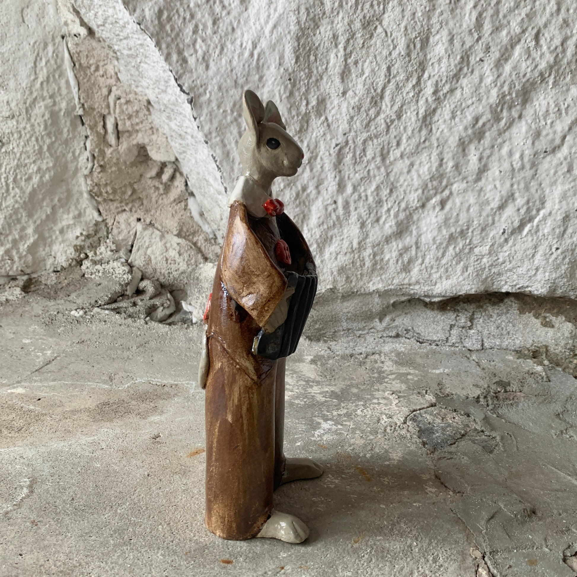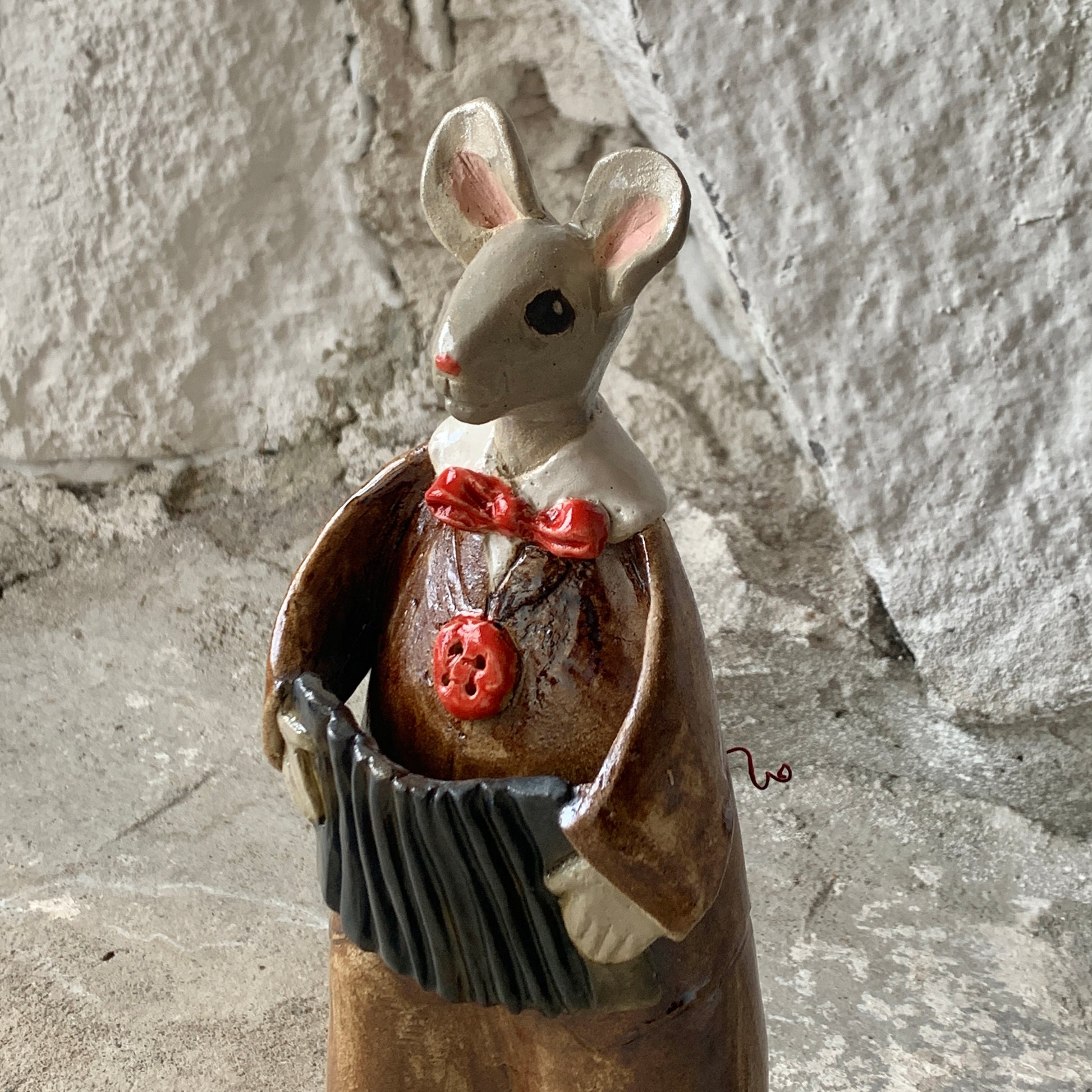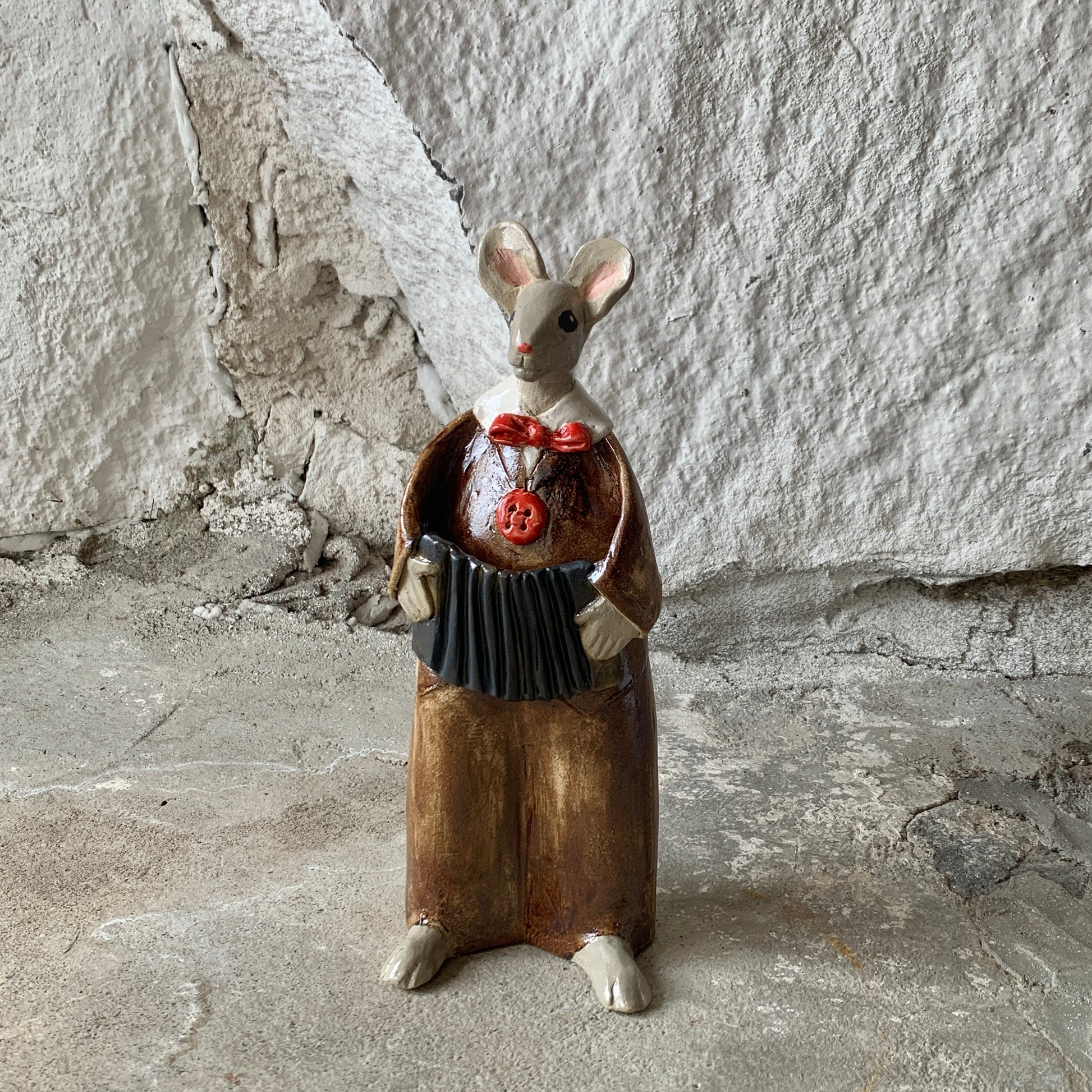 Maarit Lassilan uniikki keraaminen haitaria soittava hiiri-veistos.