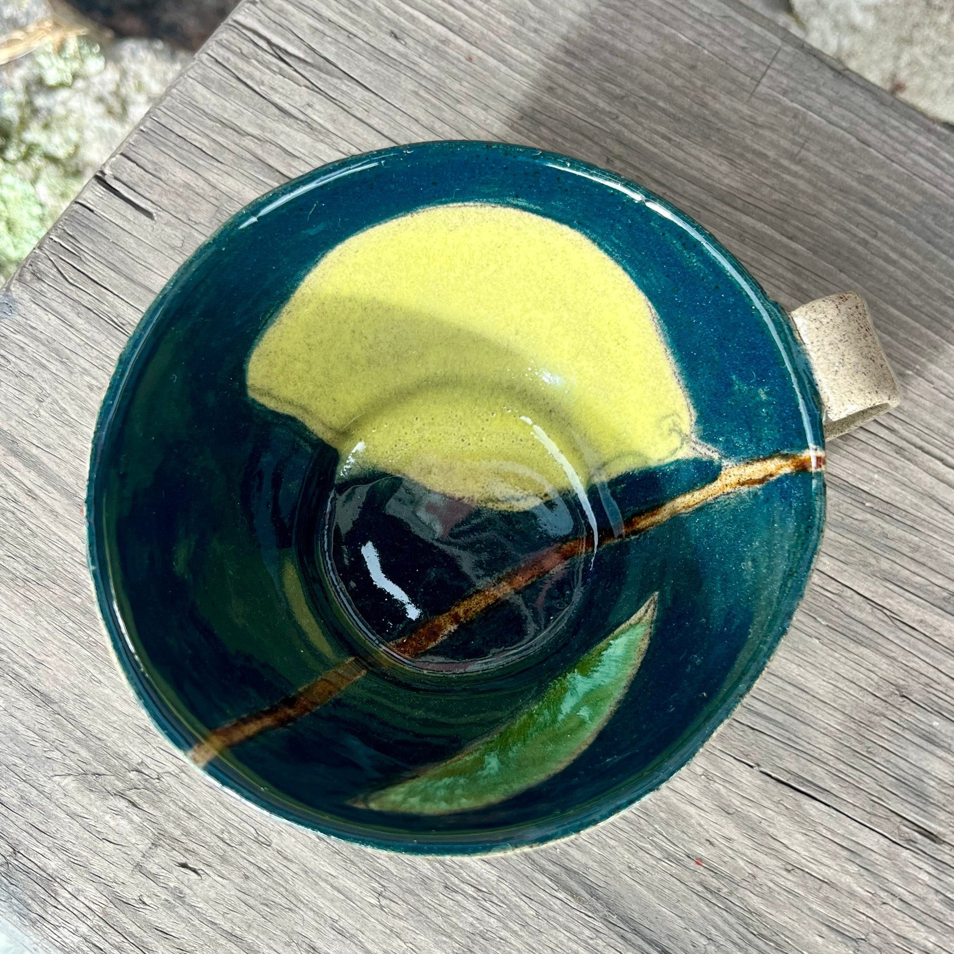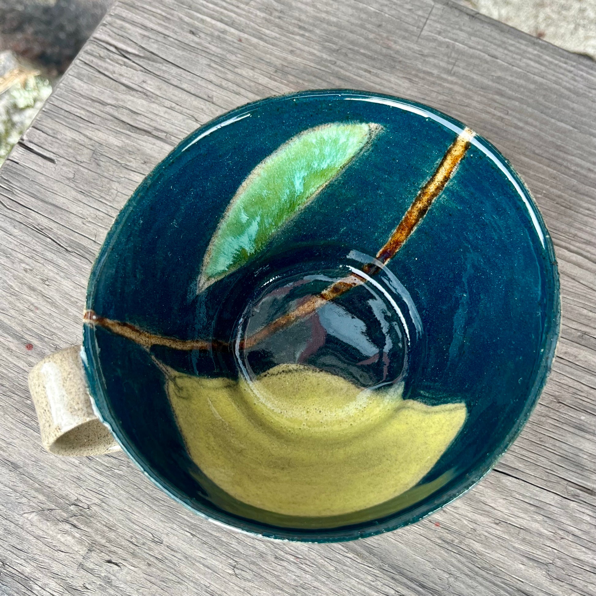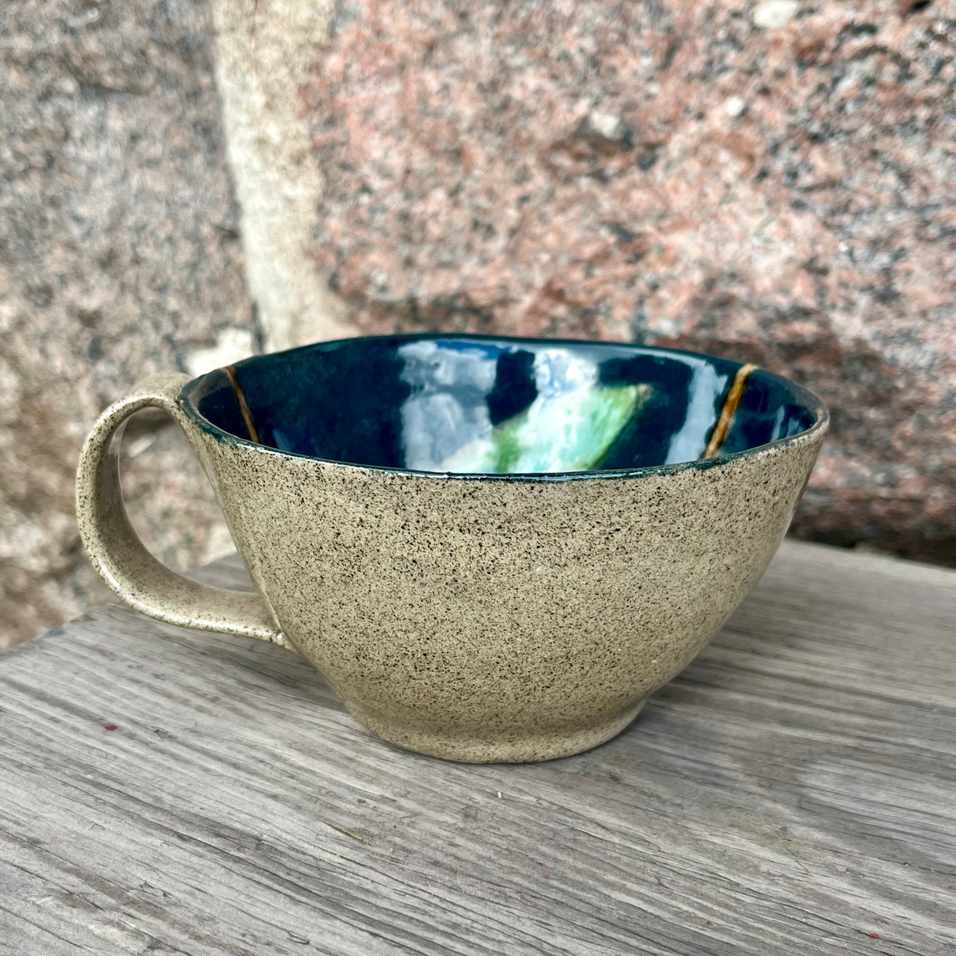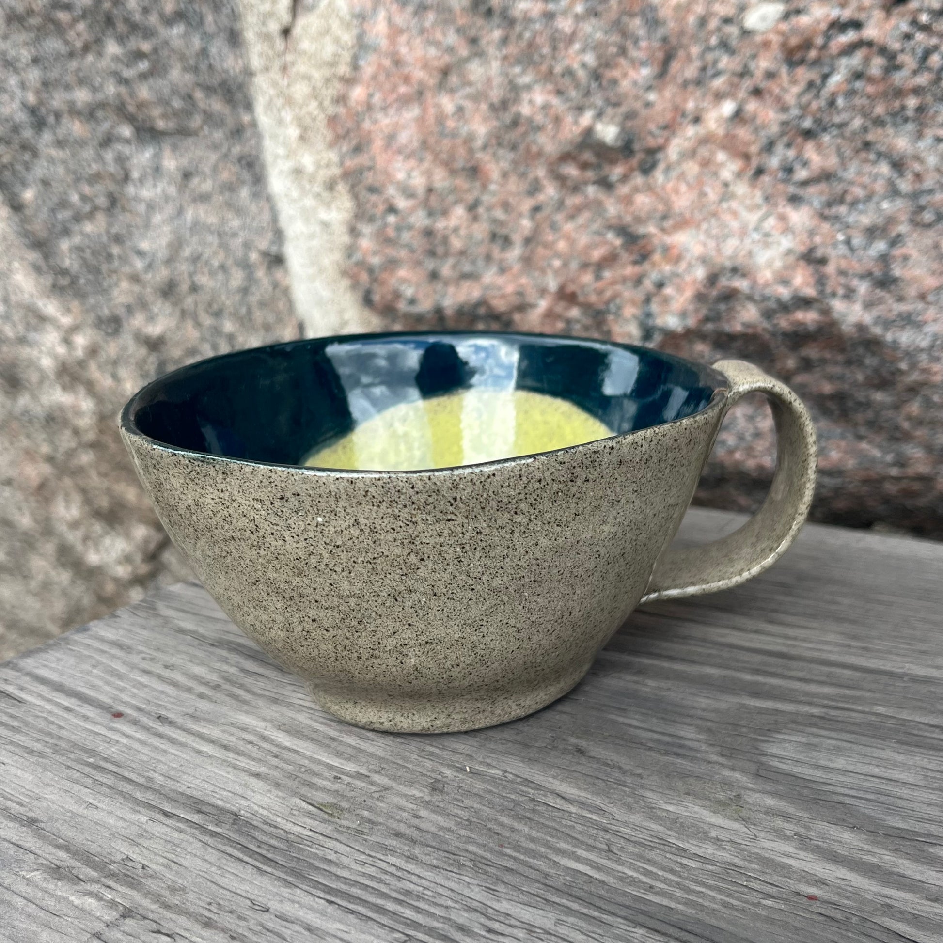Maarit Lassilan käsin valmistama ja maalaama cappuccinomuki sitruunalla. Astianpesukoneen, mikron ja uunin kestävä. Jokainen sitruunamuki on omanlaisensa uniikki kappale.
