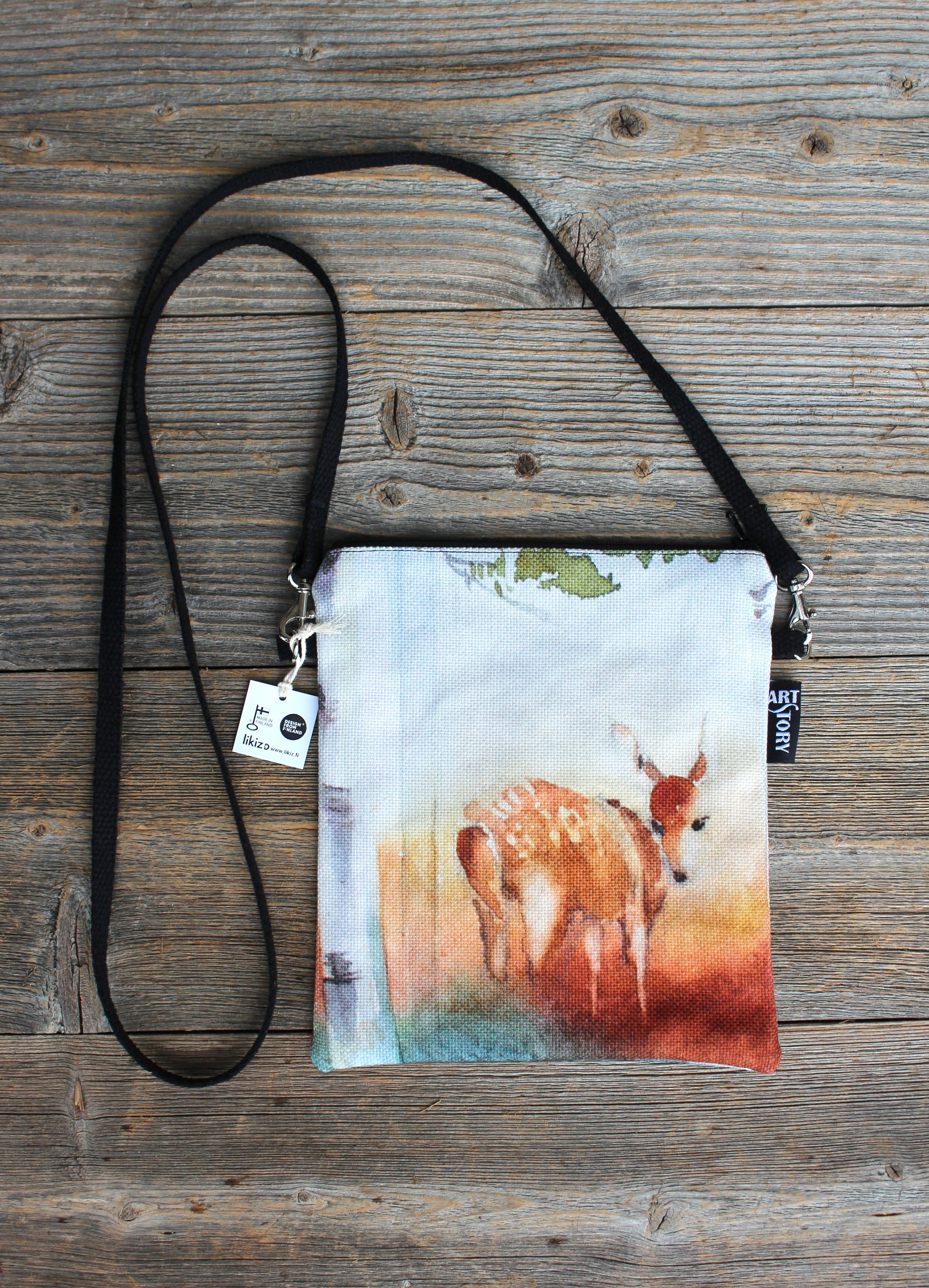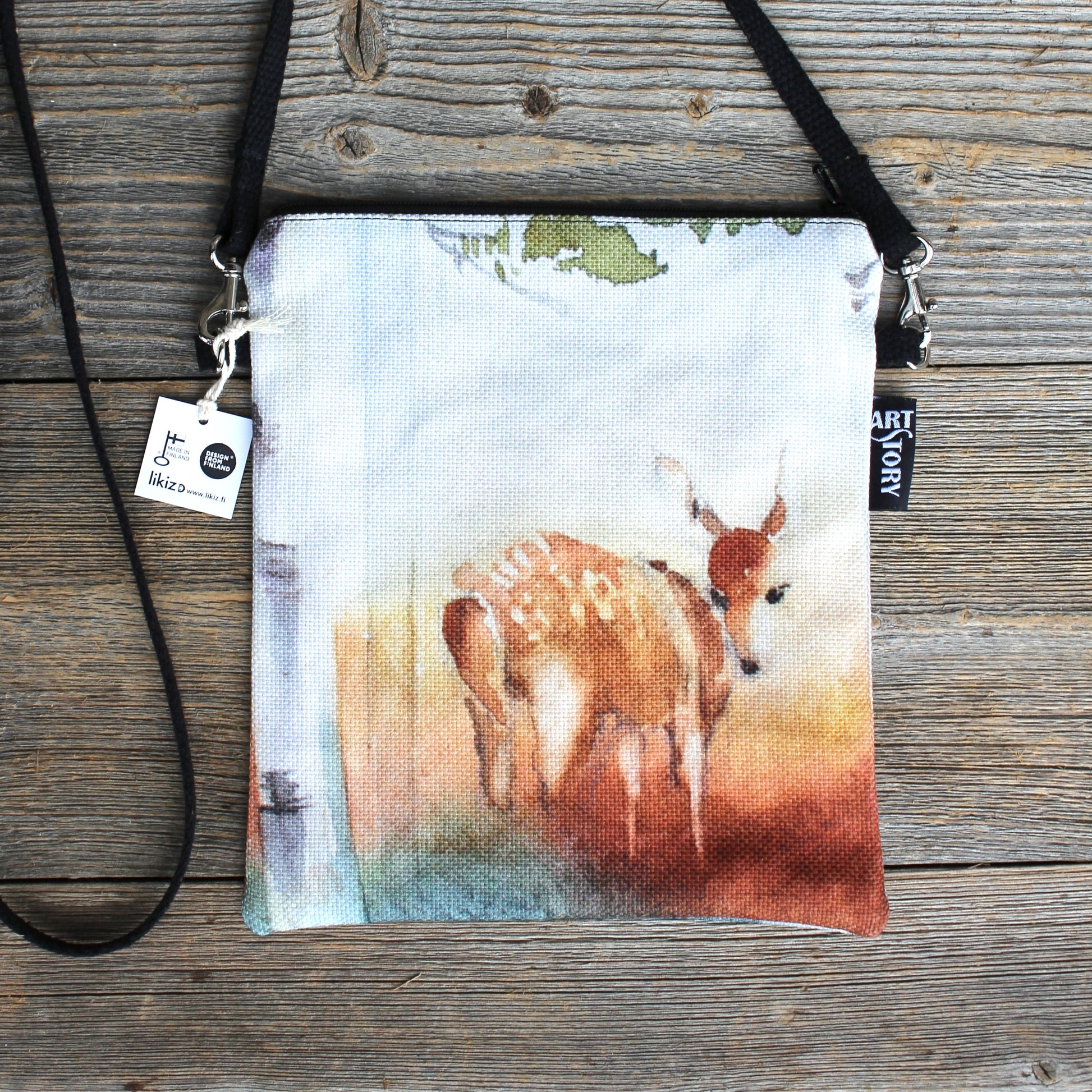 Käytännöllinen olkalaukku, joka on juuri sopiva kännykälle ja lompakolle. Materiaalina on paksu BCI-sertifioitu 100 % puuvillacanvas, jolle on digipainettu Maarit Lassilan maalaus käsintehdyn originaalin mukaan. Kuosi on kassin molemmilla puolilla. Vaaleanpunainen vuori 100 % puuvillaa.
