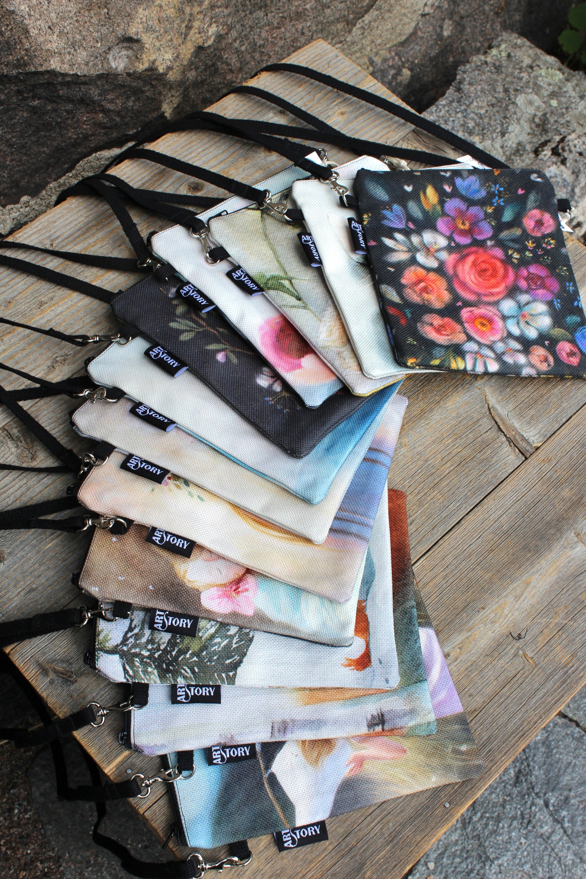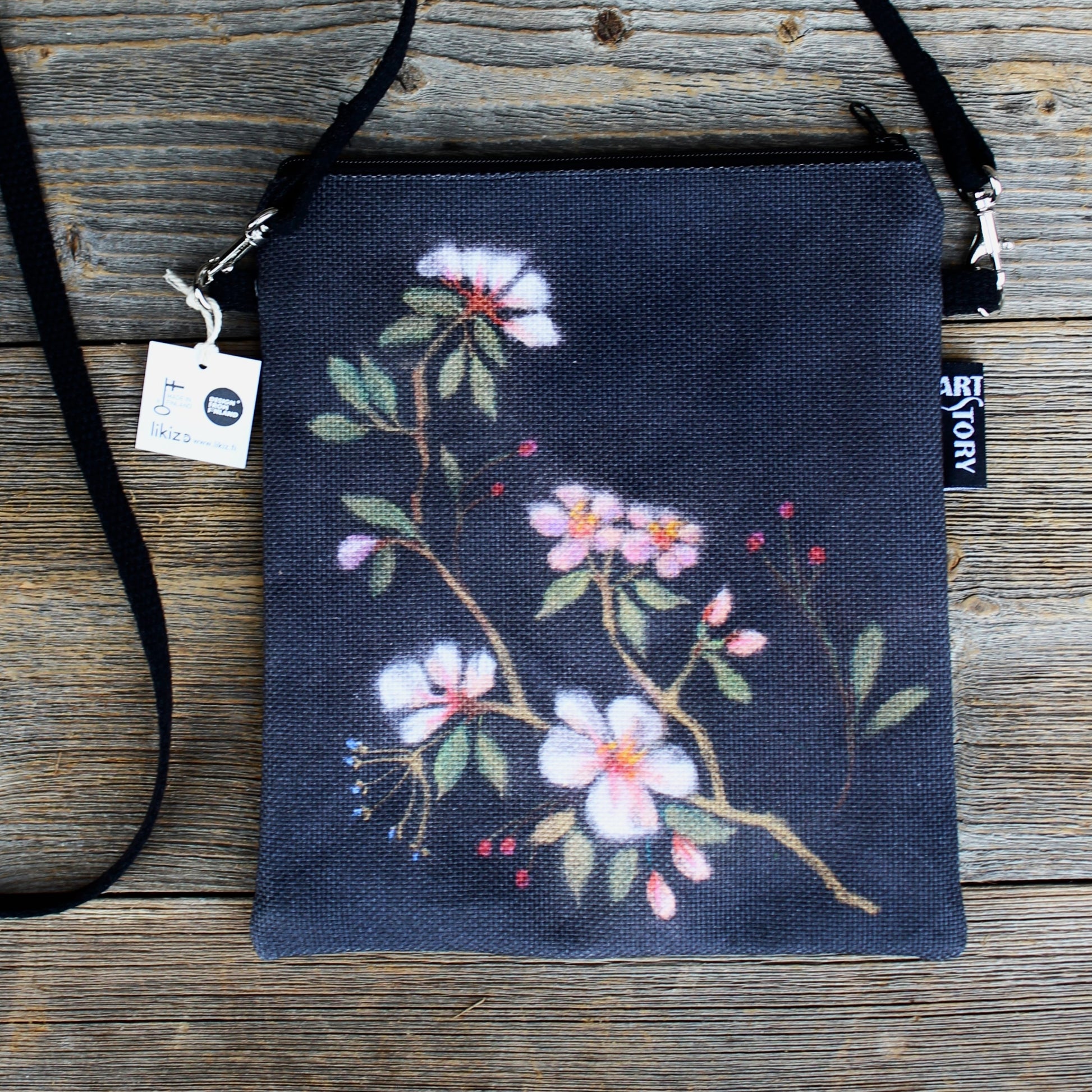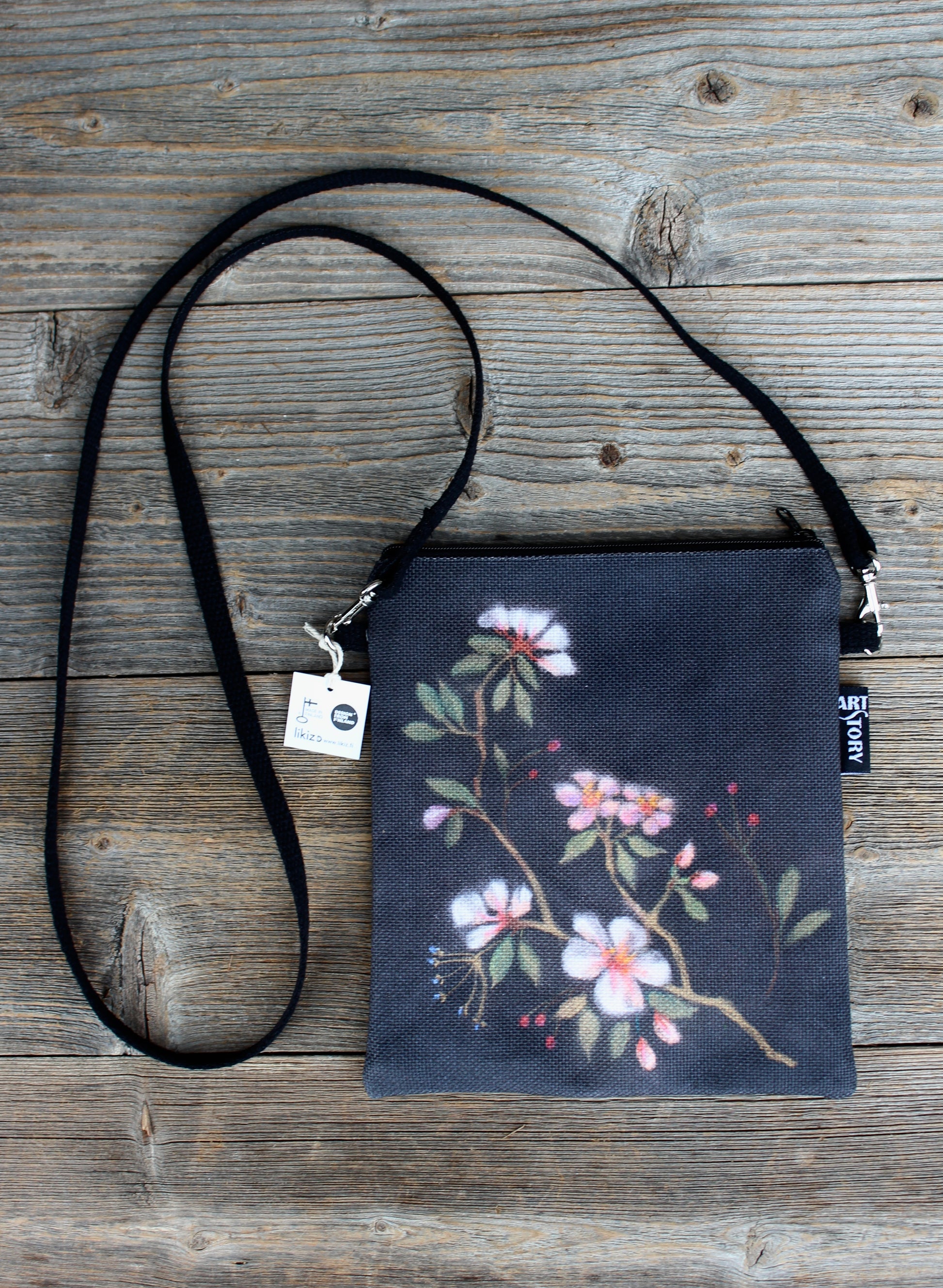 Käytännöllinen olkalaukku, joka on juuri sopiva kännykälle ja lompakolle. Materiaalina on paksu BCI-sertifioitu 100 % puuvillacanvas, jolle on digipainettu Maarit Lassilan maalaus käsintehdyn originaalin mukaan. Kuosi on kassin molemmilla puolilla. Vaaleanpunainen vuori 100 % puuvillaa.