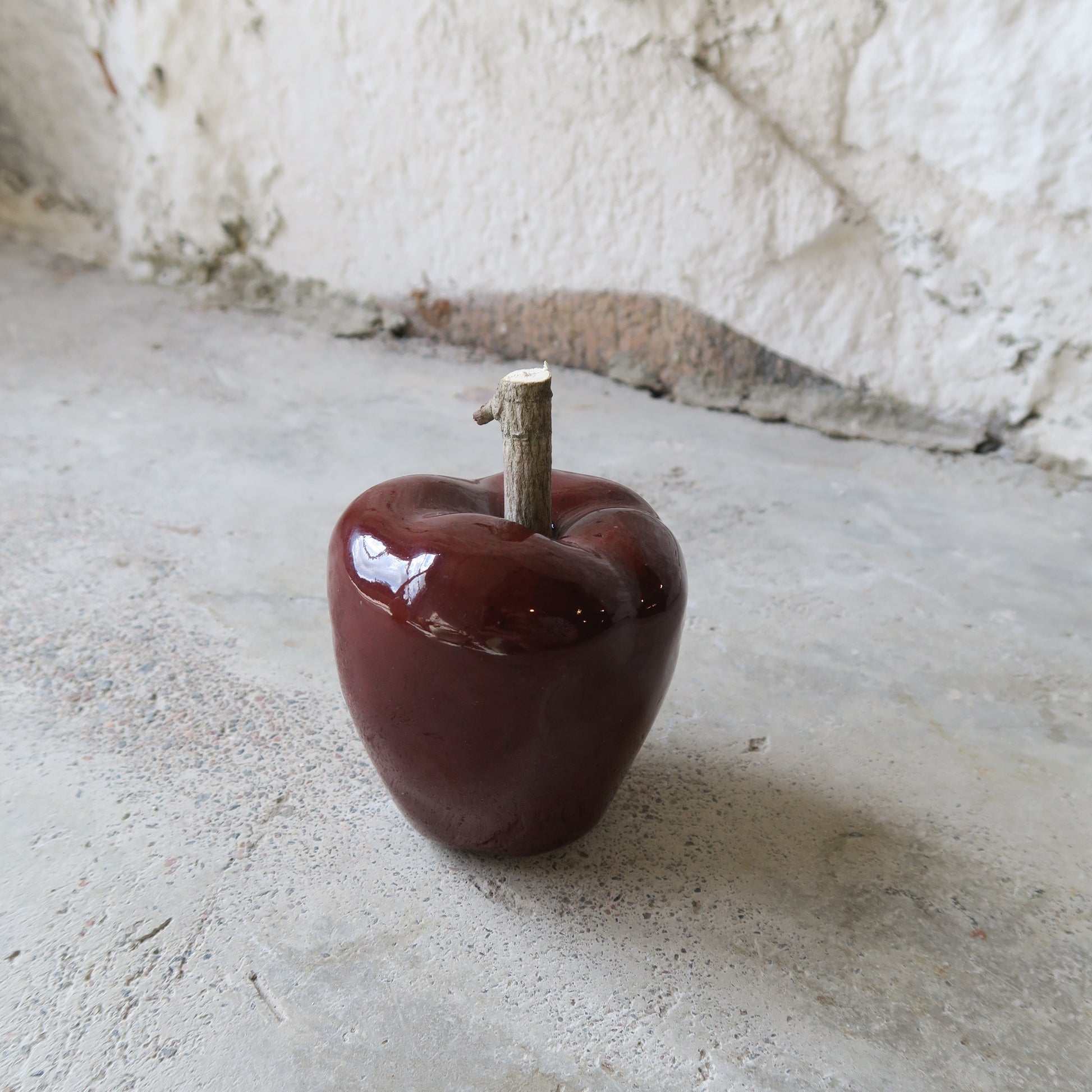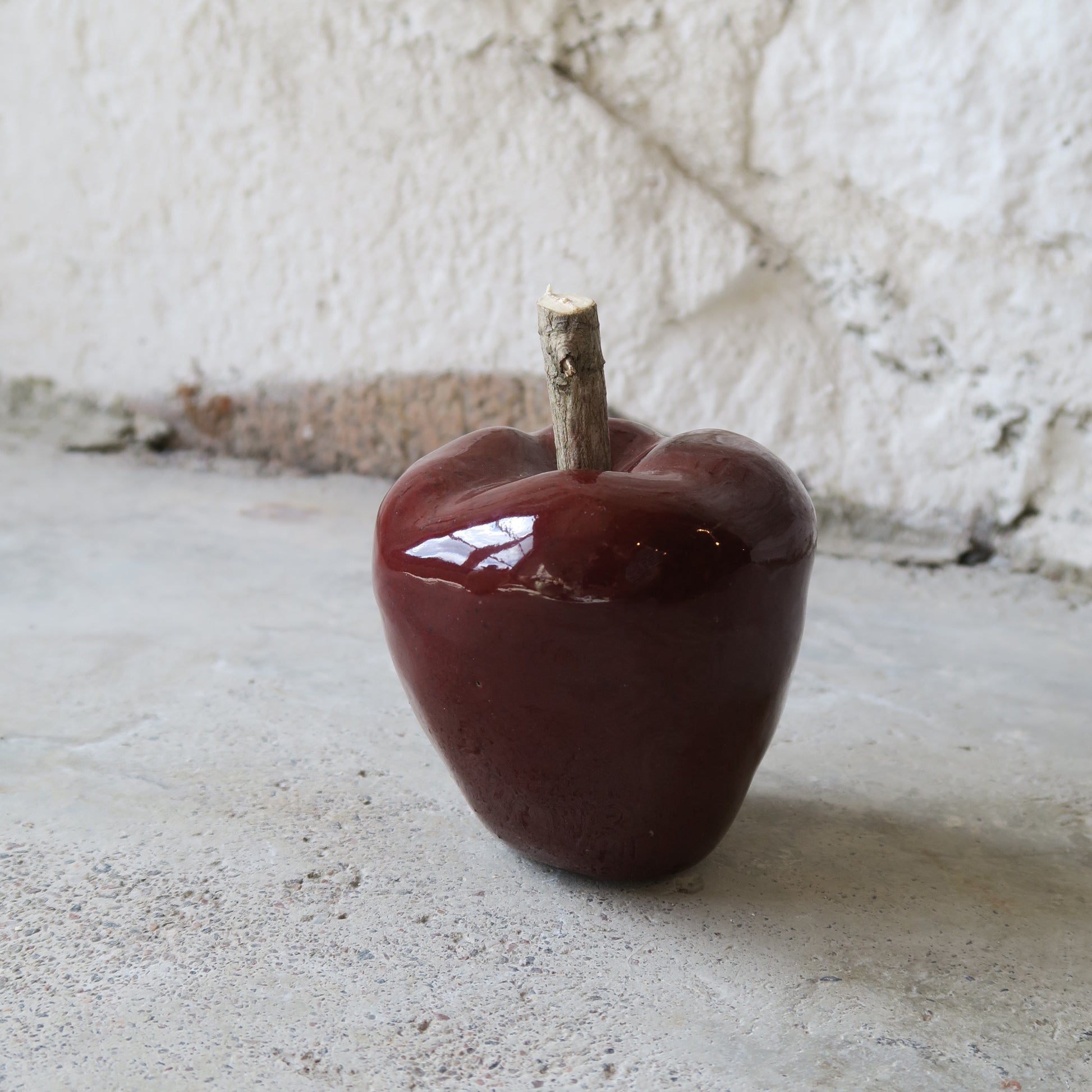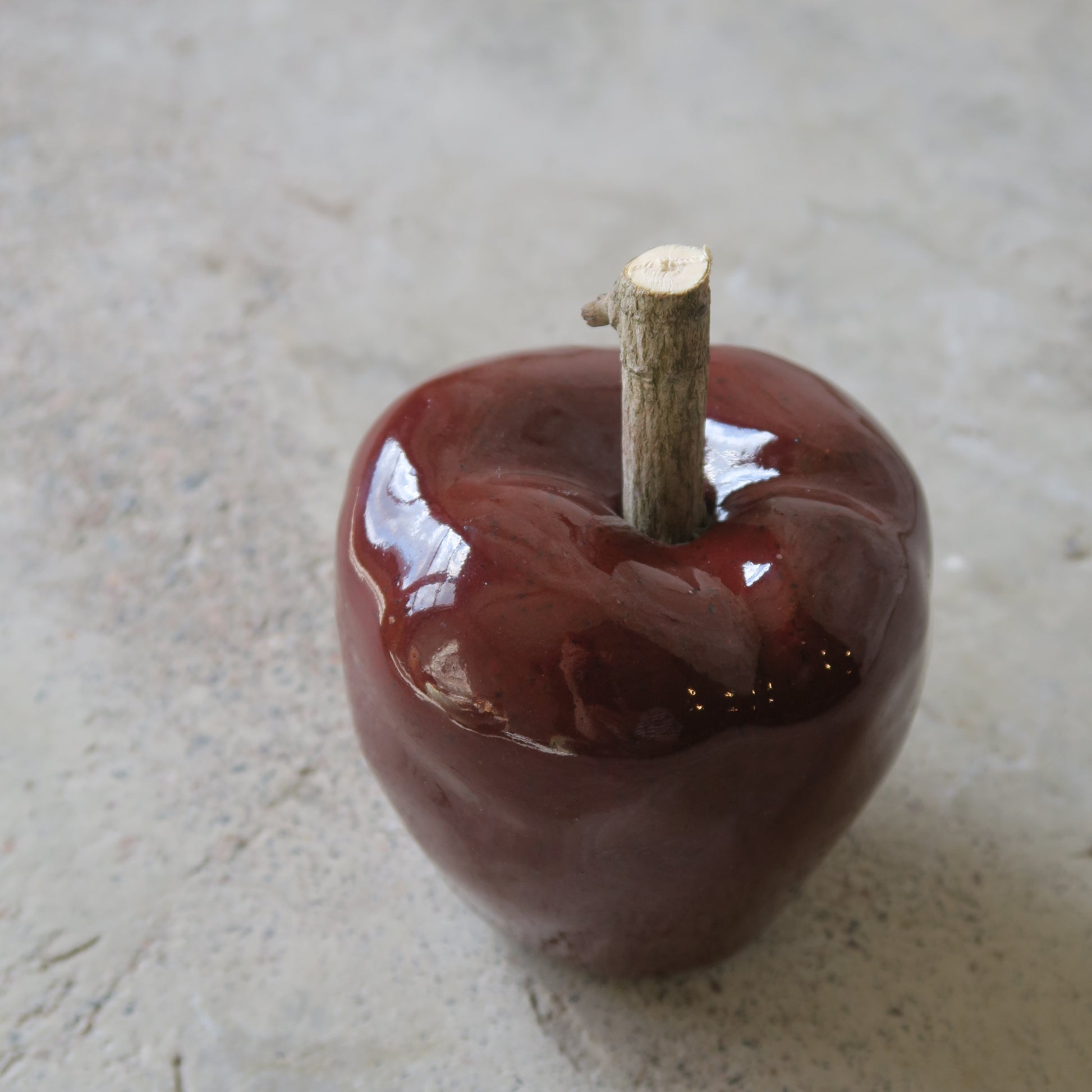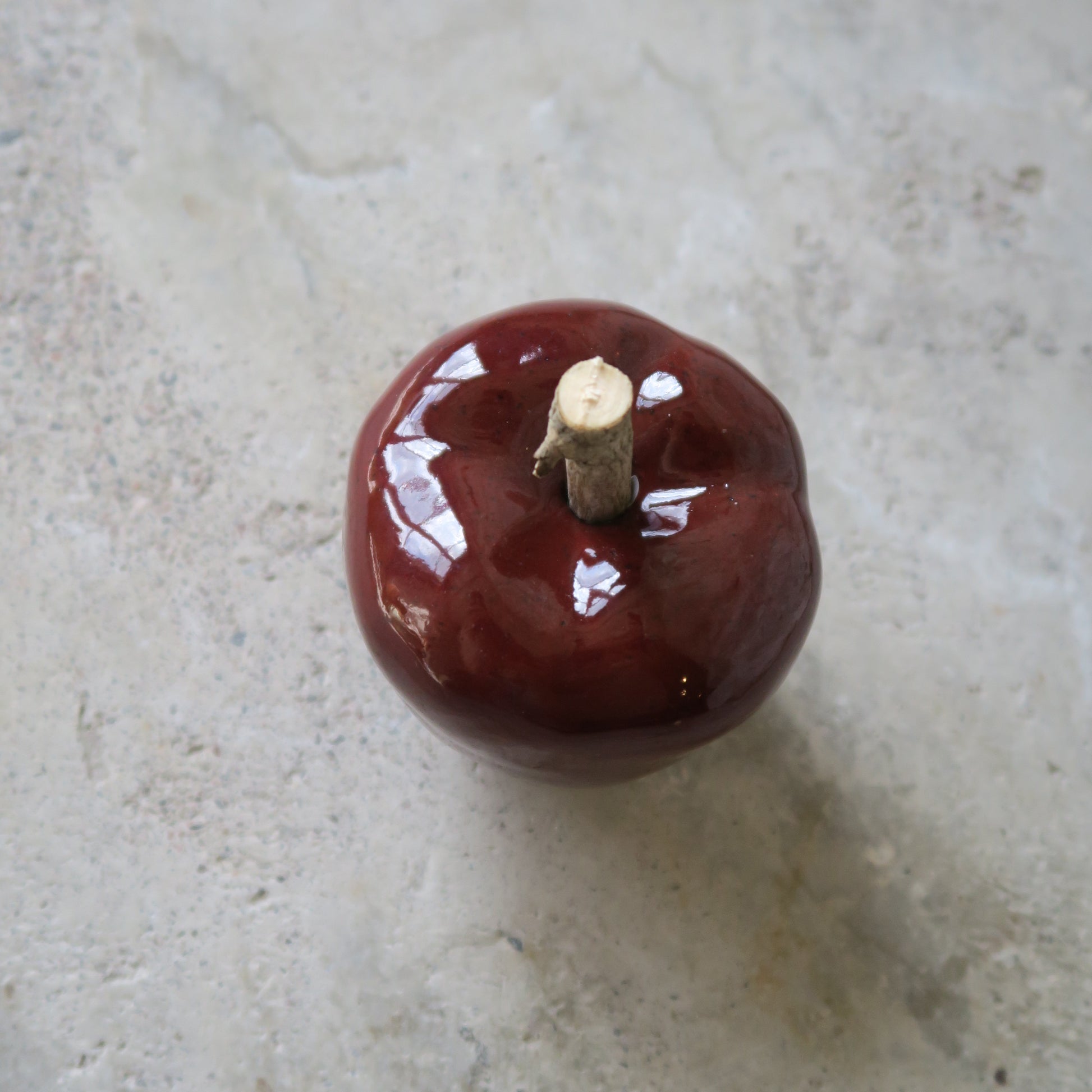 Maarit Lassilan käsin tekemä keramiikkaomena. Lasitettua keramiikkaa ja puuta.