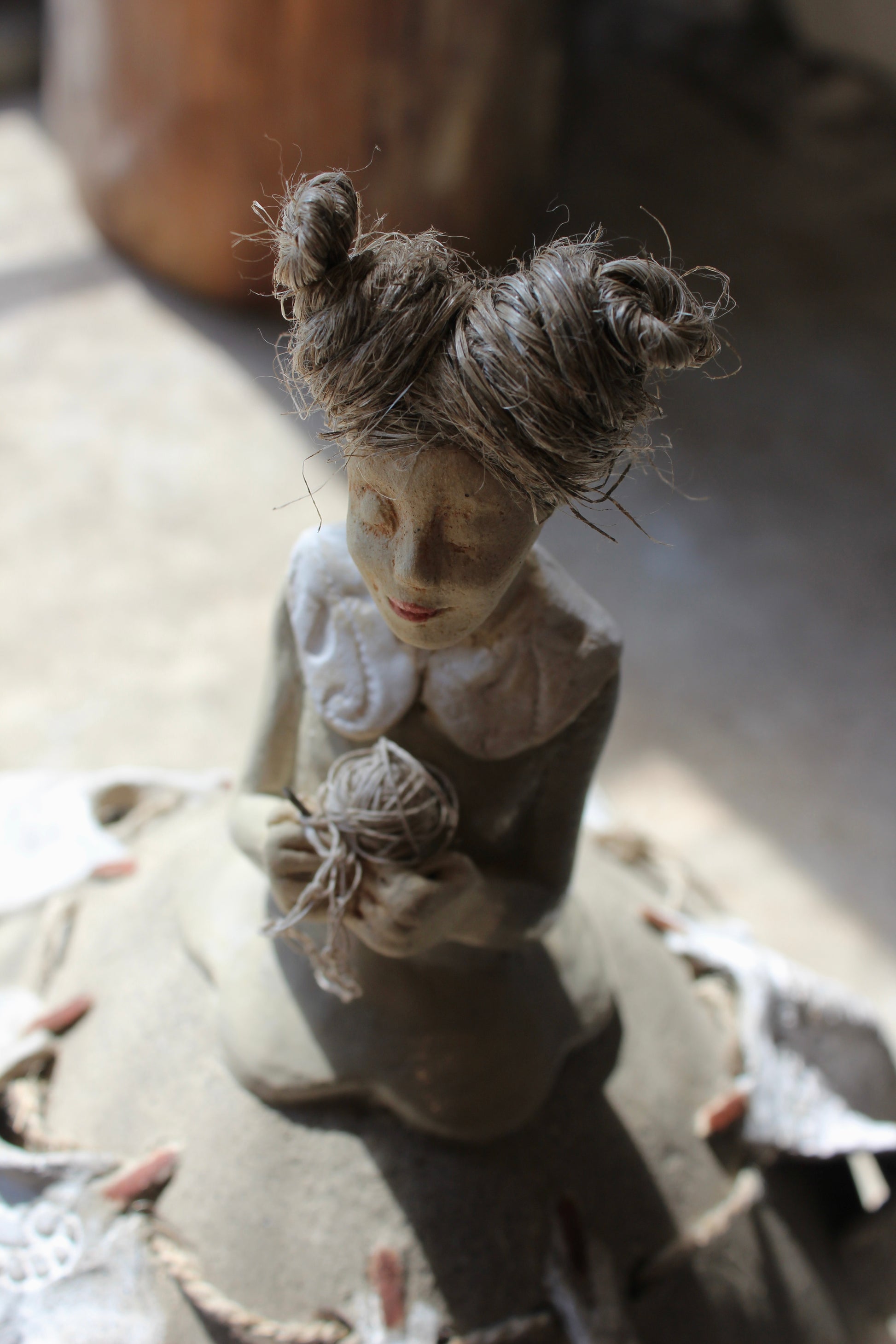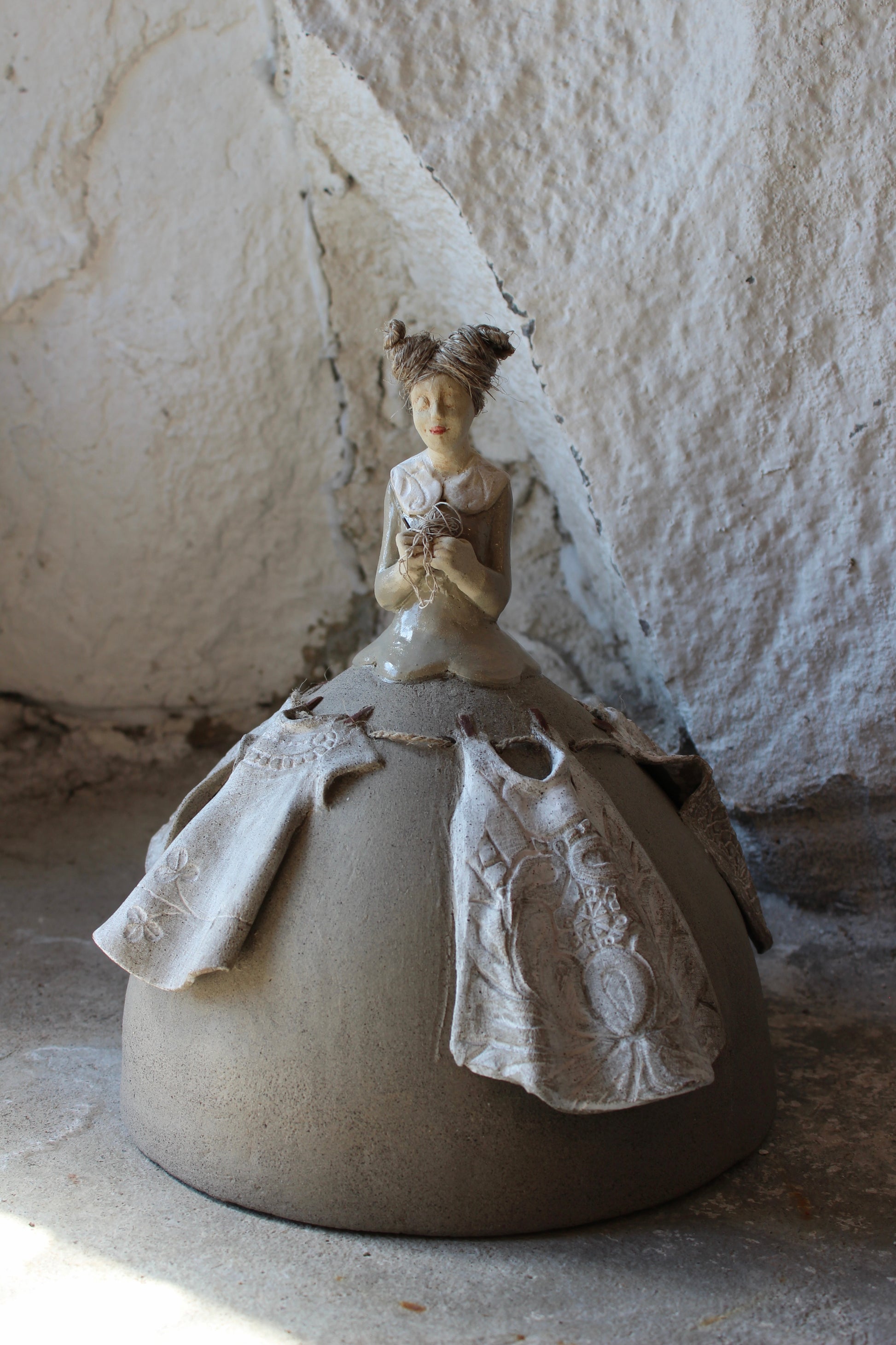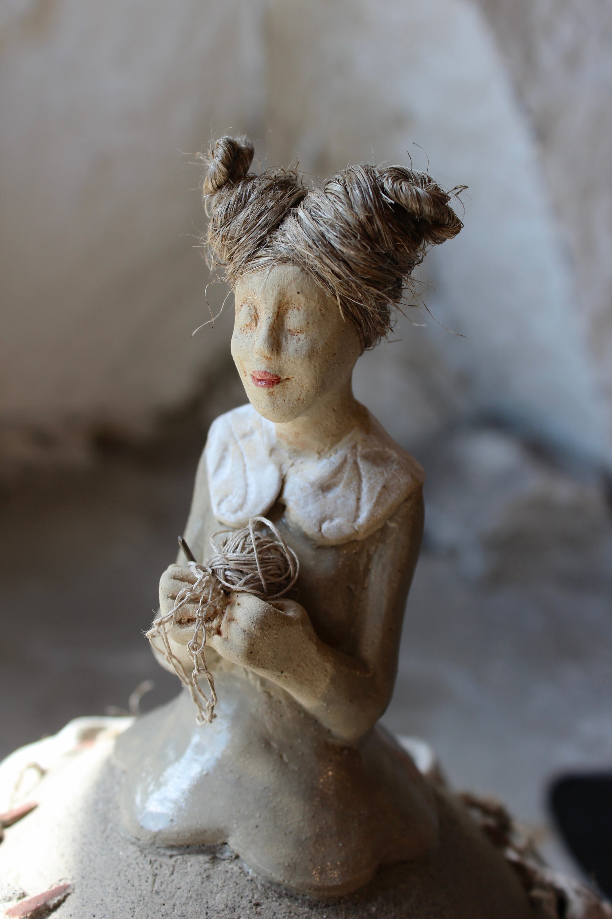 Maarit Lassilan käsin tekemä uniikki Ompelijatar-veistos. Lasitettua keramiikkaa.