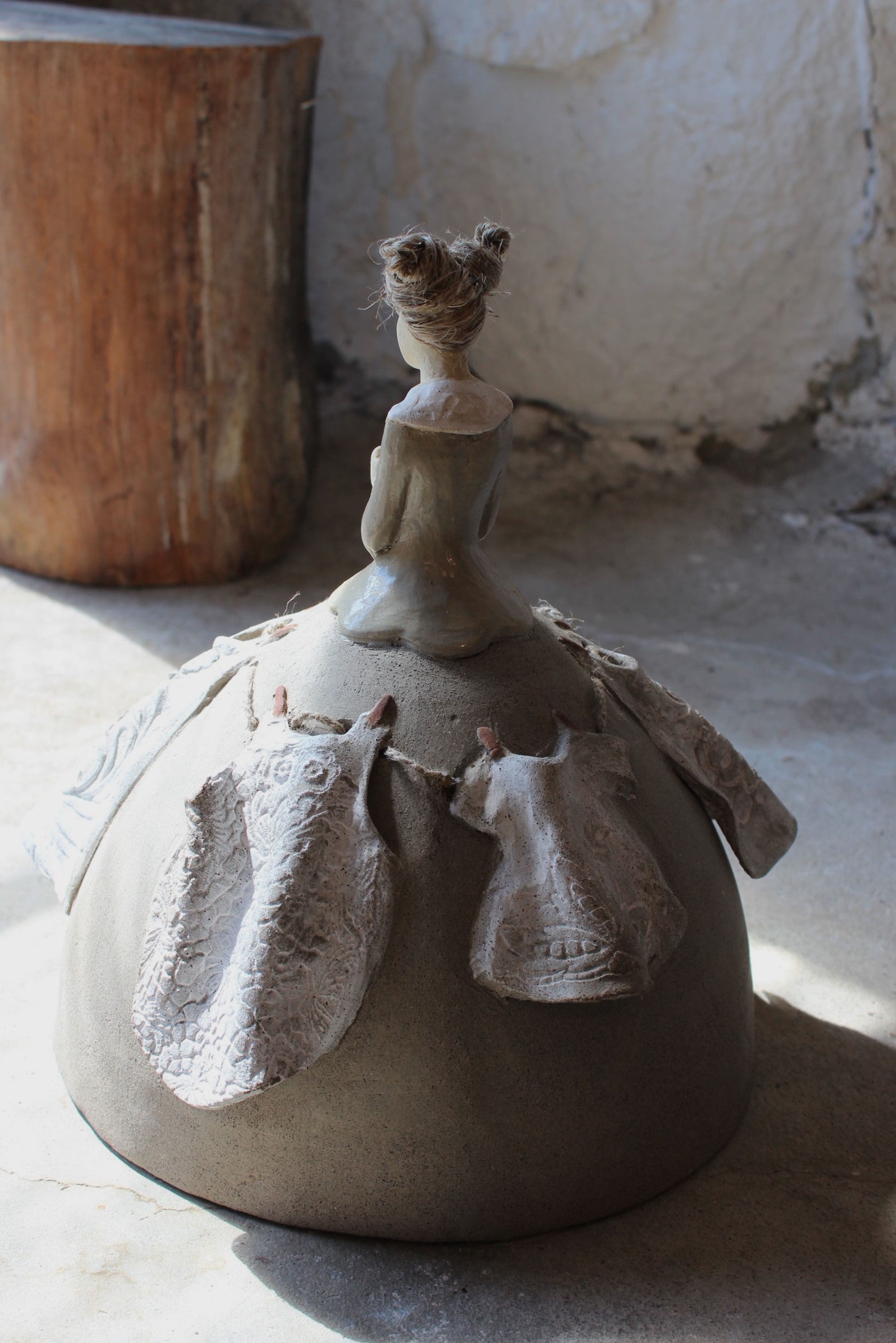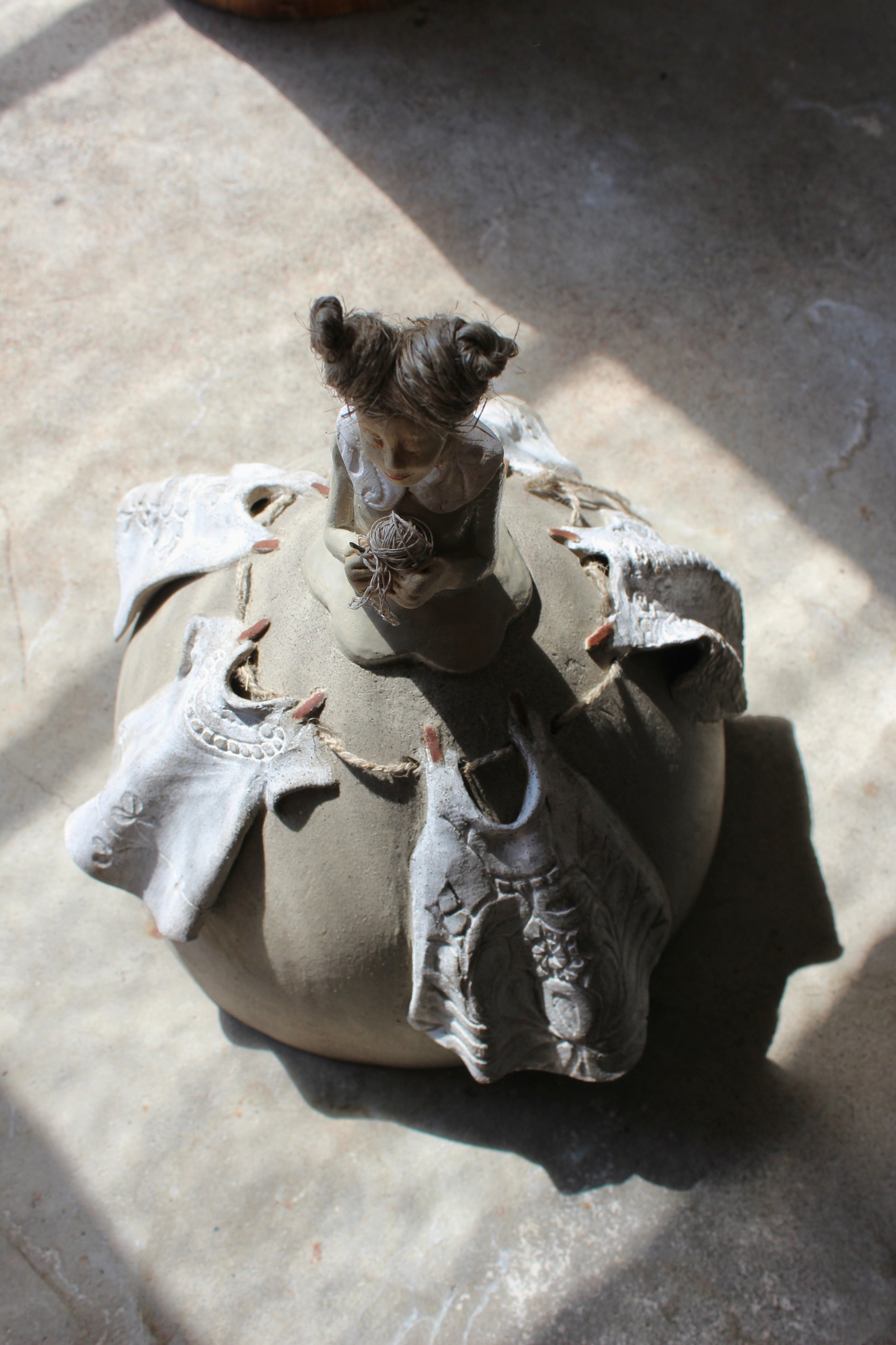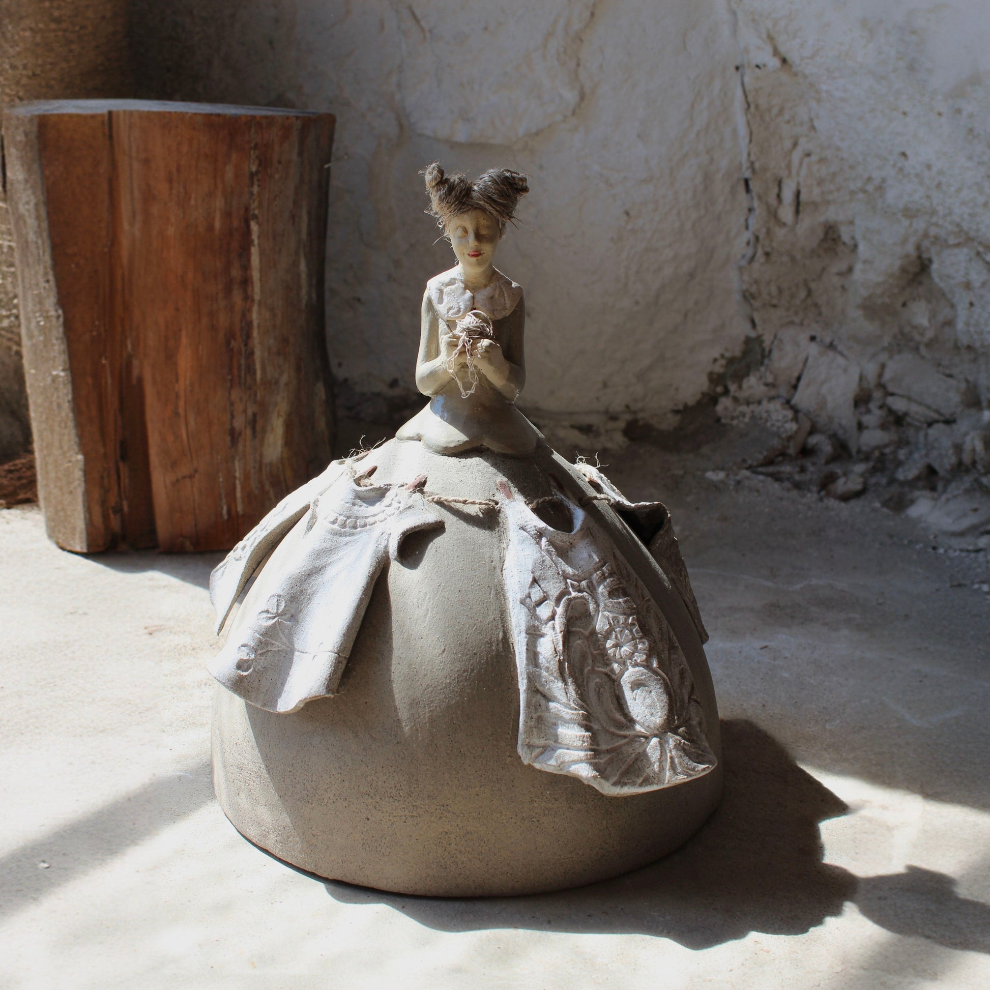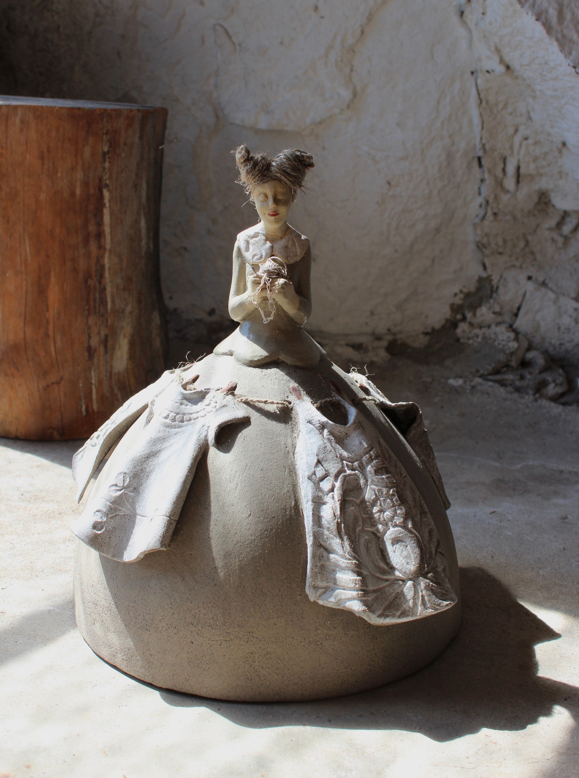 Maarit Lassilan käsin tekemä uniikki Ompelijatar-veistos. Lasitettua keramiikkaa.
