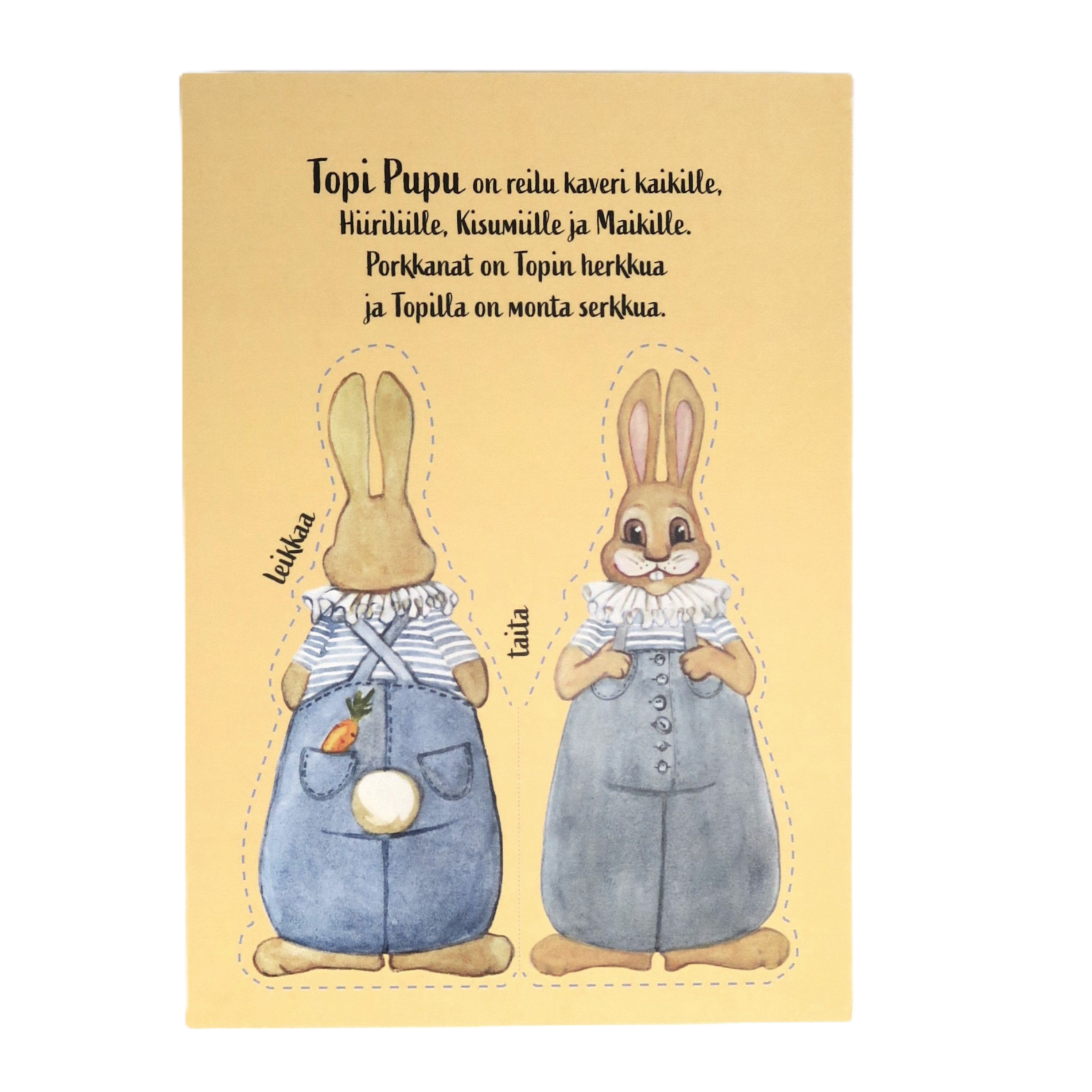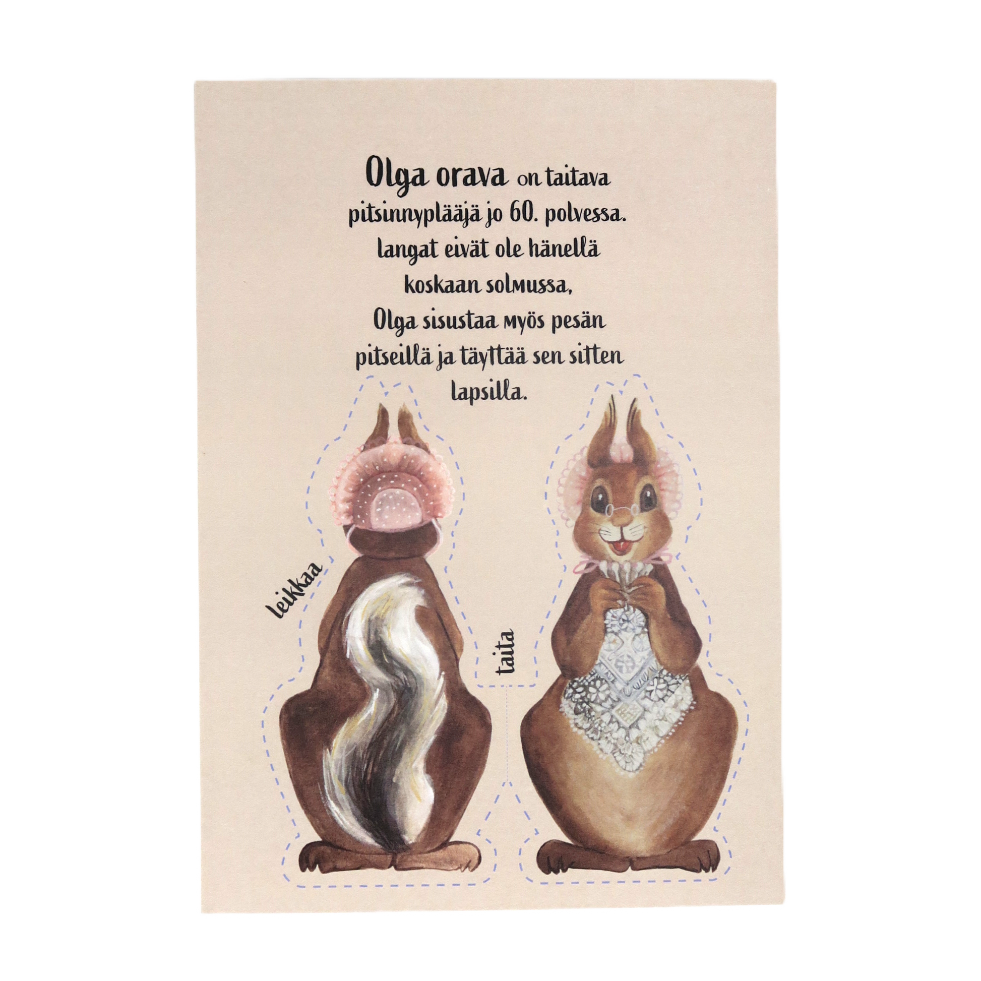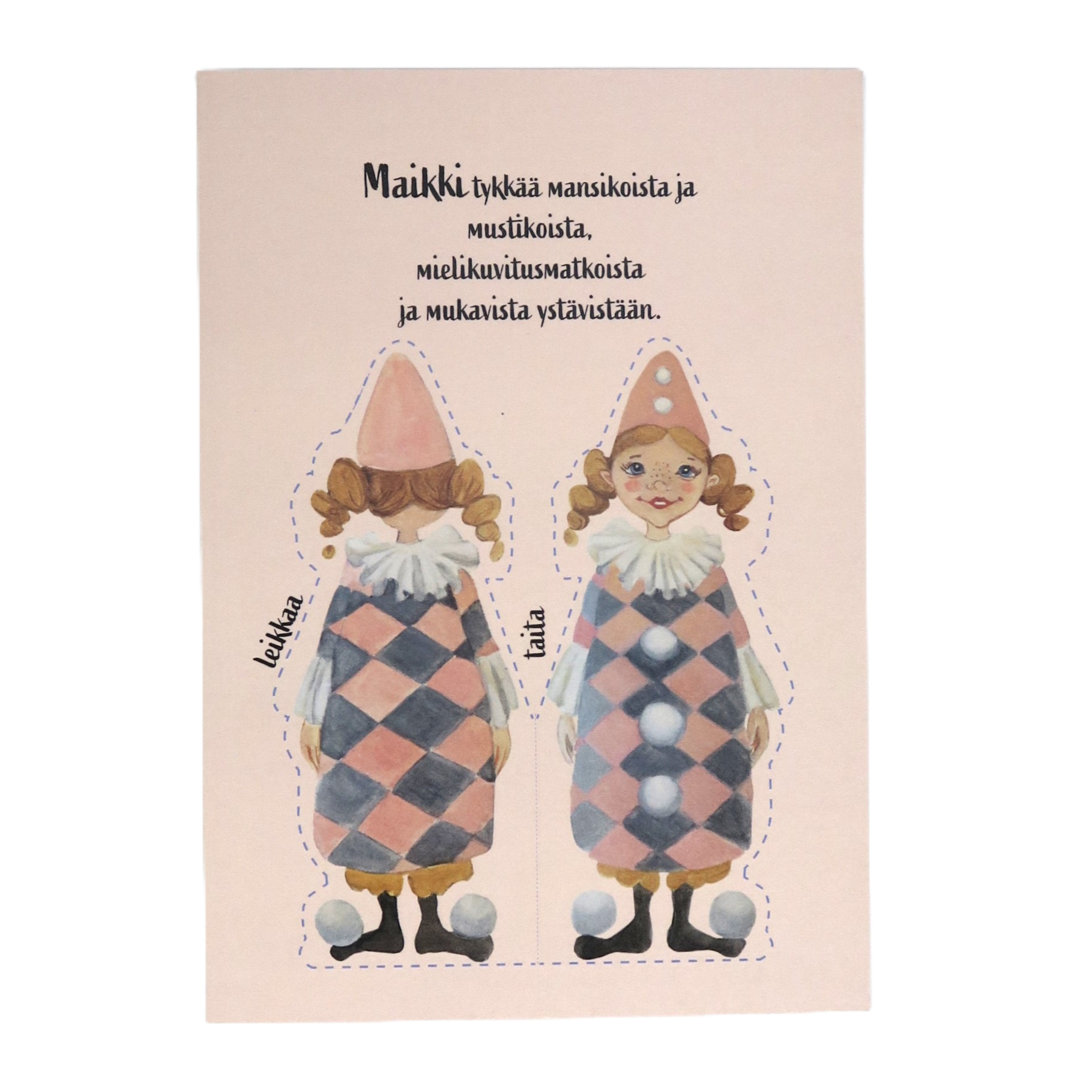 Postikortti, josta voi leikata paperinuken. Painettu Maarit Lassilan alkuperäisen teoksen pohjalta. Koko A5.