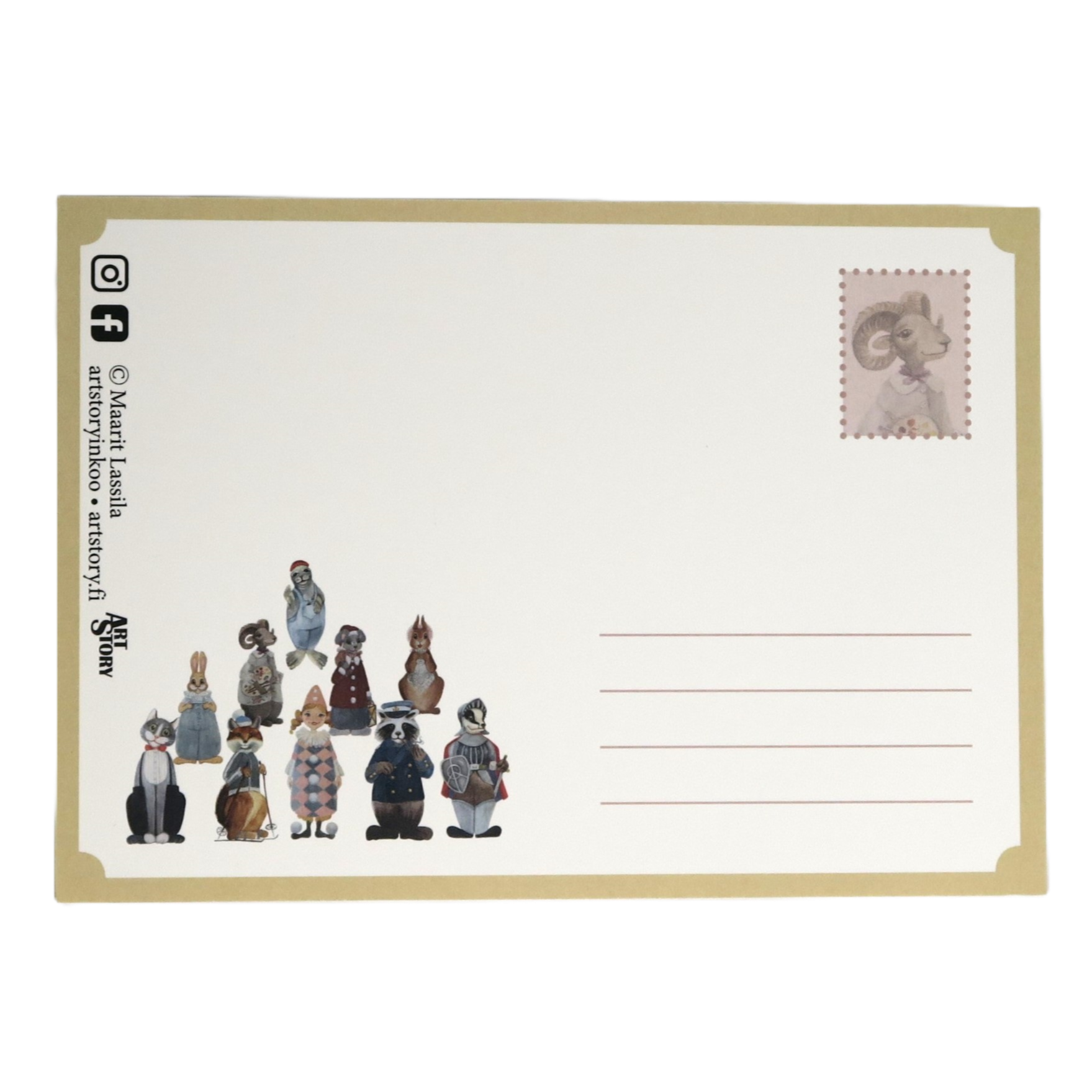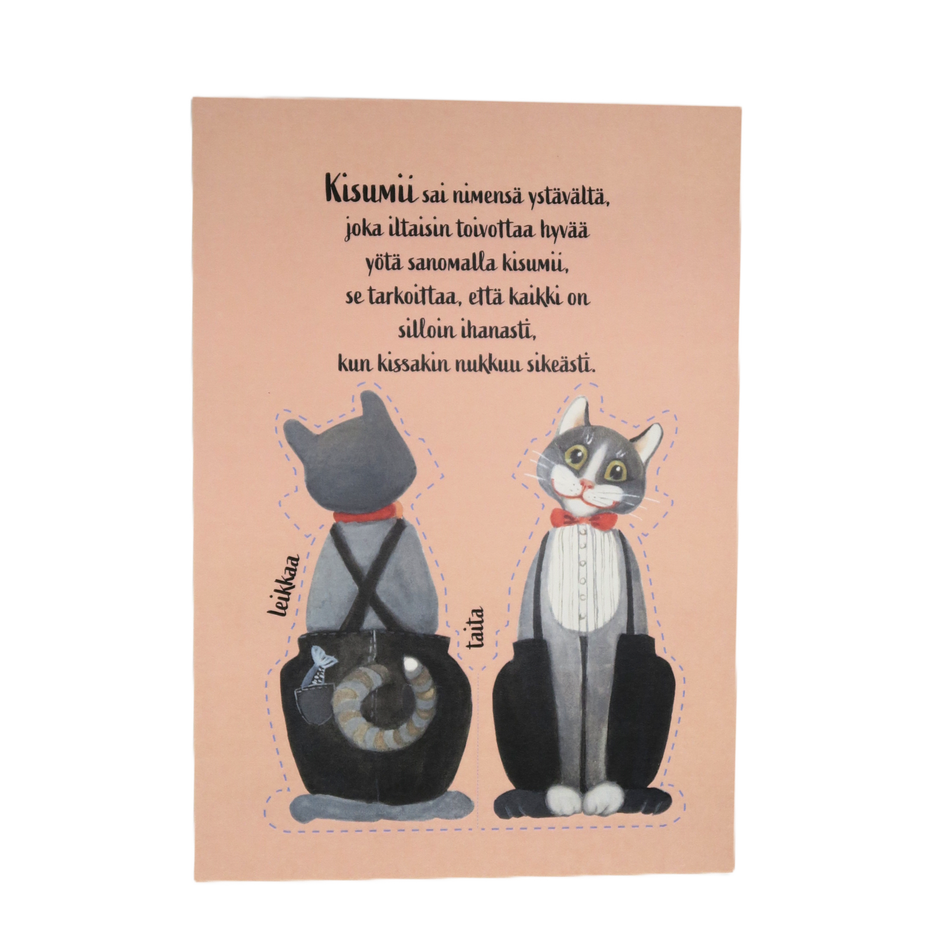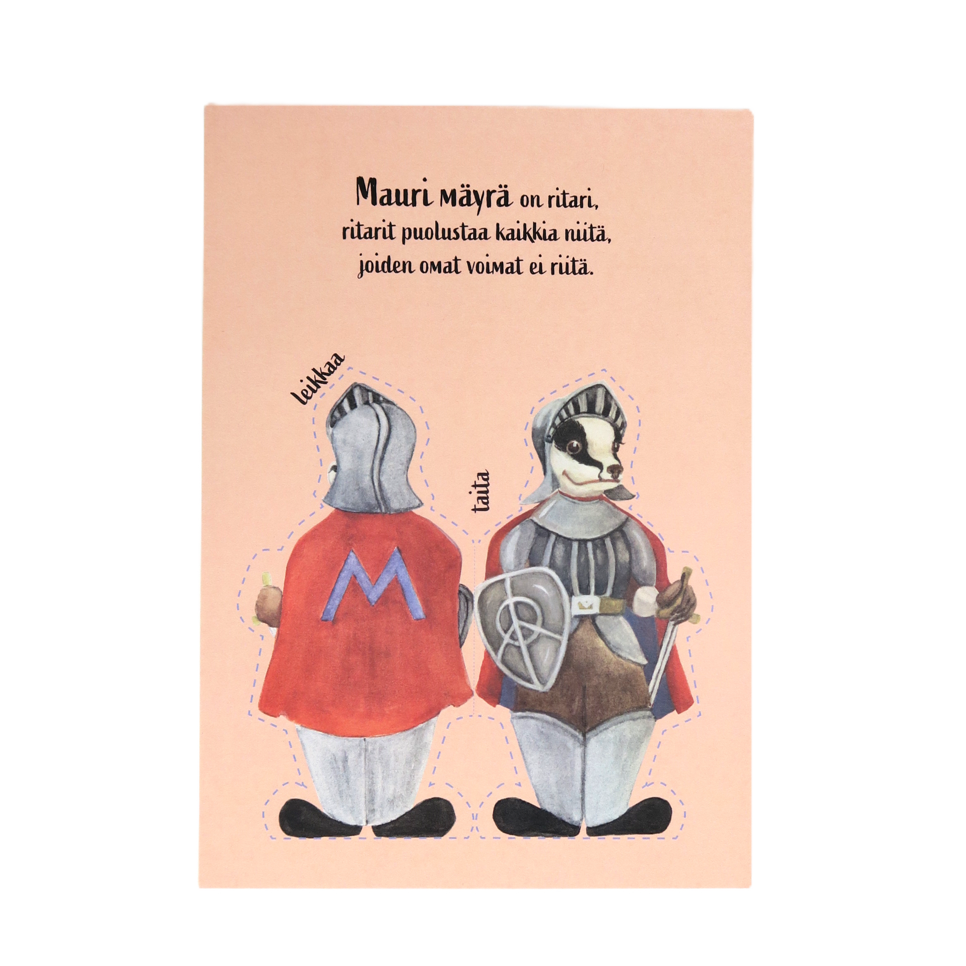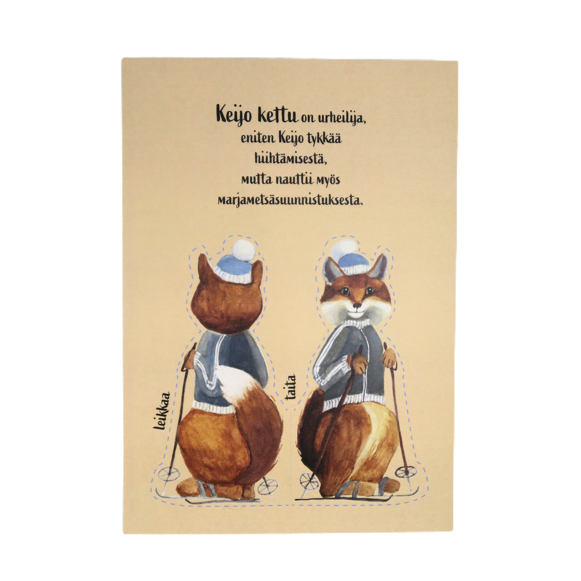 Postikortti, josta voi leikata paperinuken. Painettu Maarit Lassilan alkuperäisen teoksen pohjalta. Koko A5.