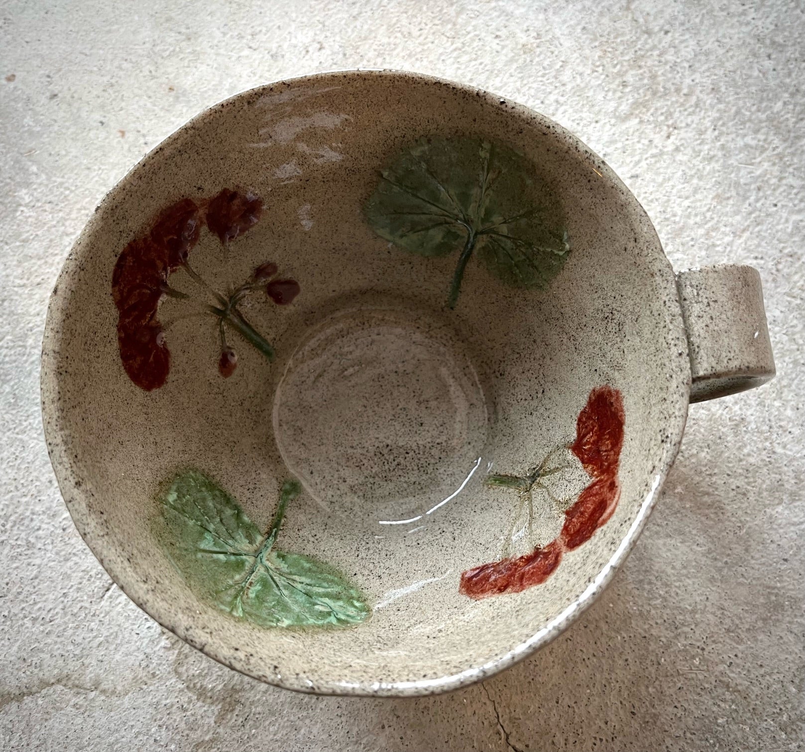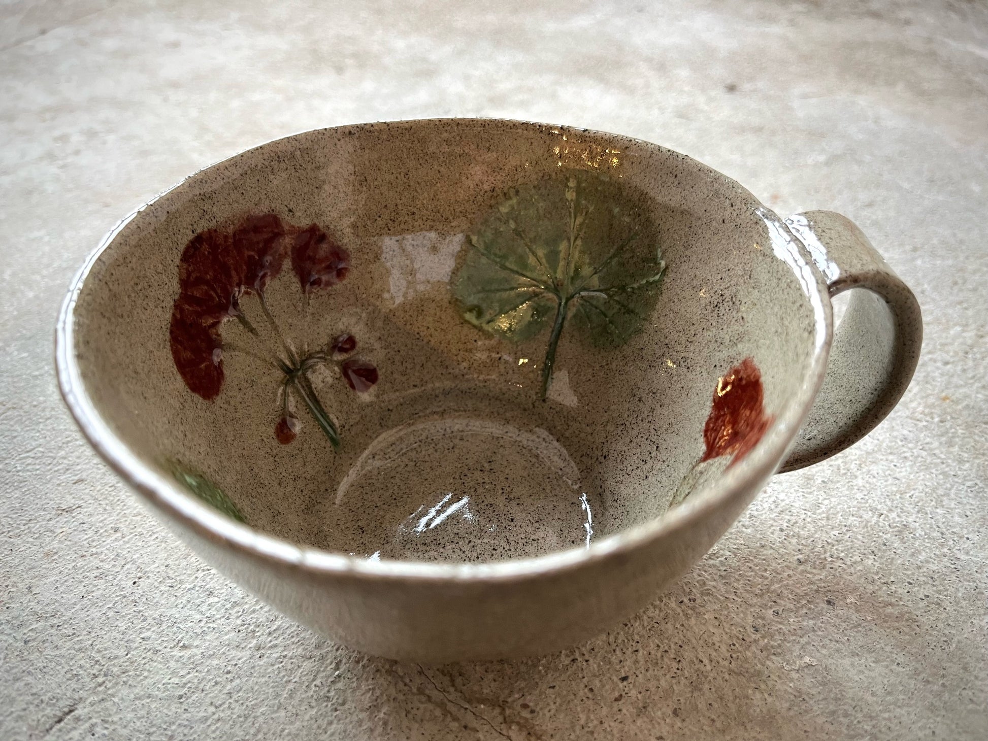 Tämä hiukan tummemmasta savesta tehty kuppi sopii hienosti esimerkiksi cappucinolle. Se on Maarit Lassilan käsin tekemä ja siinä on kesän pelargonioilla painettu kuvio. Korkeapolttoista kivitavarakeramiikkaa ja astianpesukoneen kestävä.