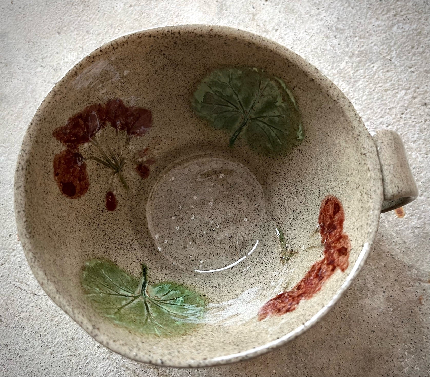 Tämä hiukan tummemmasta savesta tehty kuppi sopii hyvin esimerkiksi cappucinolle. Se on Maarit Lassilan käsin tekemä ja siinä on kesän pelargonioilla painettu kuvio. Nämä kupit ovat kuvioiltaan ja lasitukseltaan kaikki uniikkeja yksilöitä. Korkeapolttoista keramiikka ja astianpesukoneen kestävä.