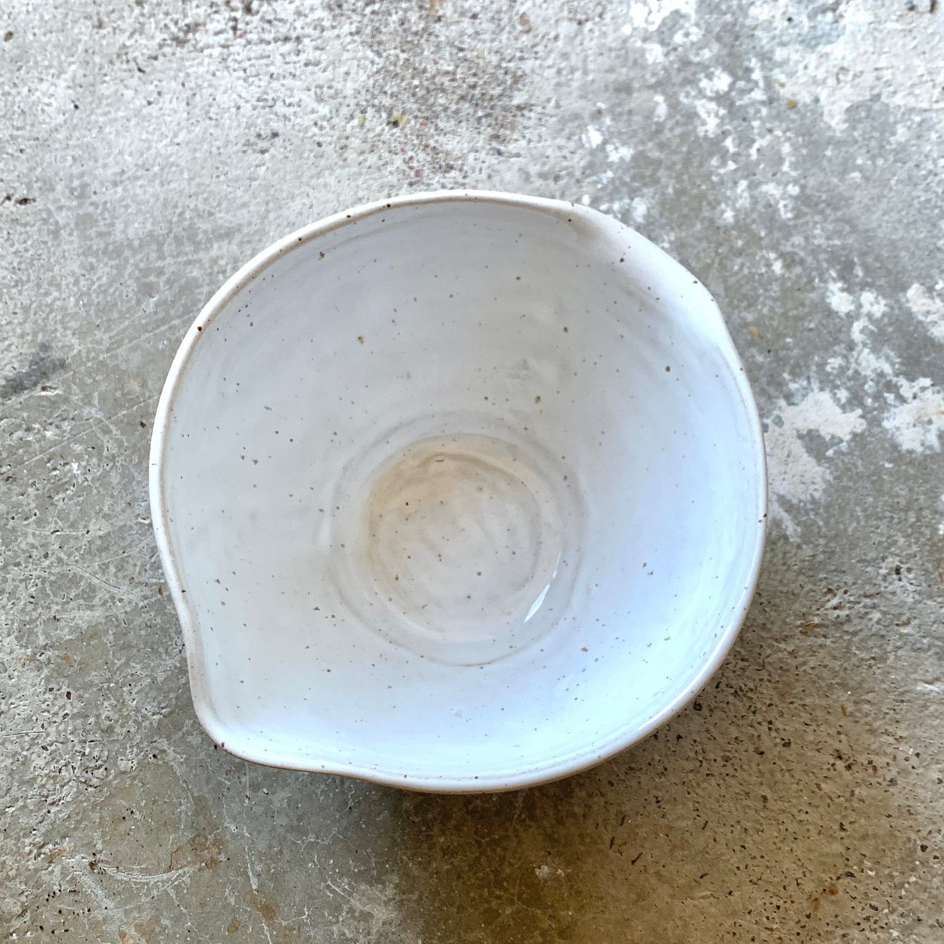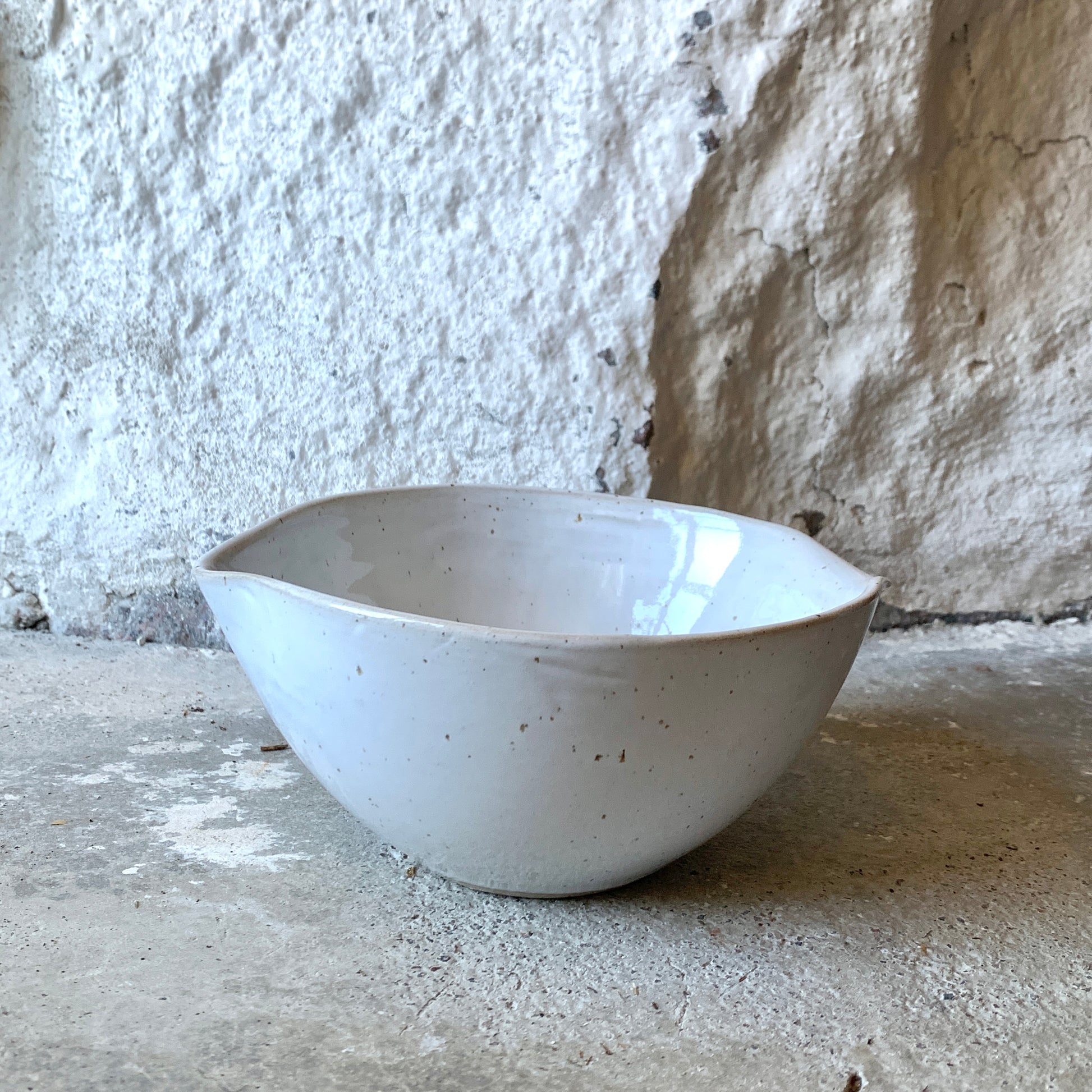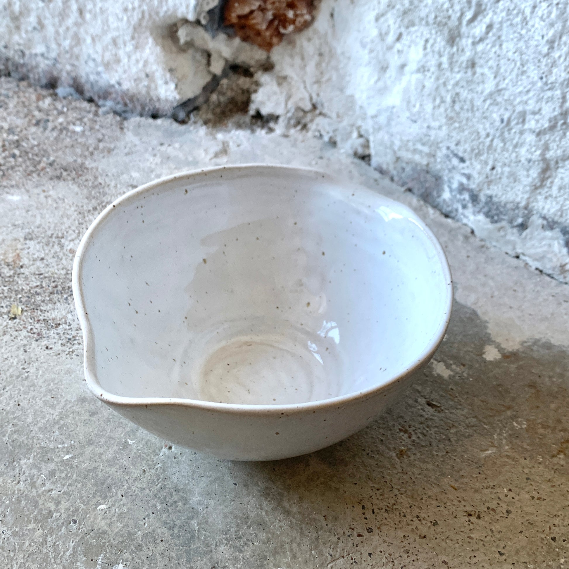 Pieni taikina/vatkauskulho, valkoinen lasite ja pilkkusavi. Astianpesukoneen, uunin ja mikron kestävä.