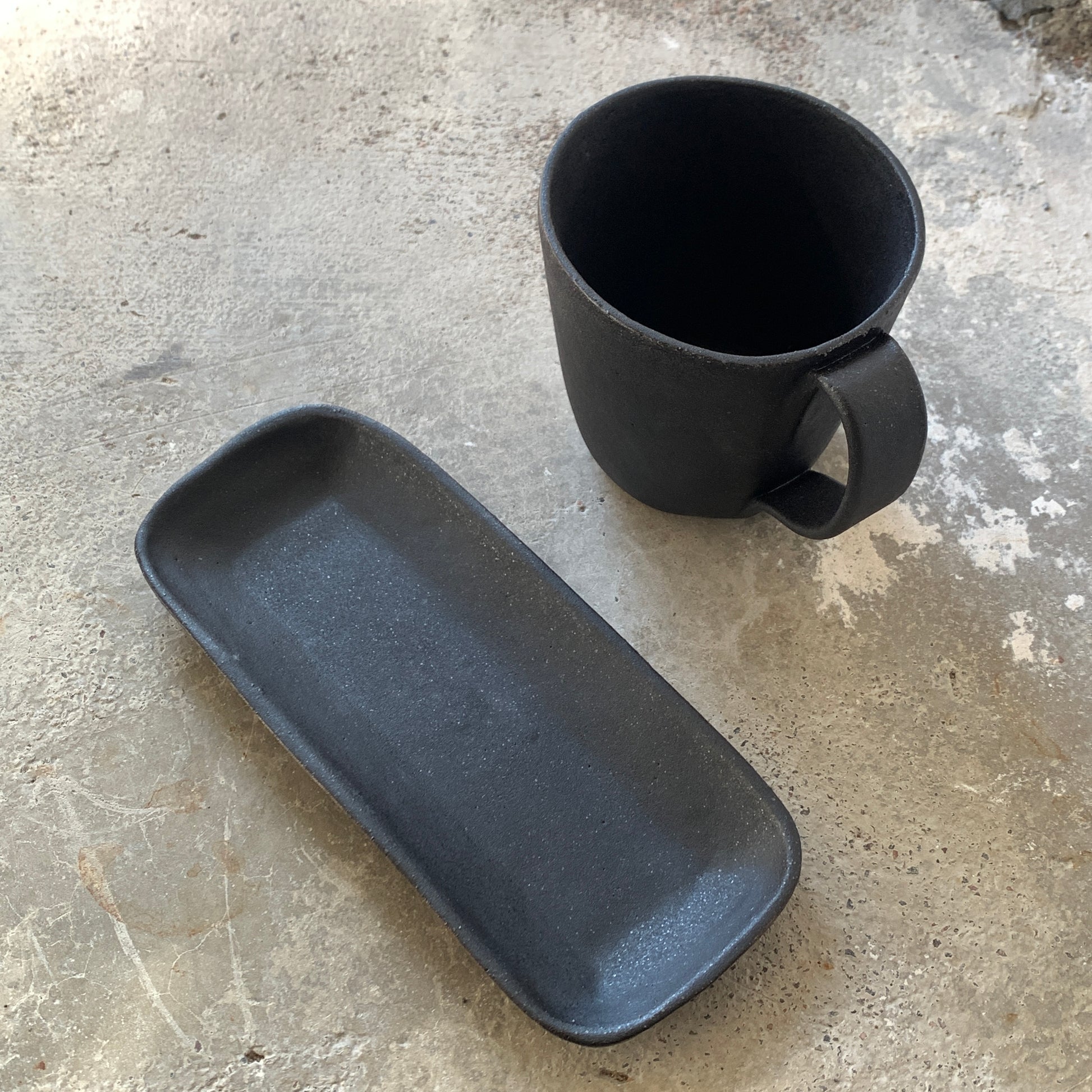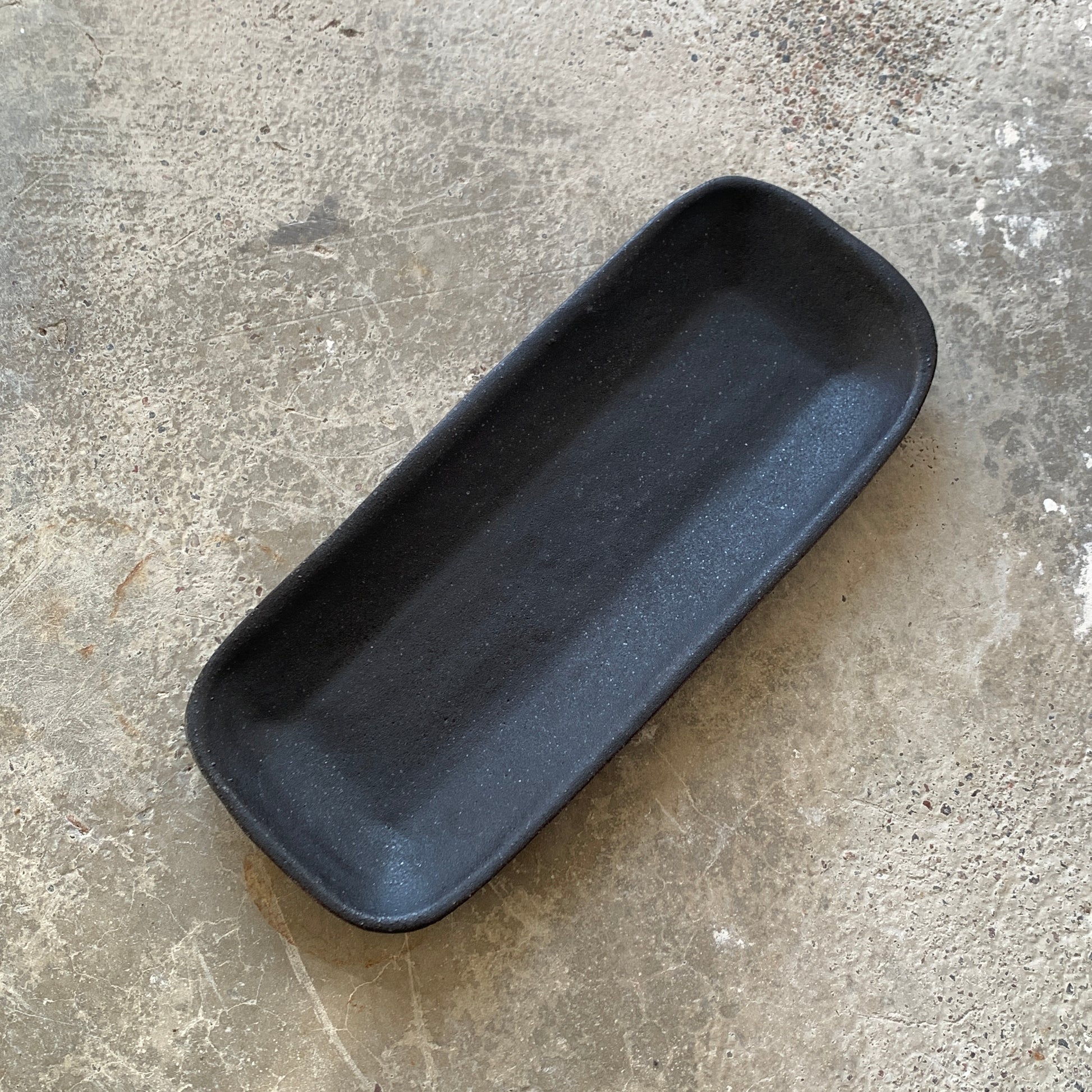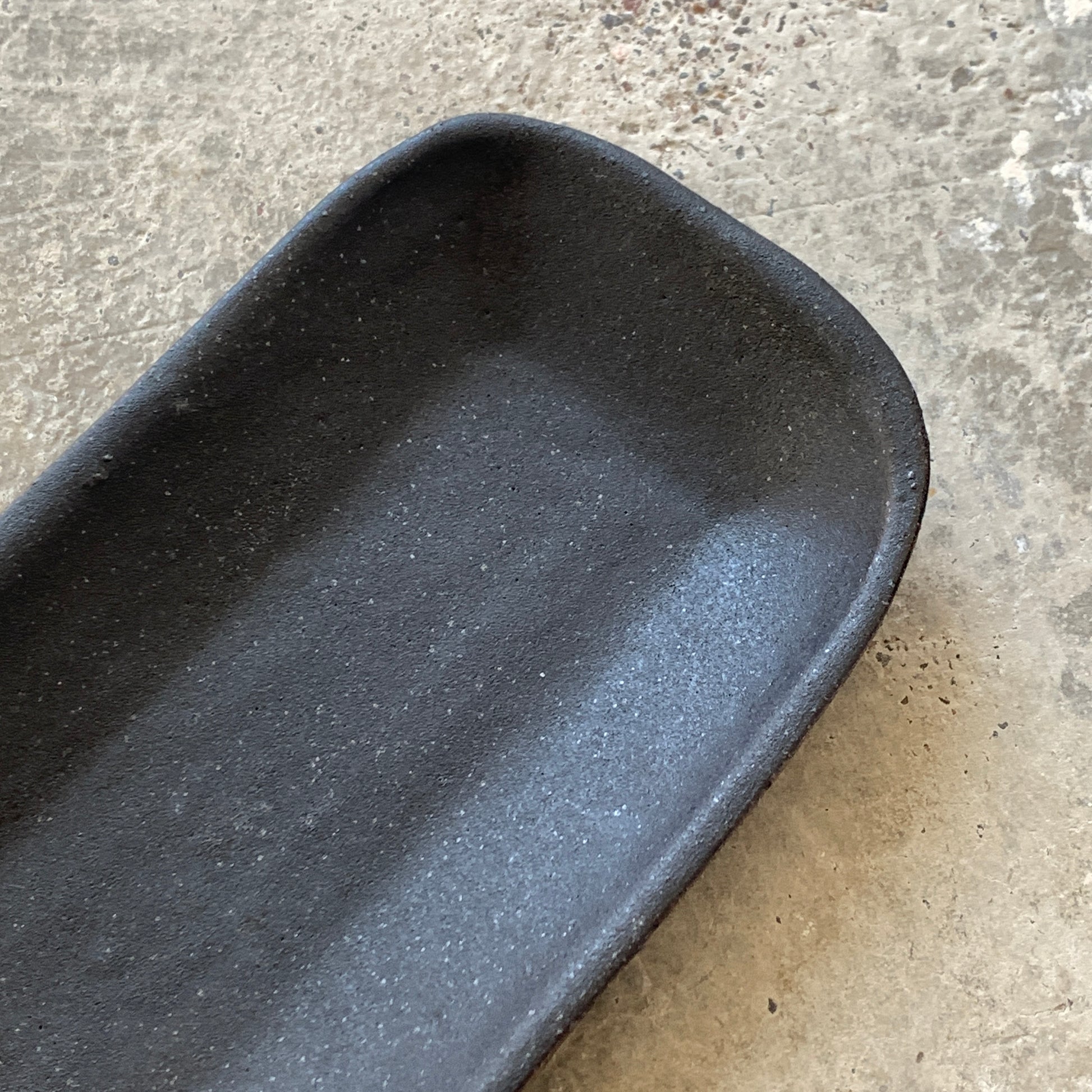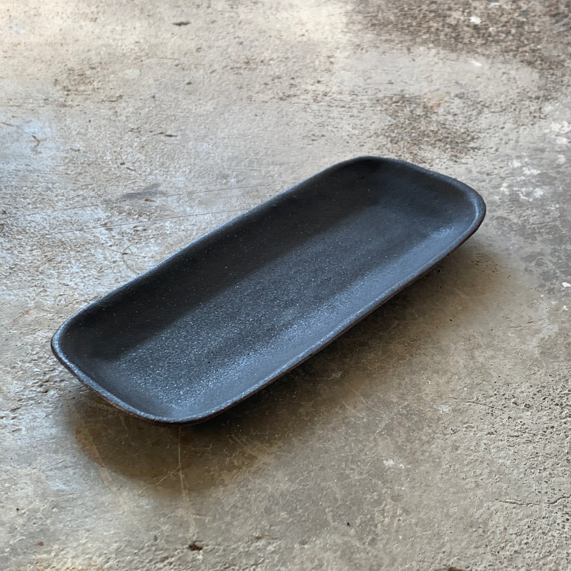 Mattamustaksi lasitettu pieni lautanen. Sopii tarjoiluun, kauhan lepuuttajaksi hellan viereen tai työpöydälle kynien ja siveltimien säilytykseen.
