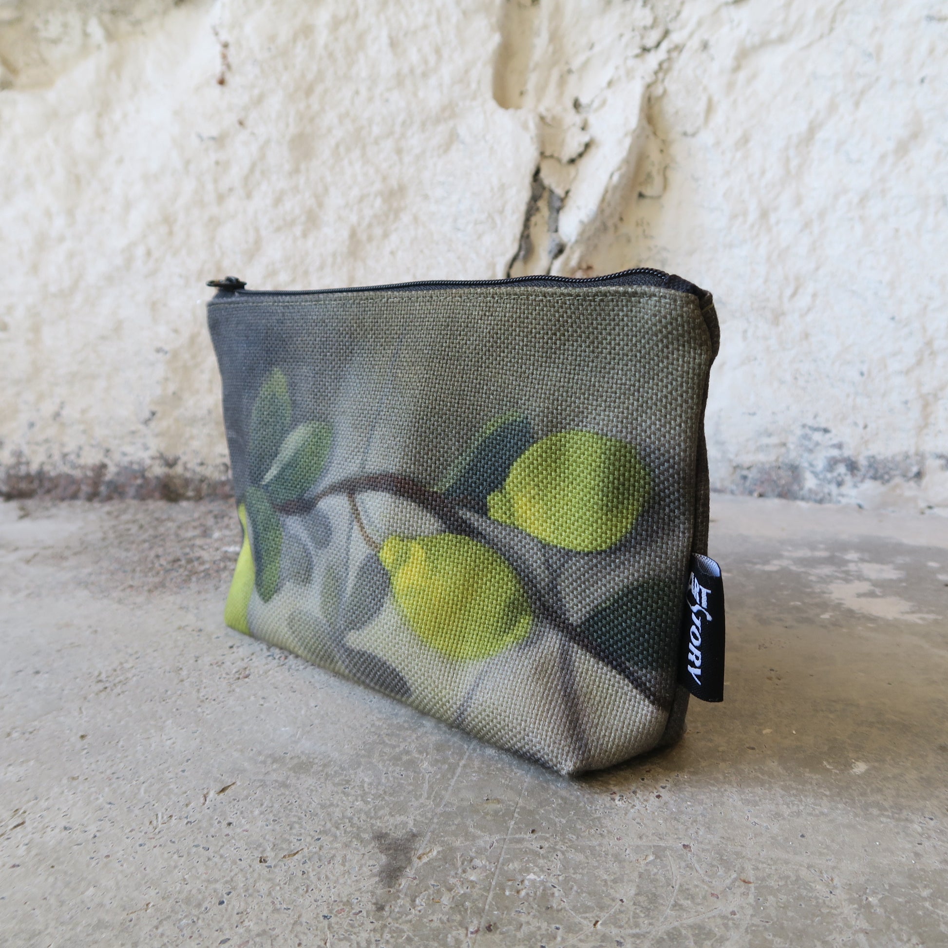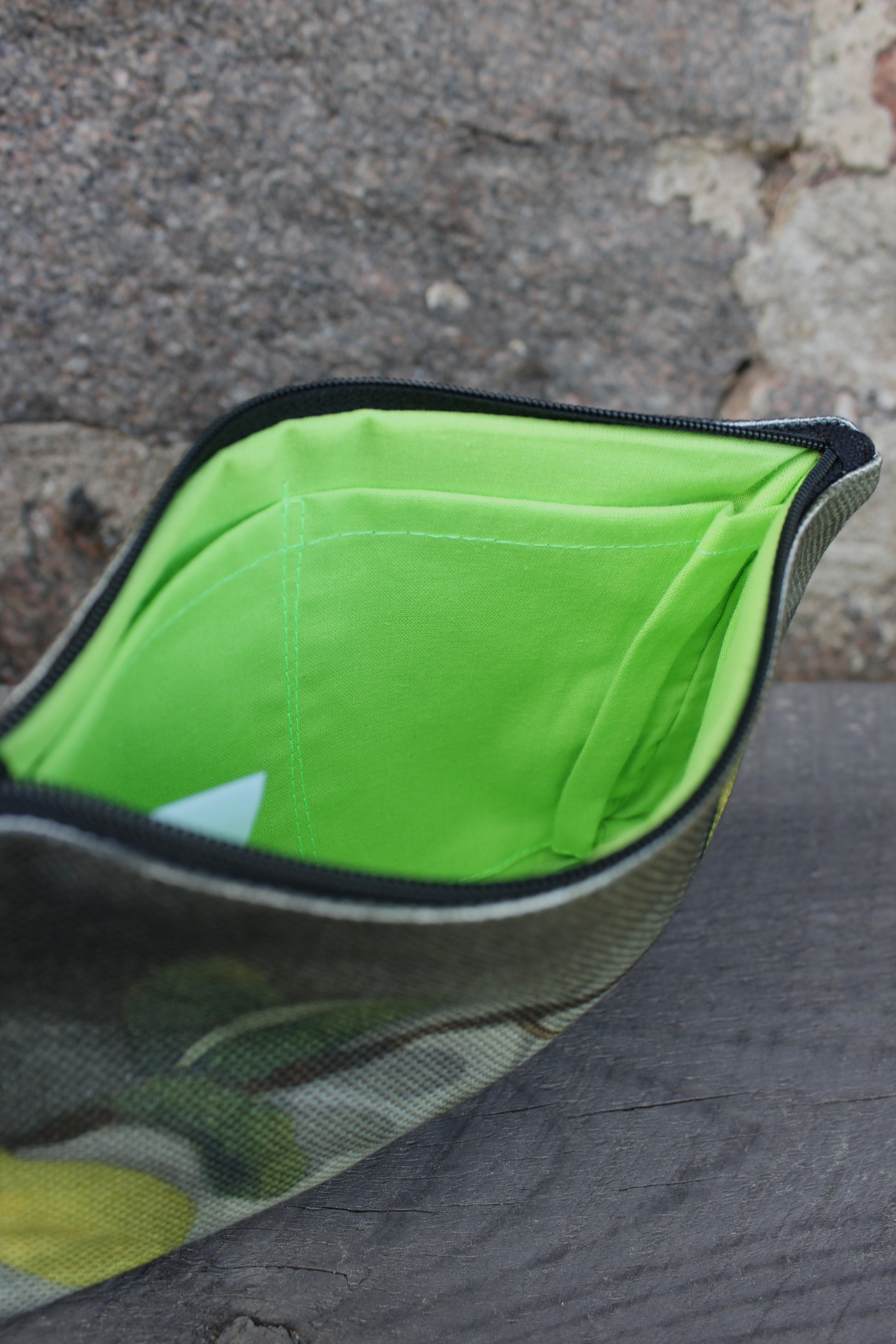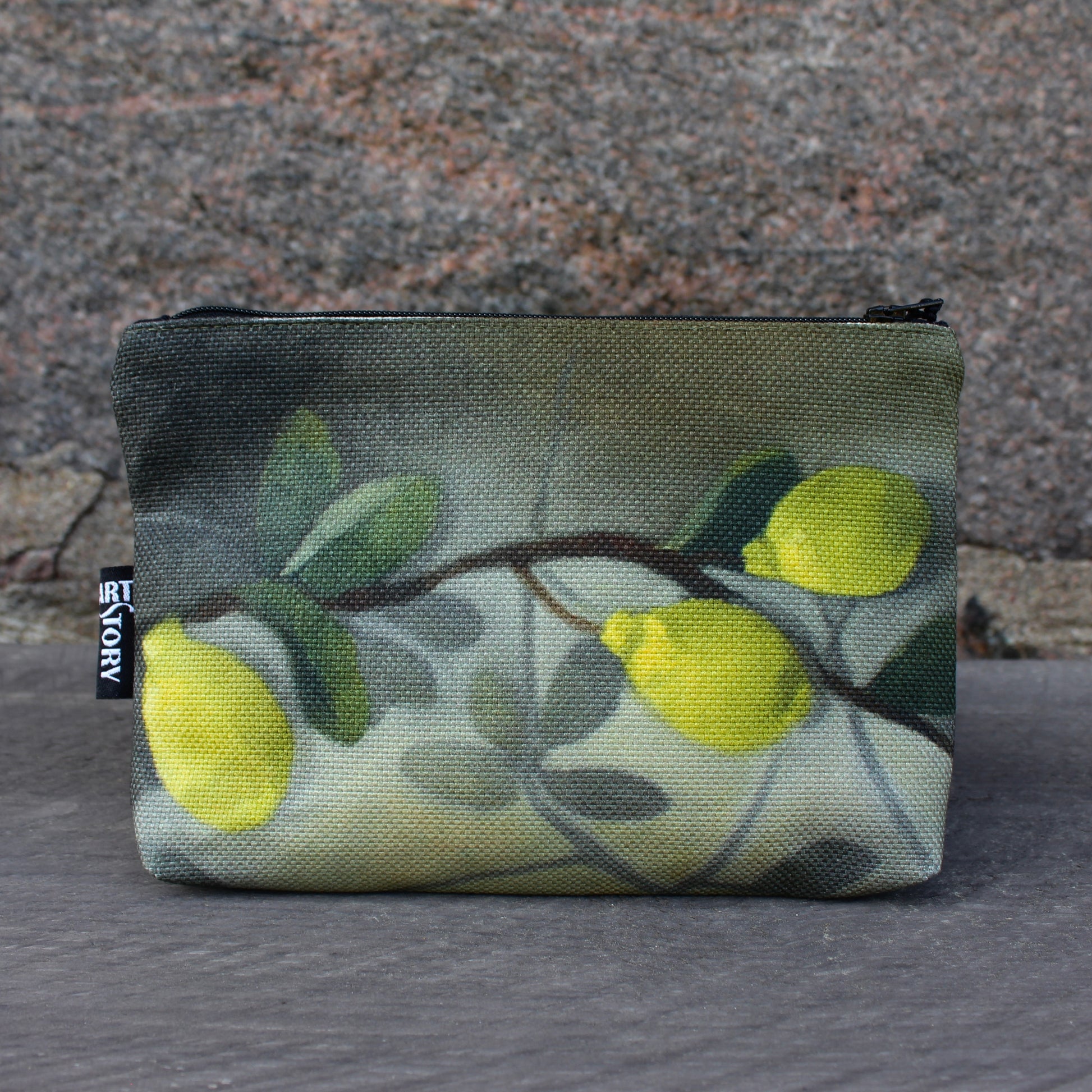 Vetoketjullinen pussukka sitruunakuosilla. Kukkaroksi, meikkipussiksi tai pienten asioiden säilyttämiseen.