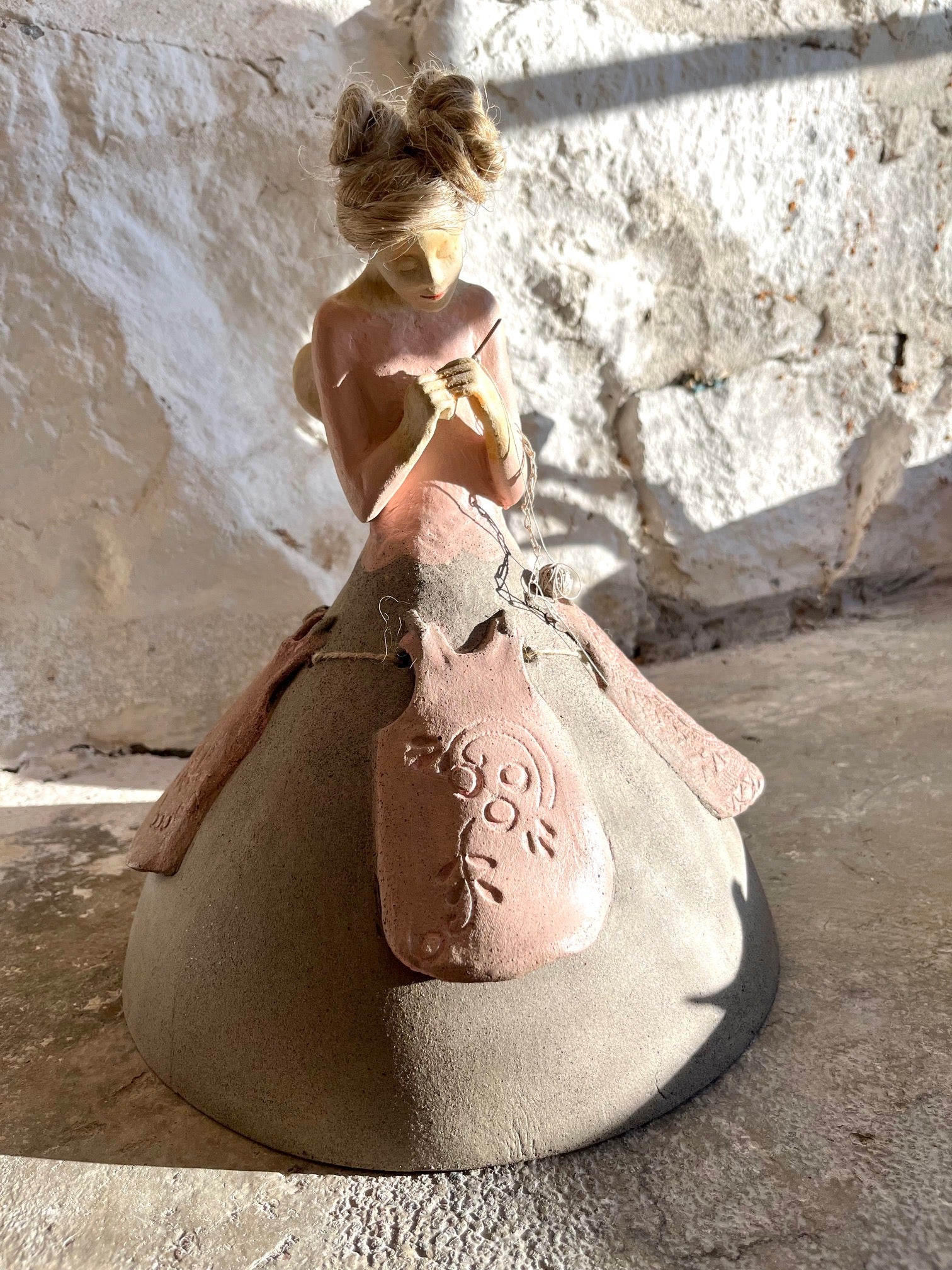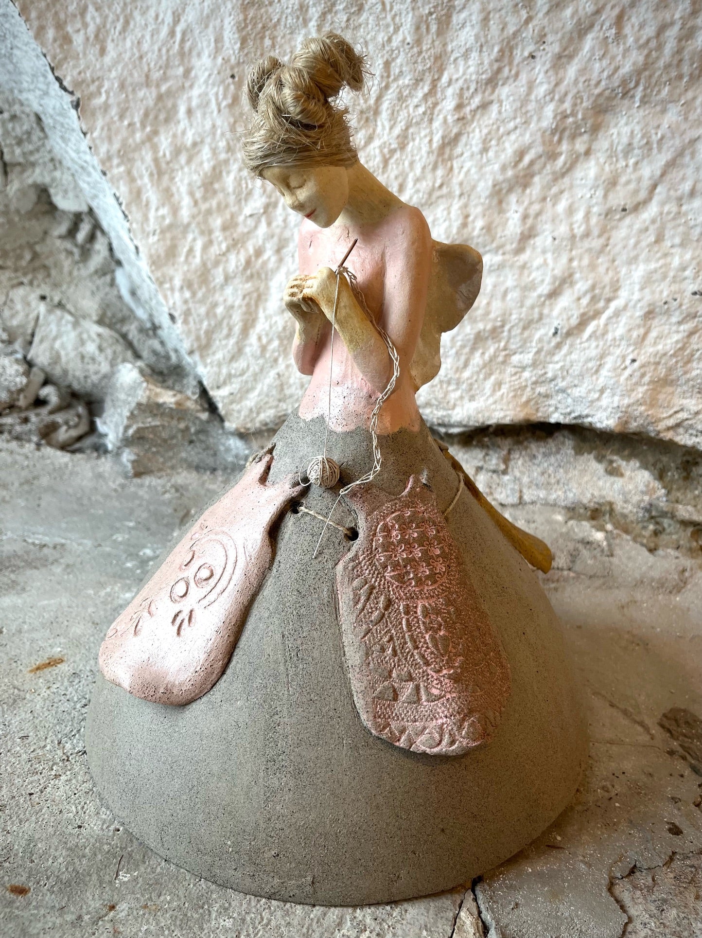 Pyykkipäivä on teema, joka kulkee mukana Maarit Lassilan töissä, pyykkien kuivuessa ehtii vaikka virkata jotain kaunista. Tämä Pyykkipäivä on uusi versio teemasta, se on kivitavarakeramiikkaa ja siinä on pellavalangasta tehty virkkuutyö ja hiukset pellavaa.