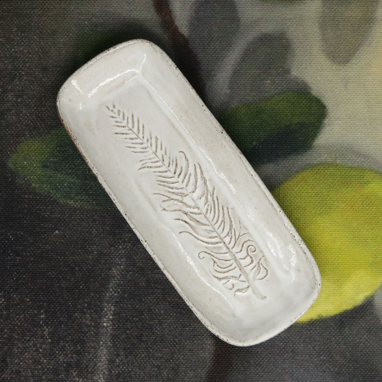 Valkoiseksi lasitettu pieni lautanen jossa on Maaritin kohopainama sulkakuvio. Se sopii hyvin vaikkapa kauhan lepuuttajaksi hellan viereen tai työpöydälle kynien ja siveltimien säilytykseen.