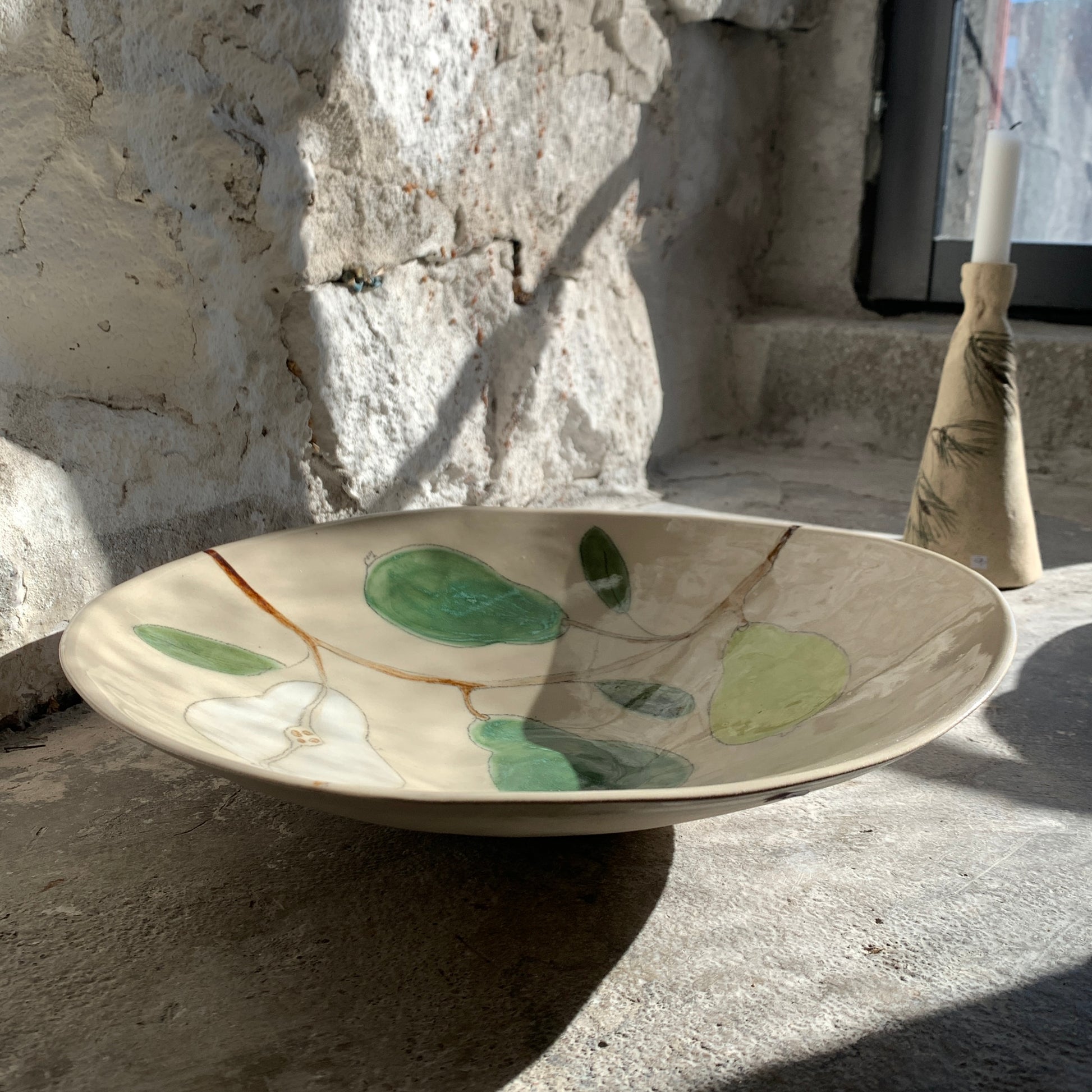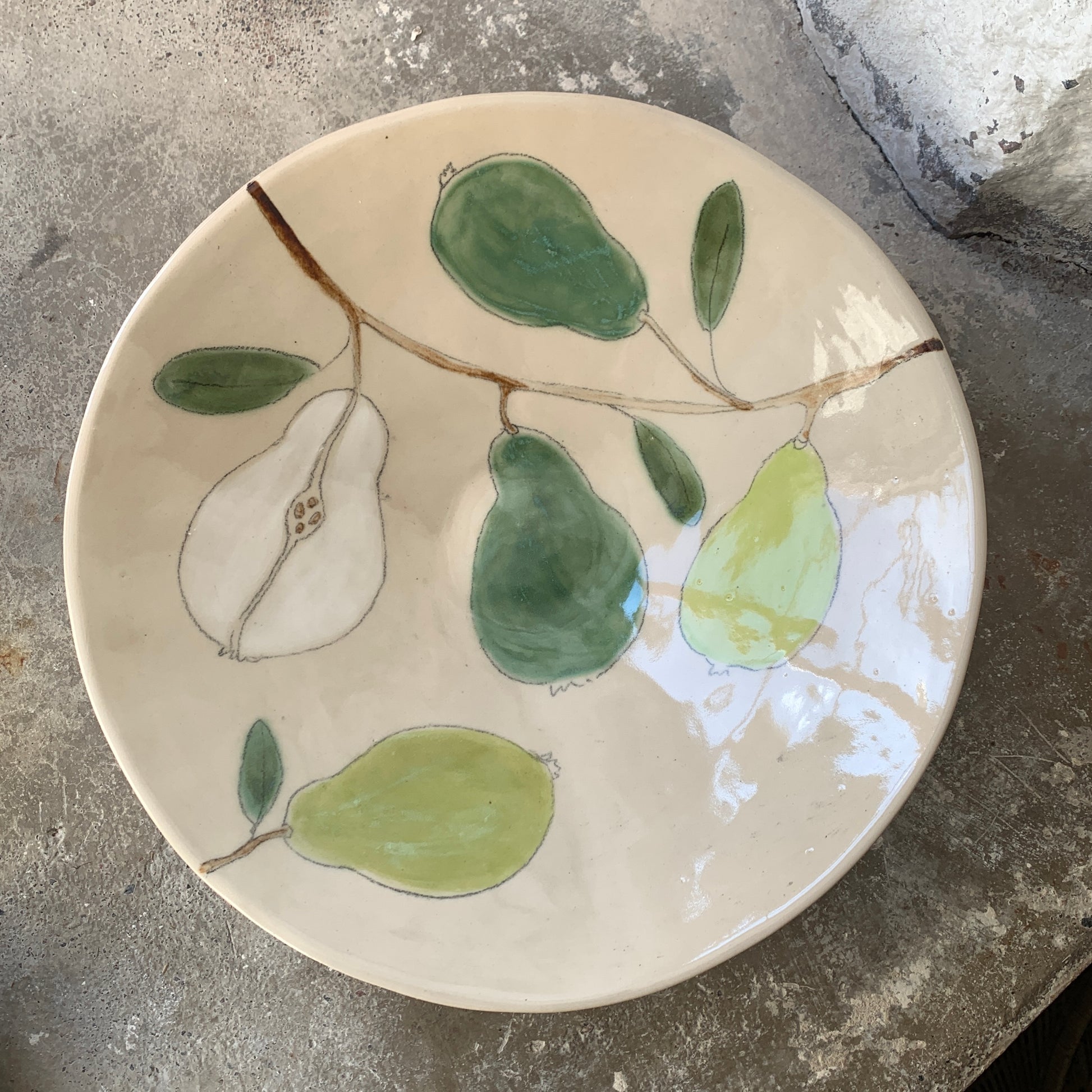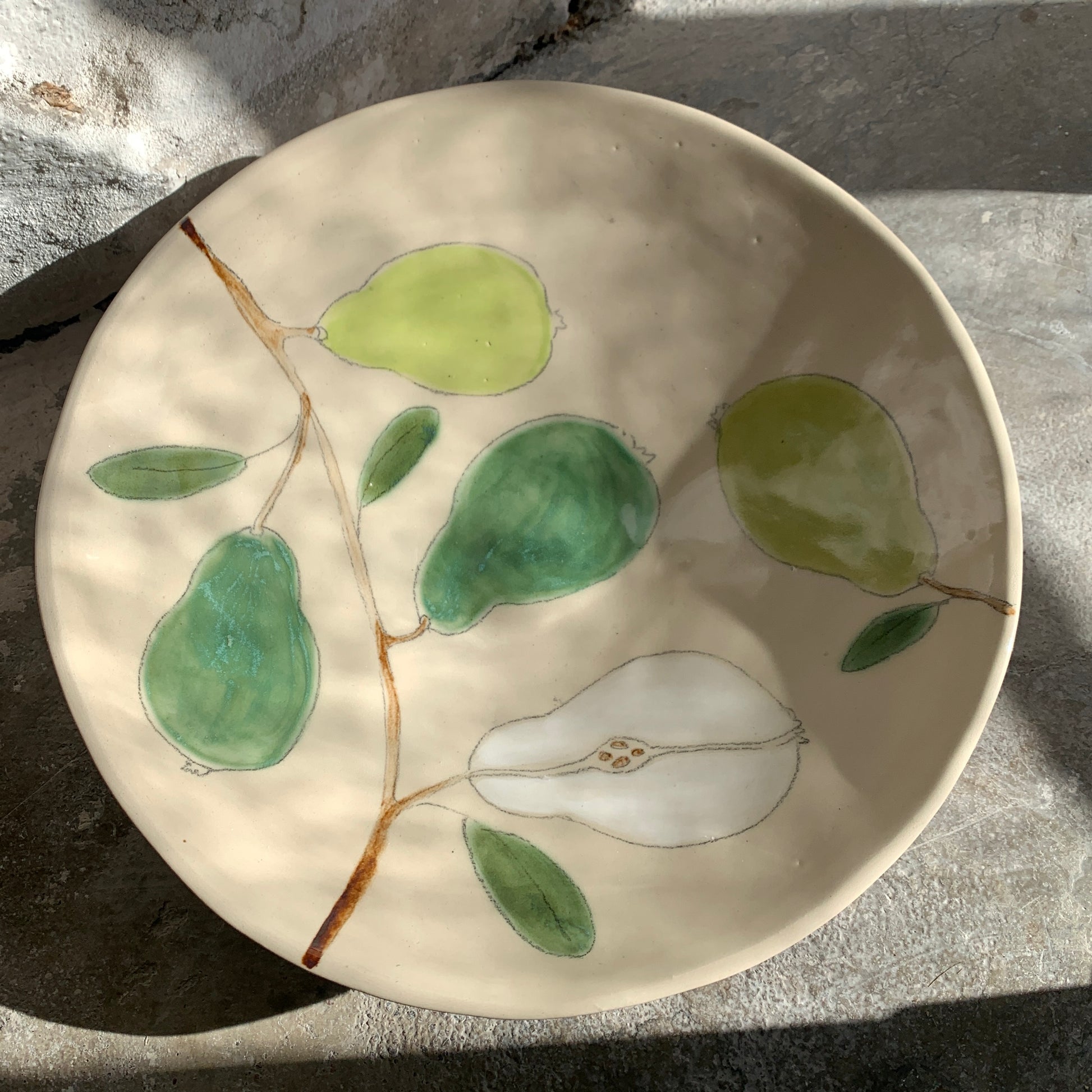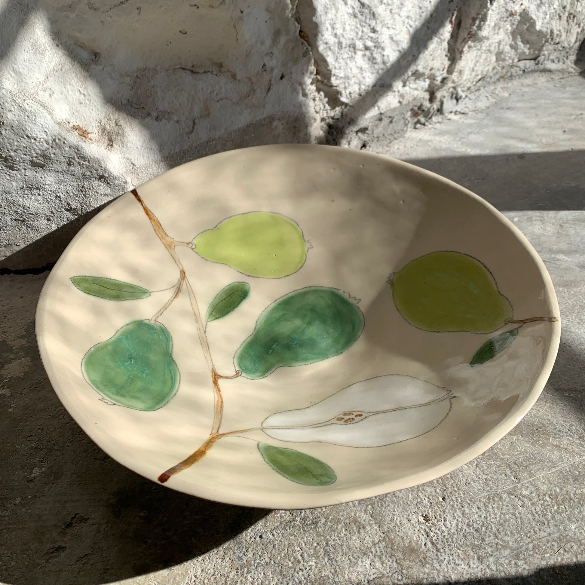 Maarit Lassilan käsin valmistama ja maalaama uniikki, suuri päärynä-tarjoiluvati. Astianpesukoneen, mikron ja uunin kestävä. Lasitettua keramiikkaa.