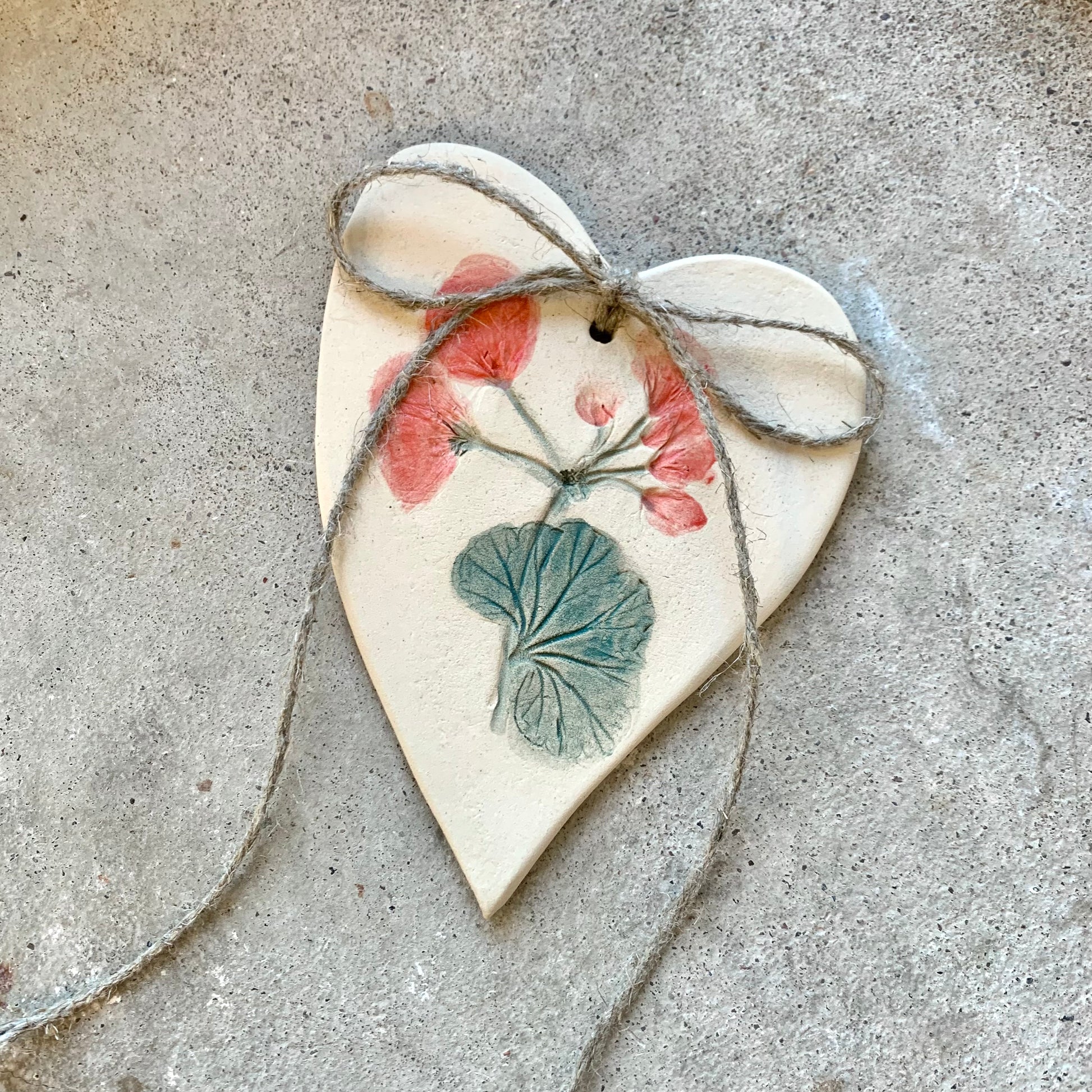 Vaaleasta savesta valmistettu koristesydän pelargonin painokuviolla. Ovea, seinää tai ikkunaa koristamaan.
