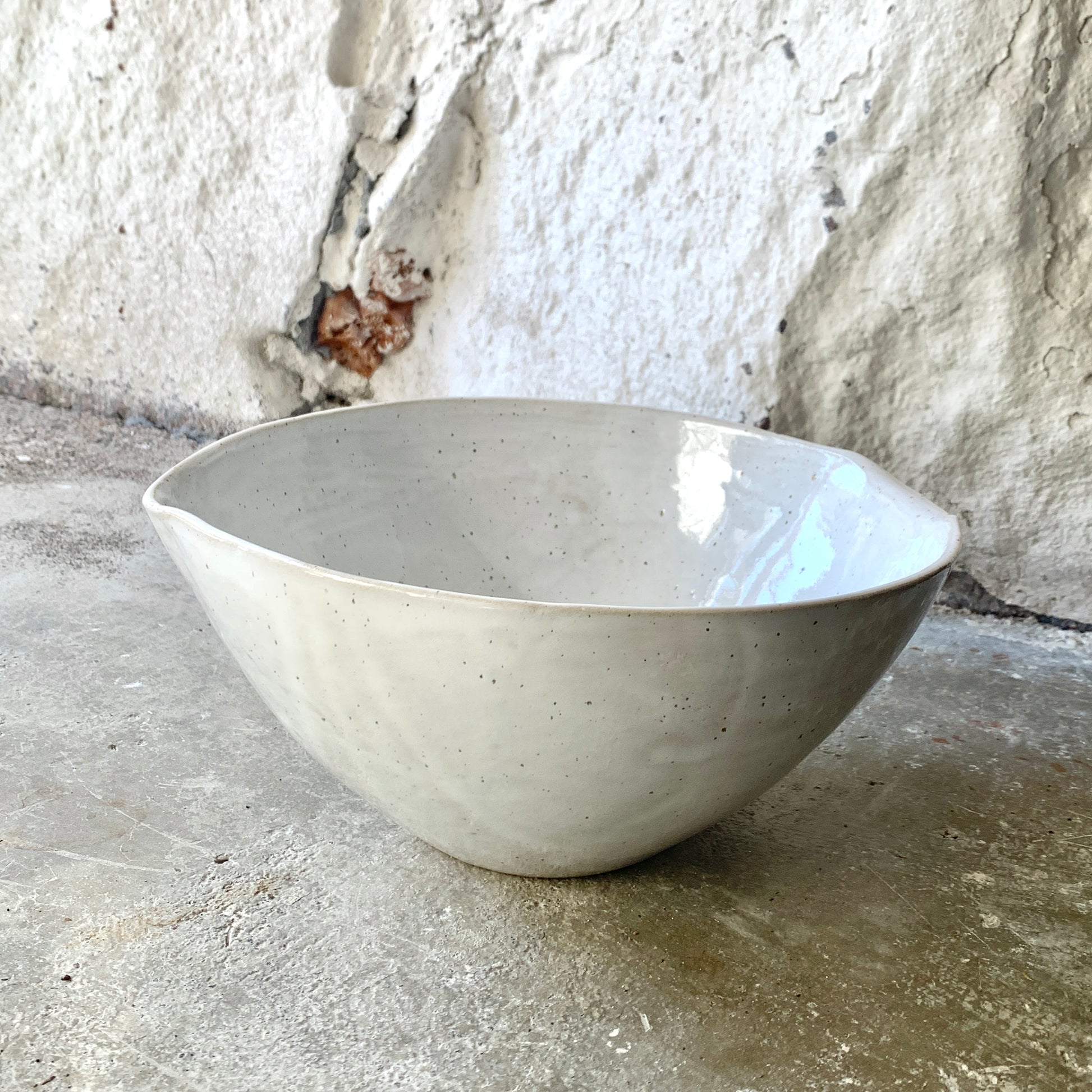 Suuri taikinakulho. Valkoinen lasite ja pilkkusavi. Astianpesukoneen, mikron ja uunin kestävä.