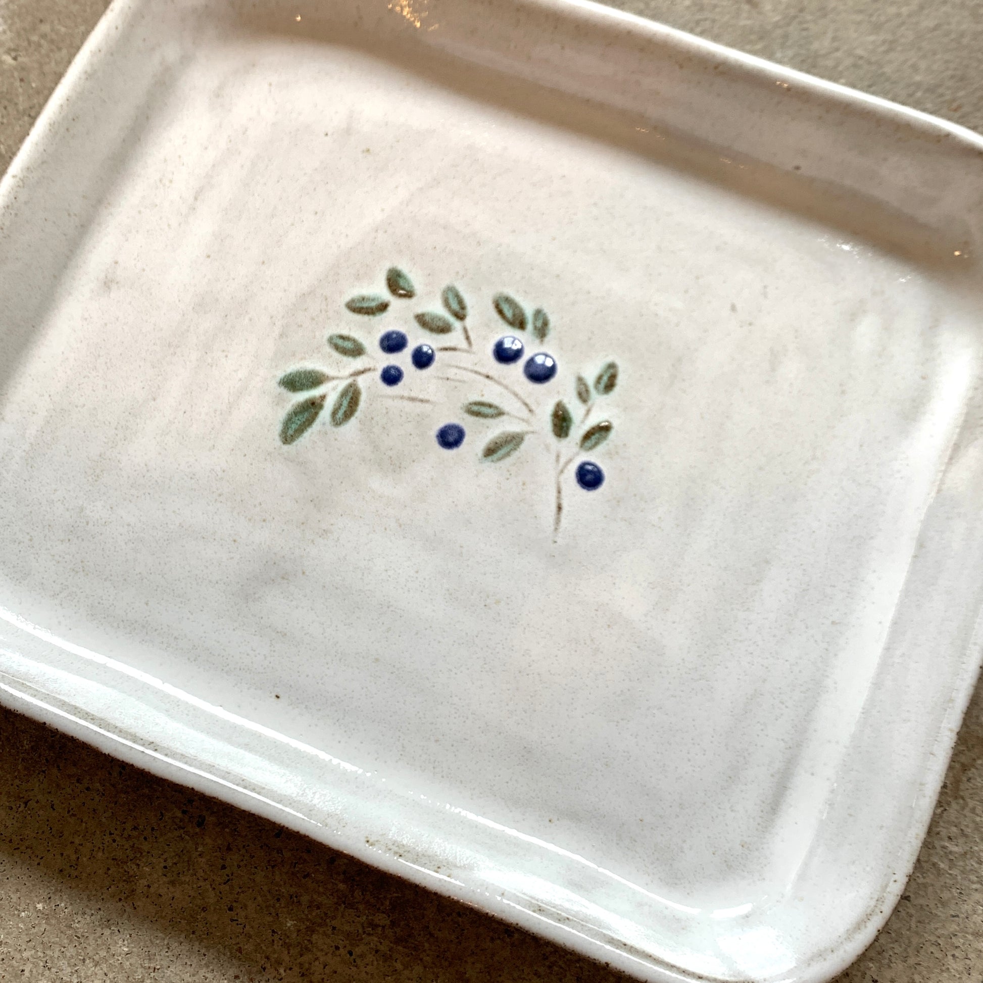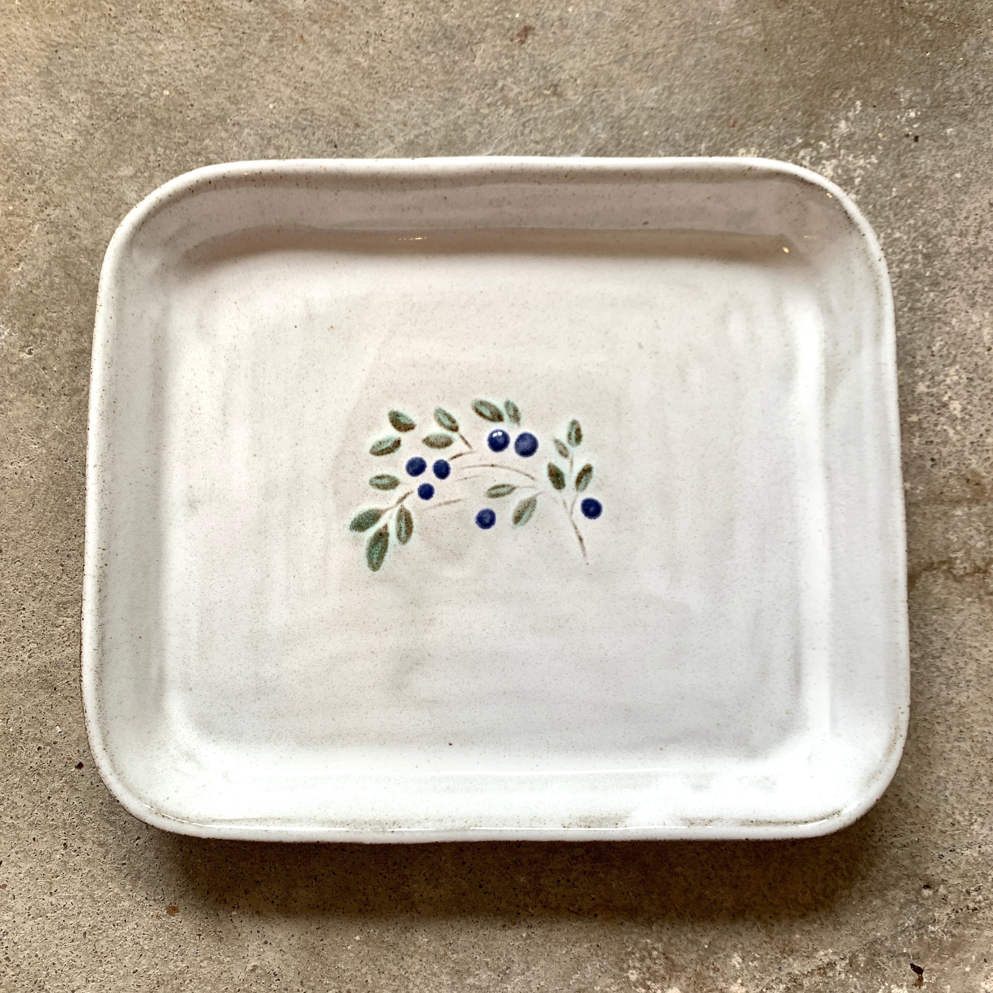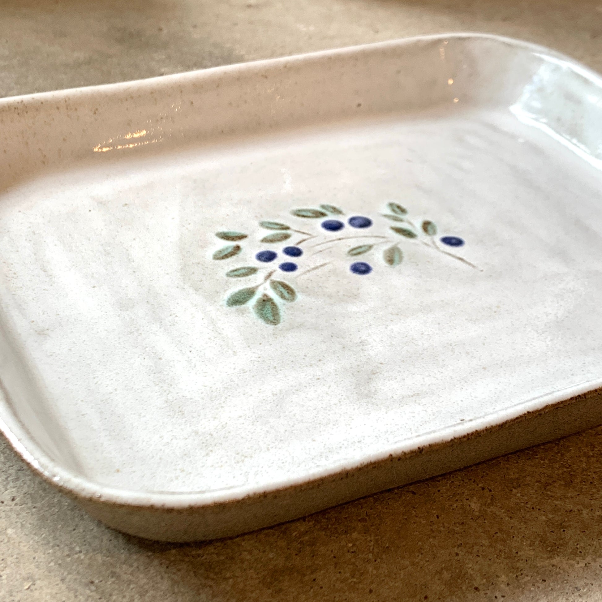 Suorakaiteen mallinen tarjoilulautanen mustikkakuviolla. Uunin, mikron ja astianpesukoneen kestävä.