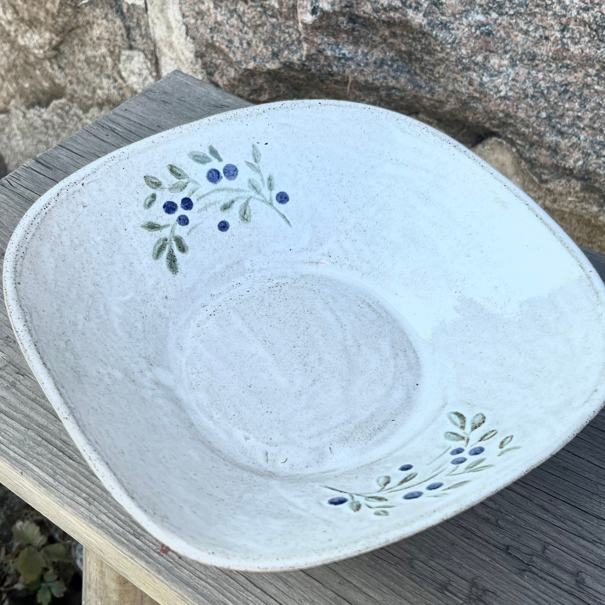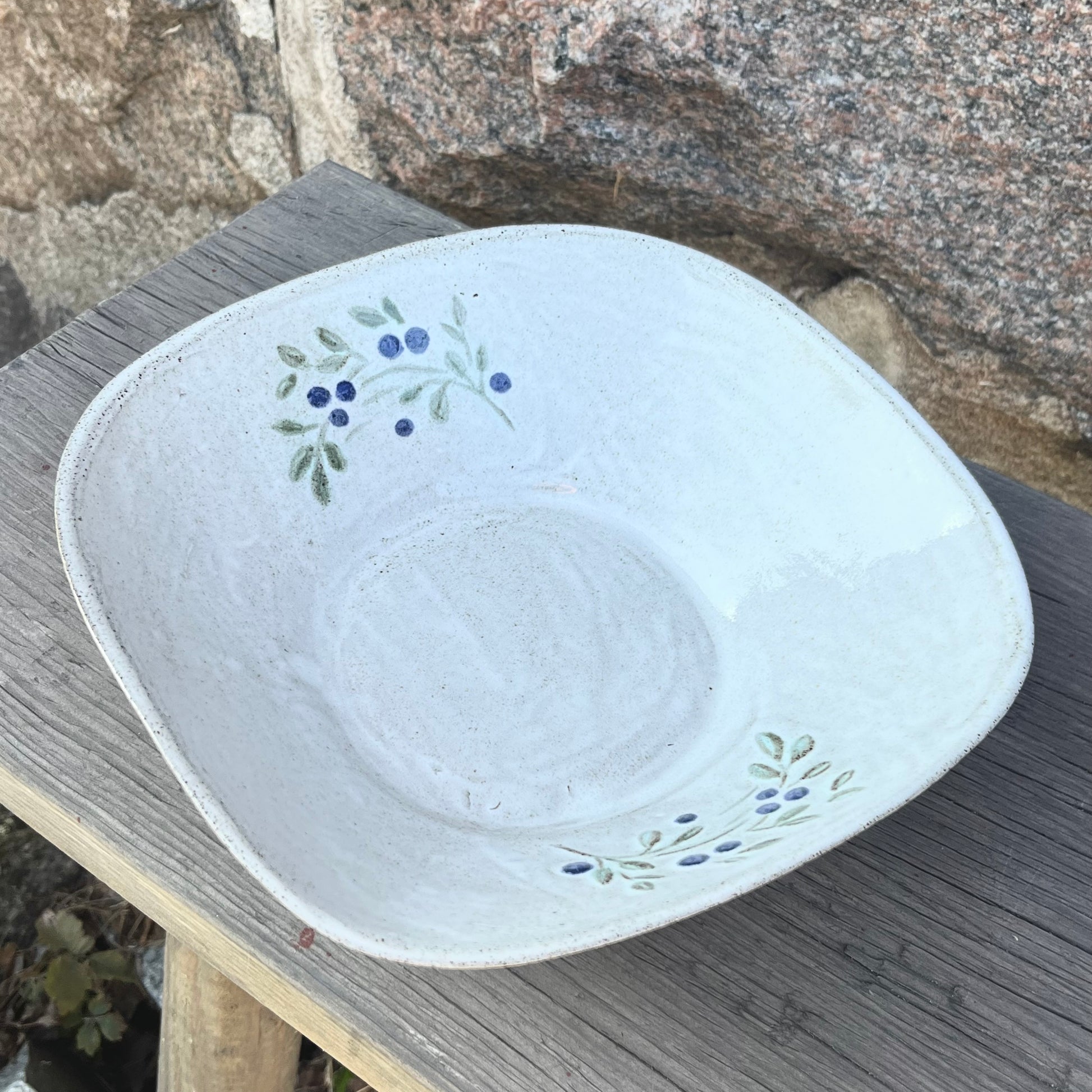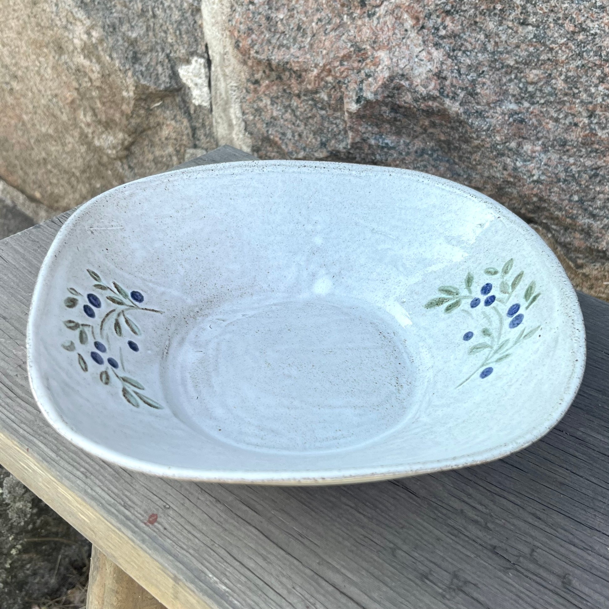 Maarit Lassilan käsin valmistama mustikka-tarjoilulautanen. Astianpesukoneen, mikron ja uunin kestävä. Lasitettua keramiikkaa.