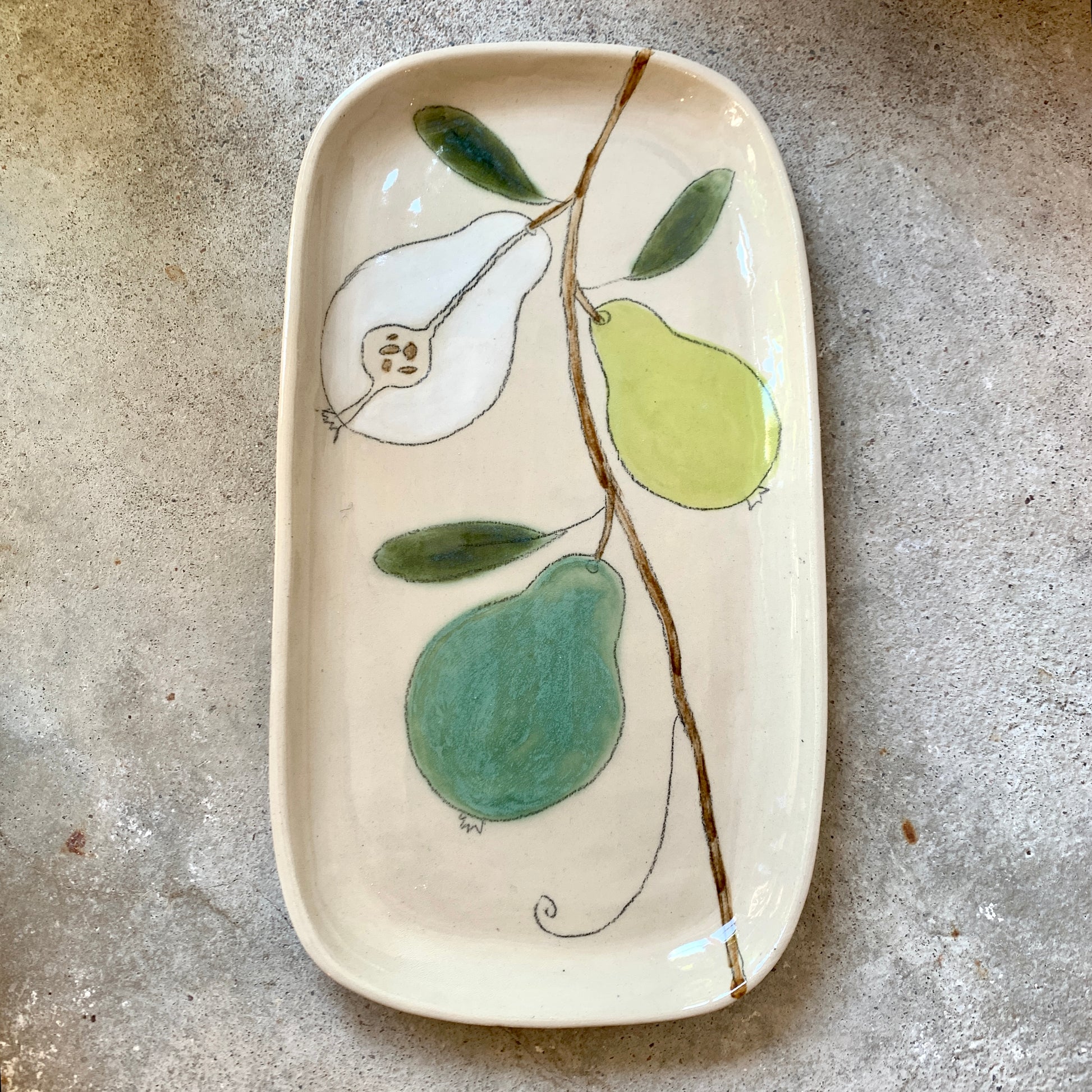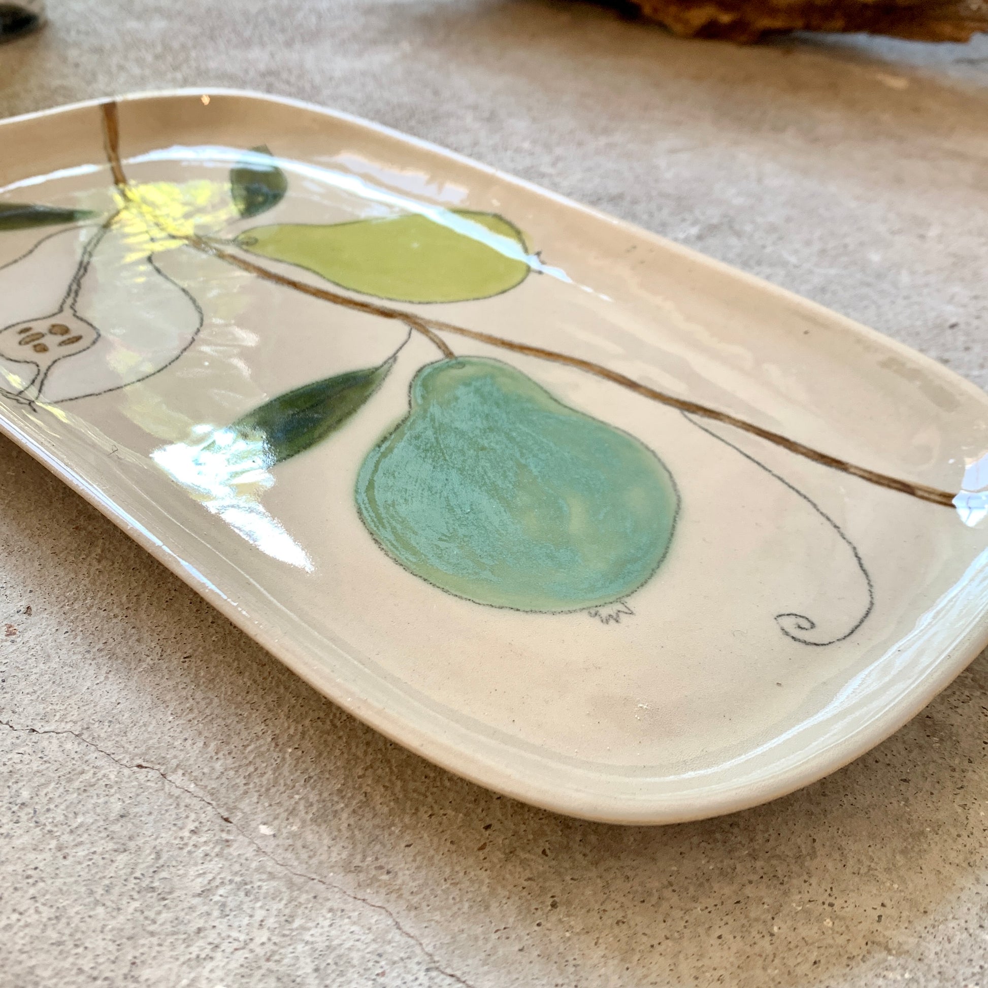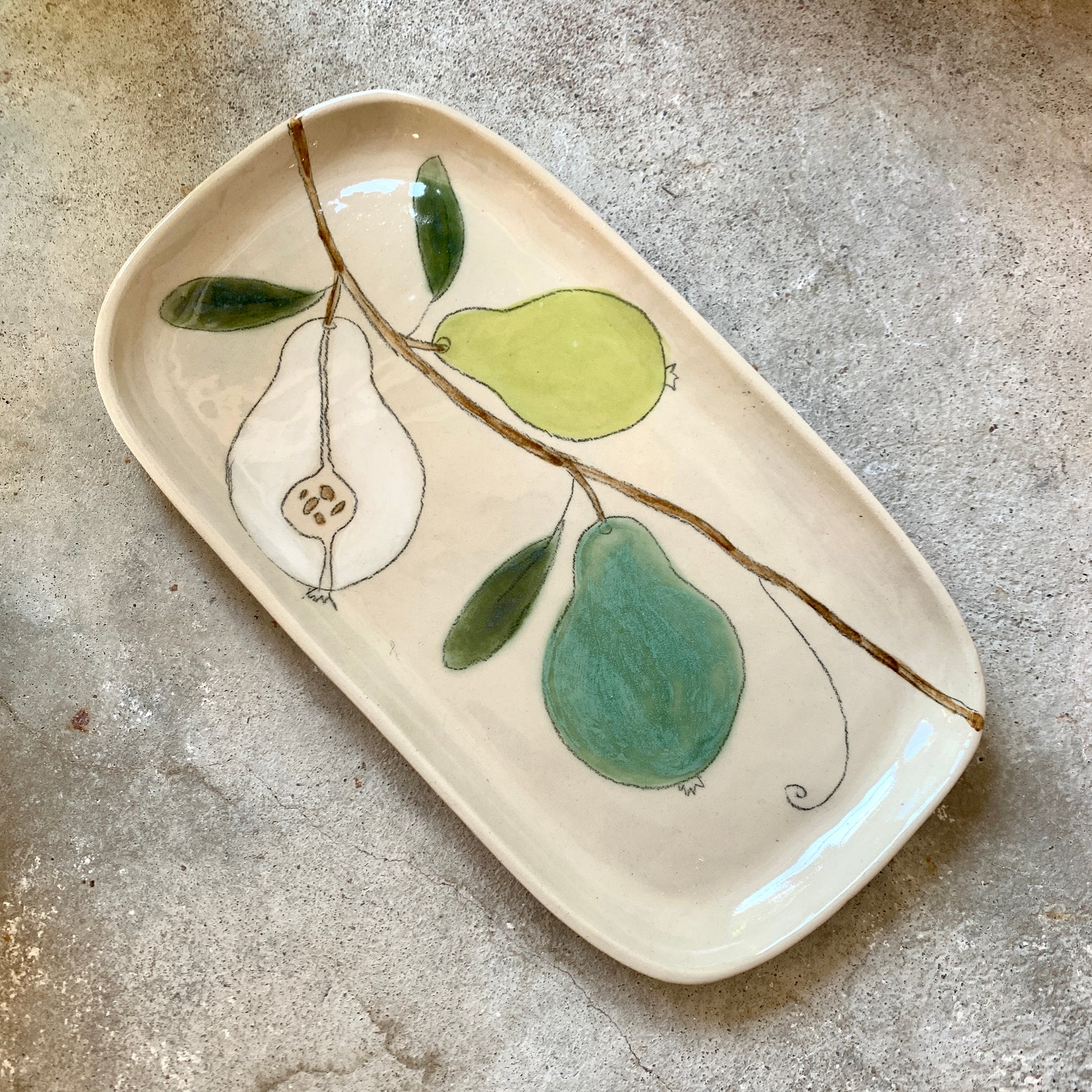 Maarit Lassilan käsin valmistama ja maalaama uniikki päärynäkuvioinen tarjoiluvati. Astianpesukoneen, mikron ja uunin kestävä. Lasitettua keramiikkaa.