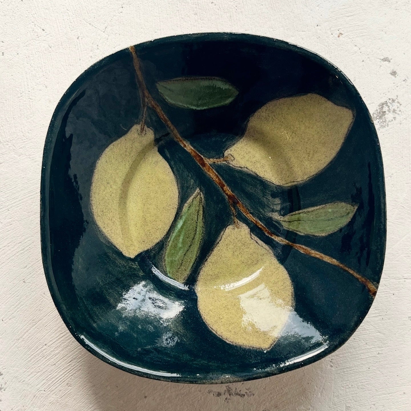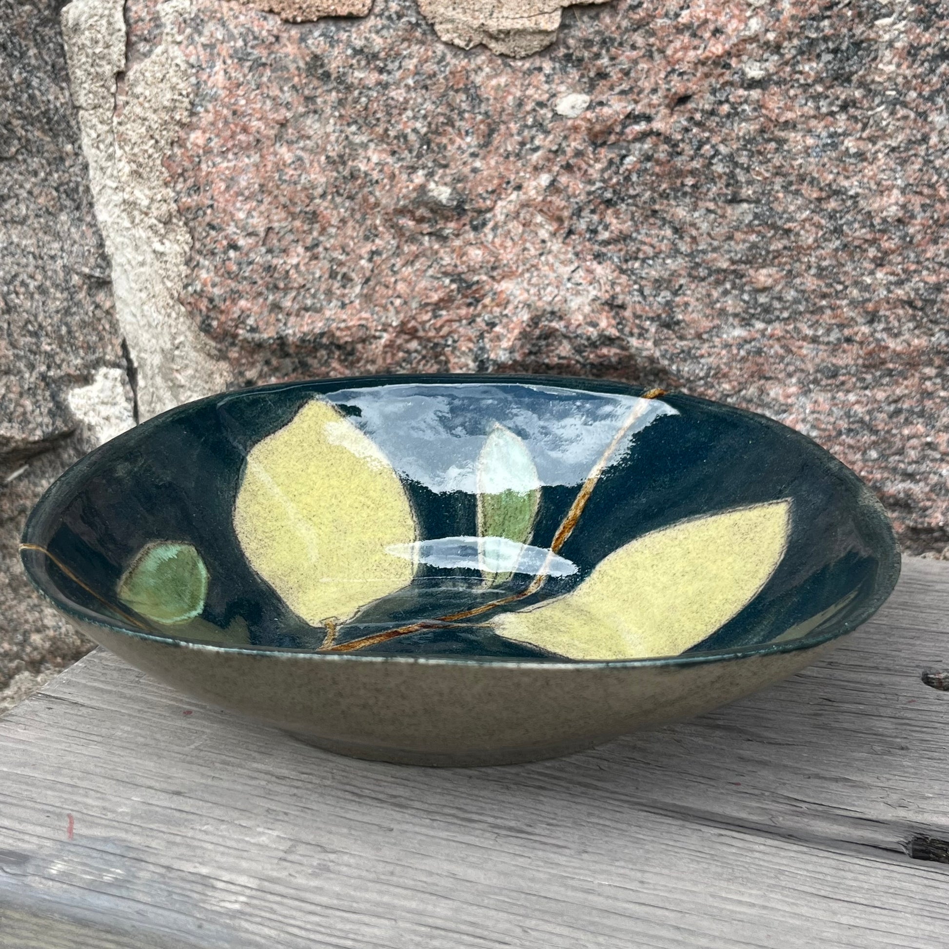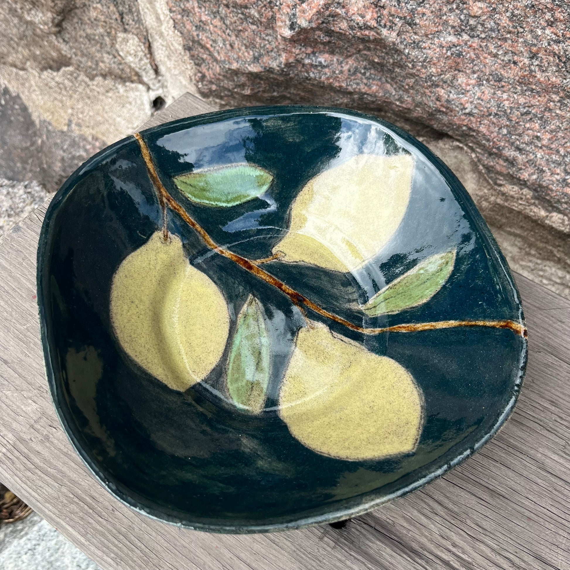 Maarit Lassilan käsin valmistama ja käsin maalaama sitruuna tarjoiluvati. Astianpesukoneen, mikron ja uunin kestävä. Lasitettua keramiikkaa.