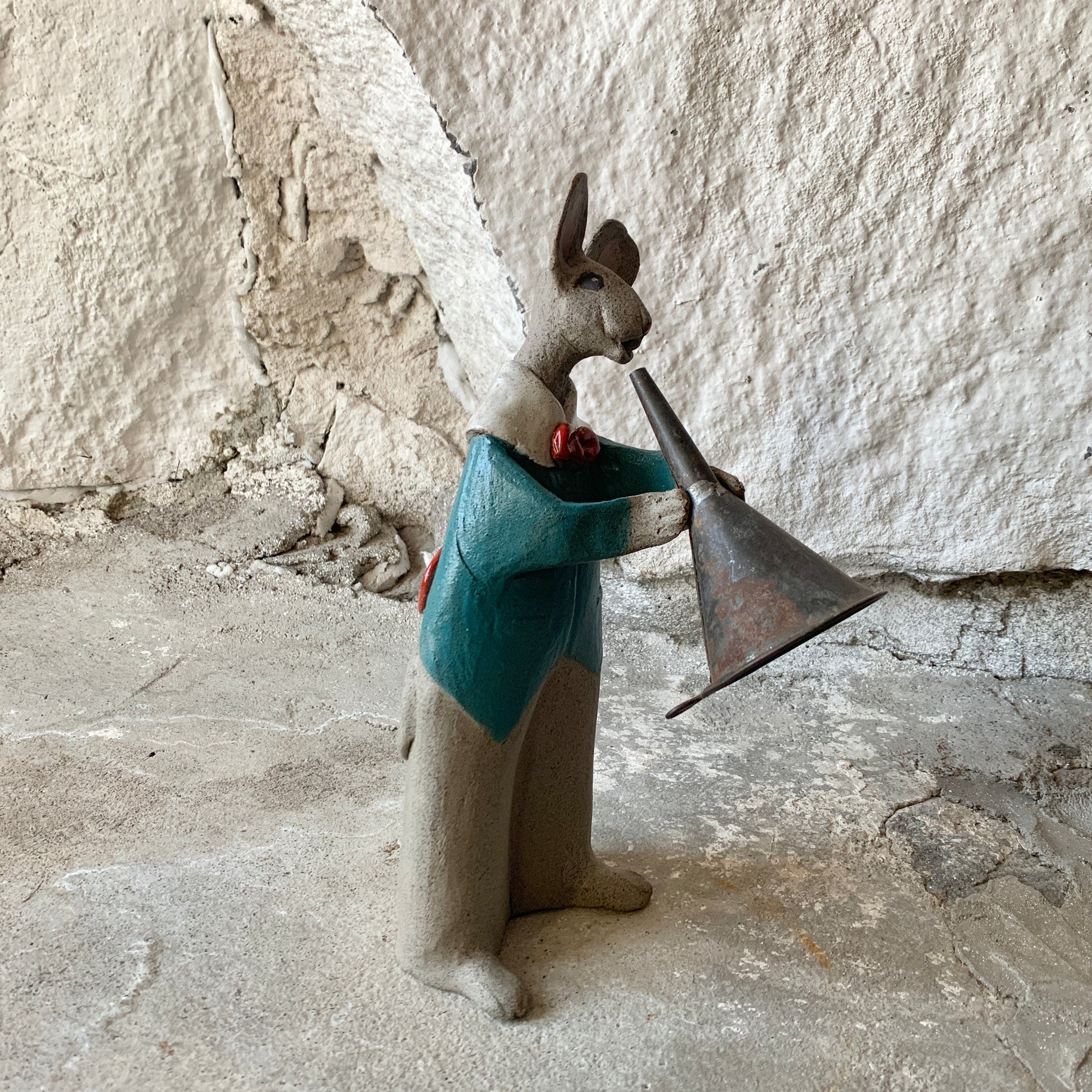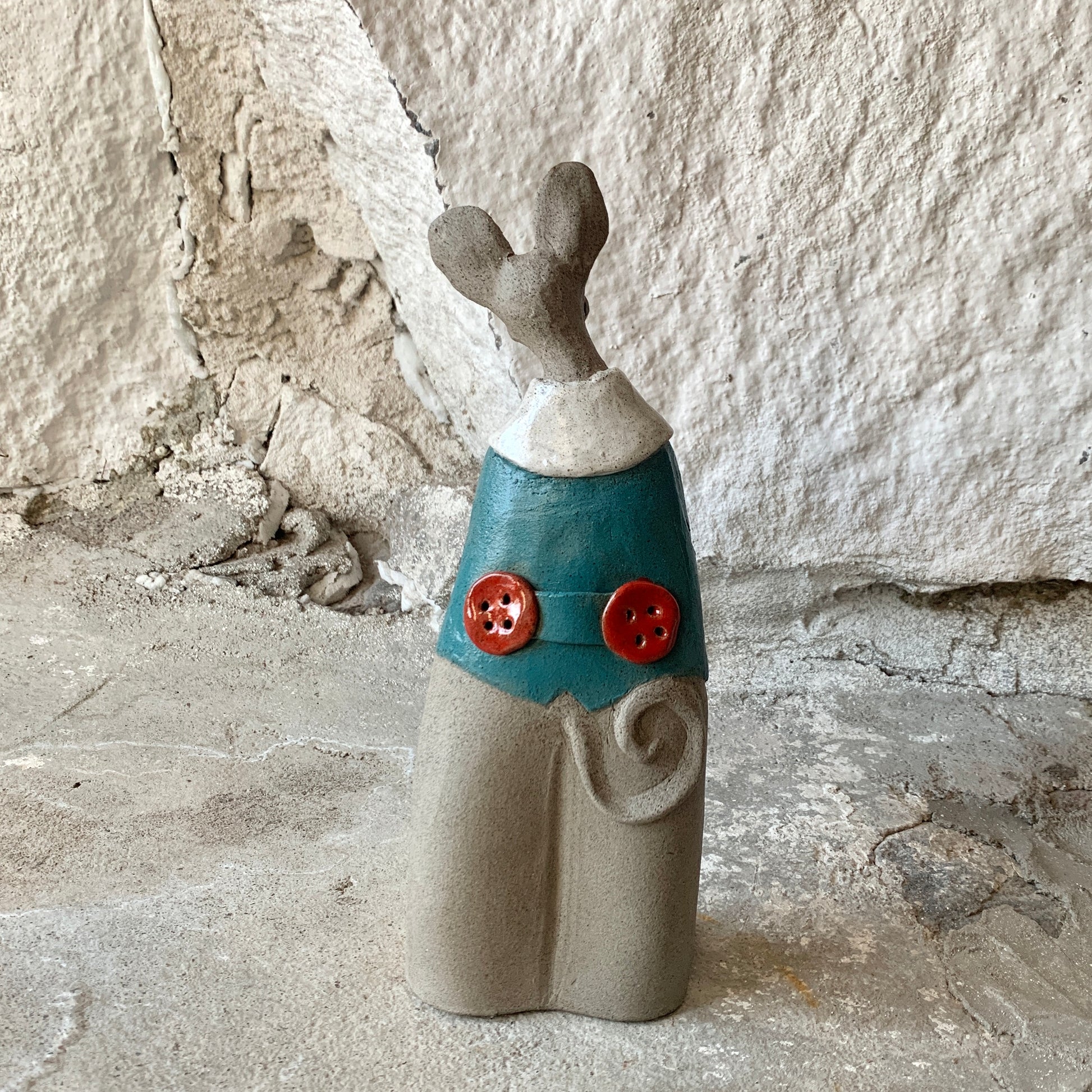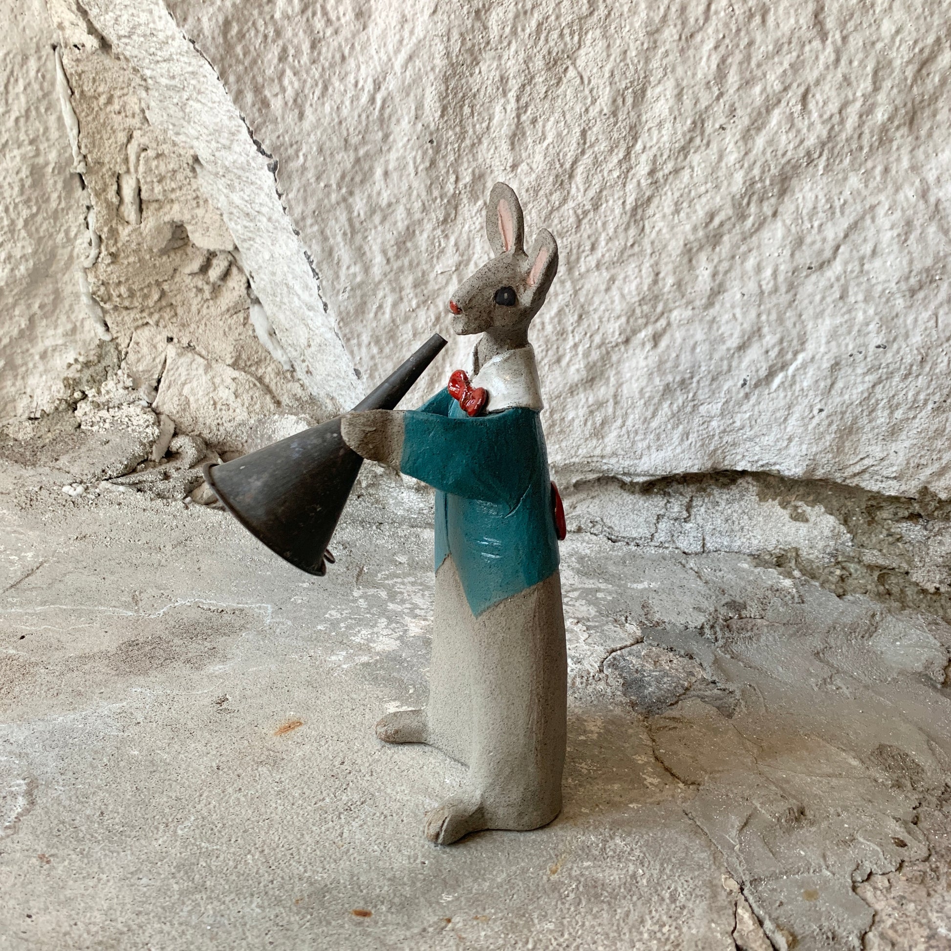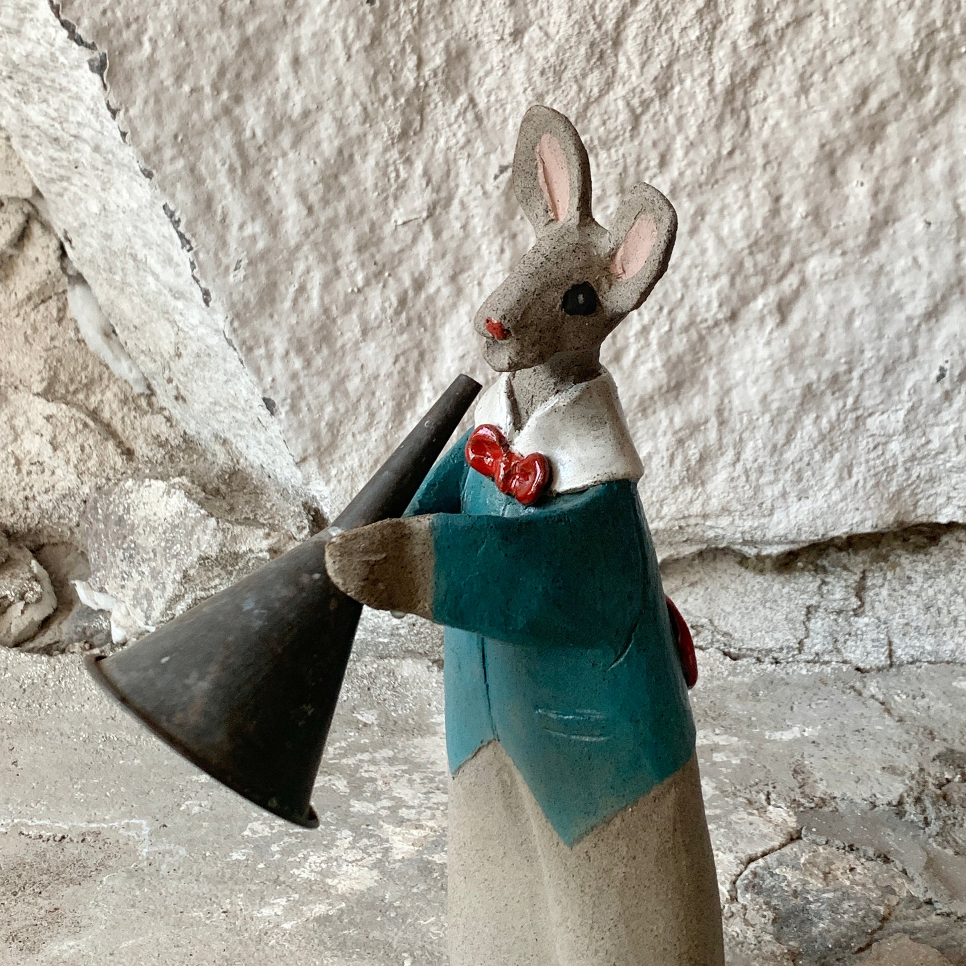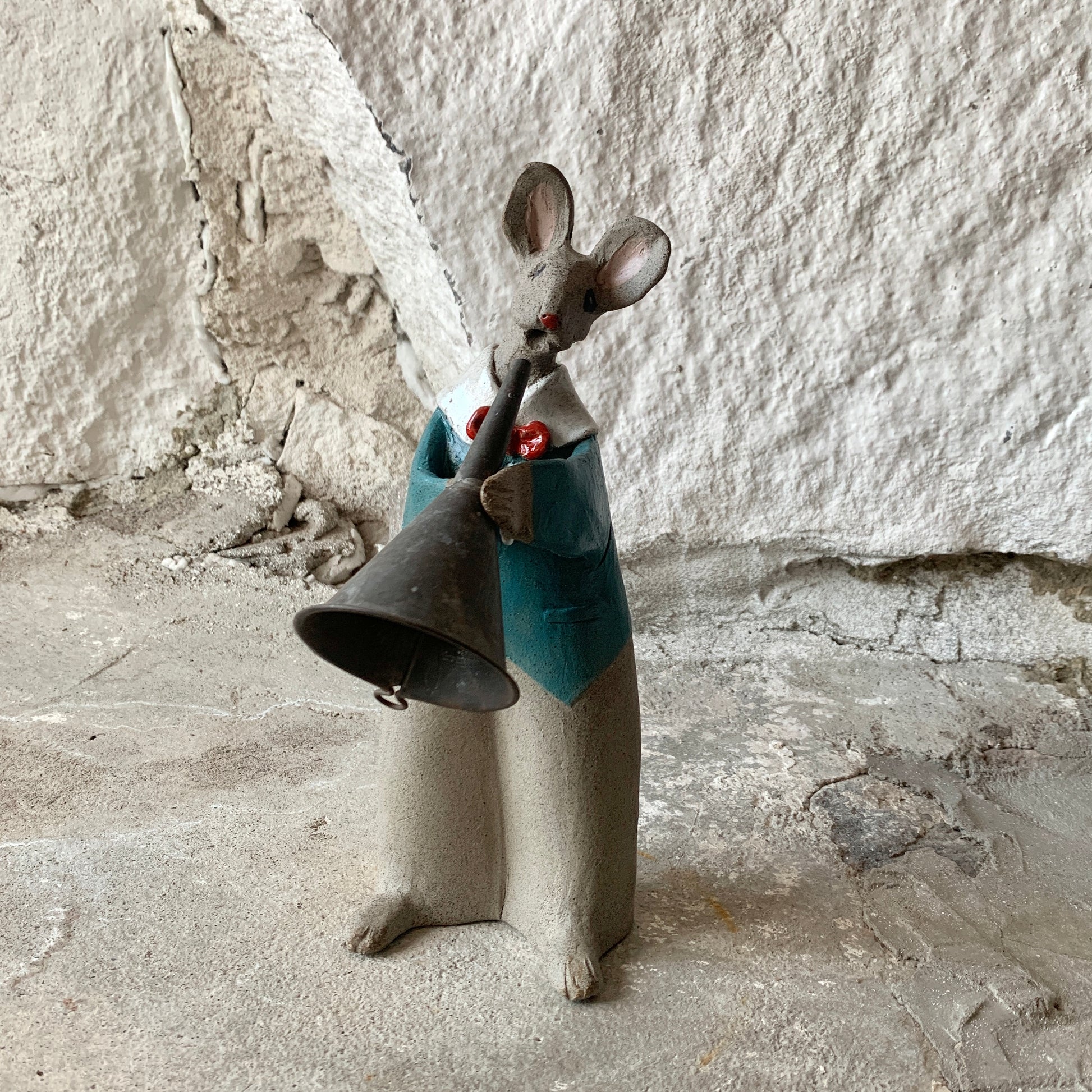 Maarit Lassilan uniikki keraaminen torvensoittaja hiiriveistos.